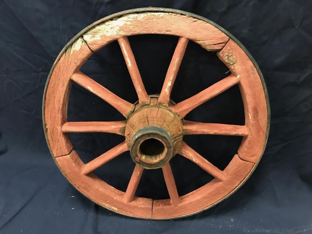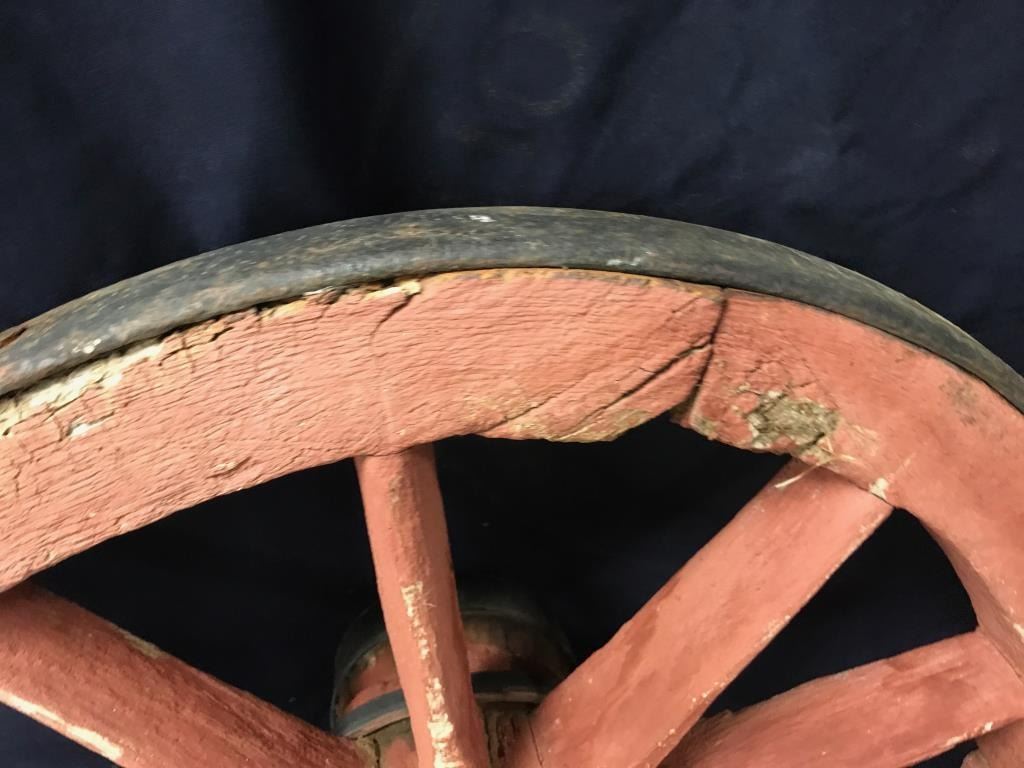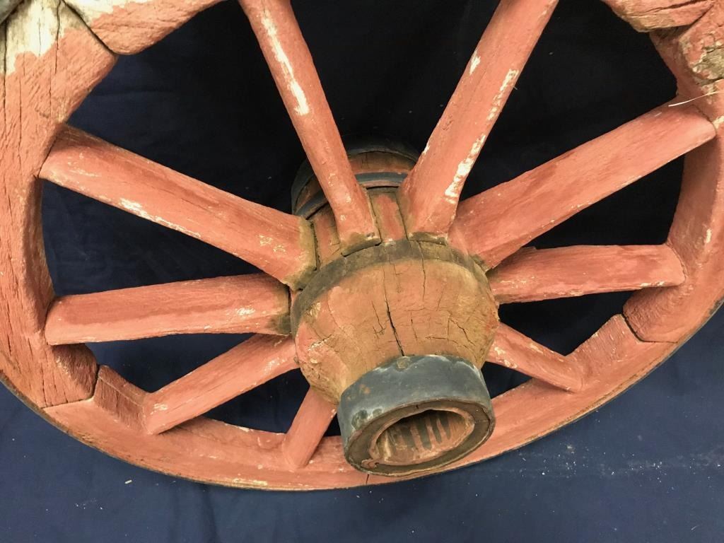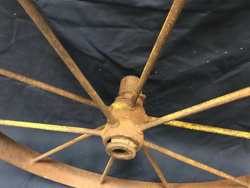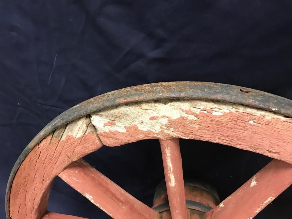 Lot of 3 weathered wagon wheels; 2 all iron and approximately 30” in diameter; 1 wooden and also approximately 30” in diameter; would make great decorators! Est.: $175-$350.