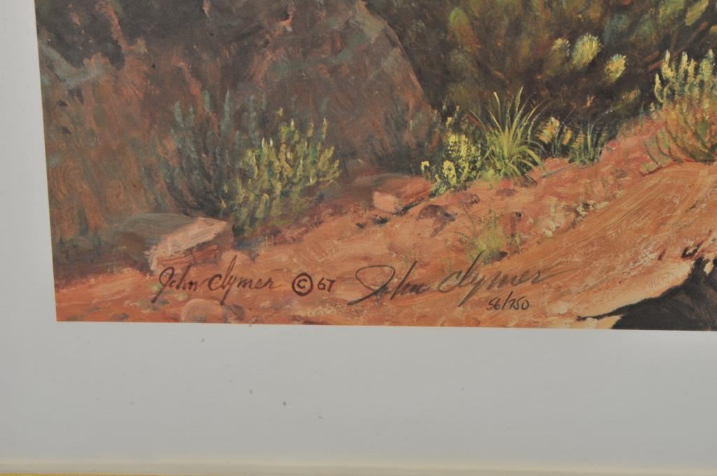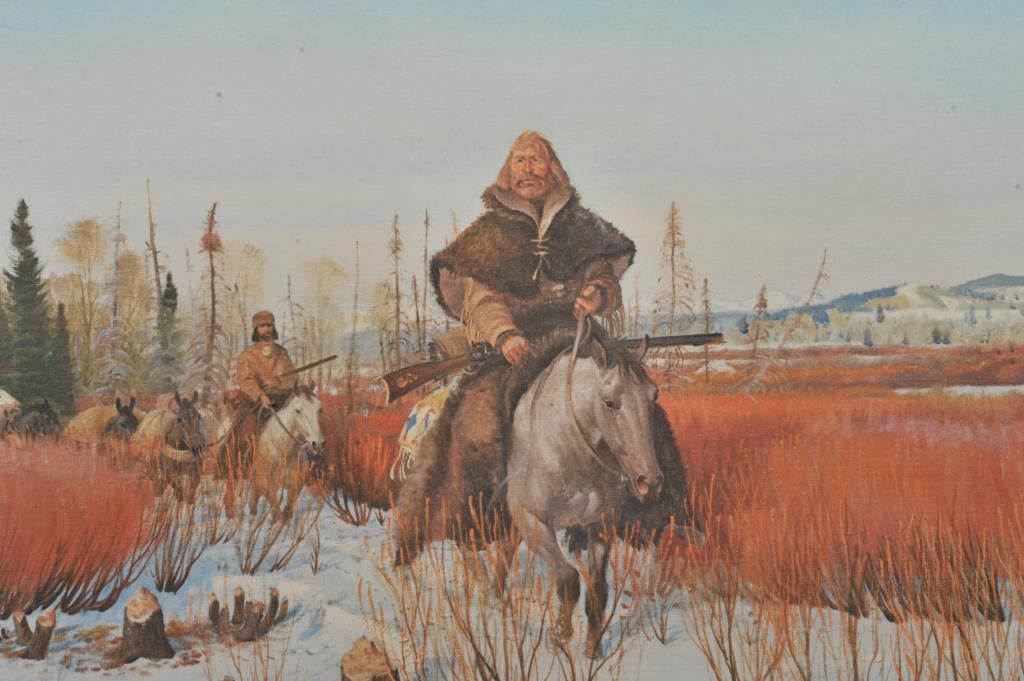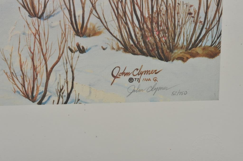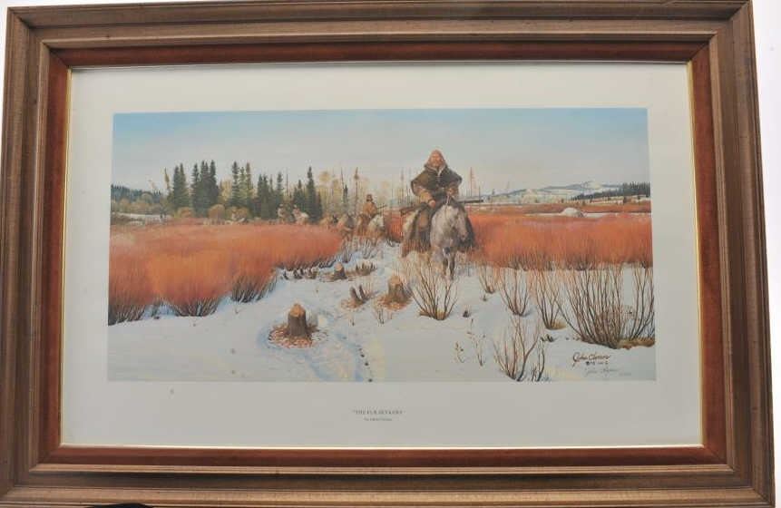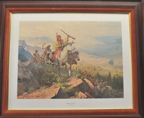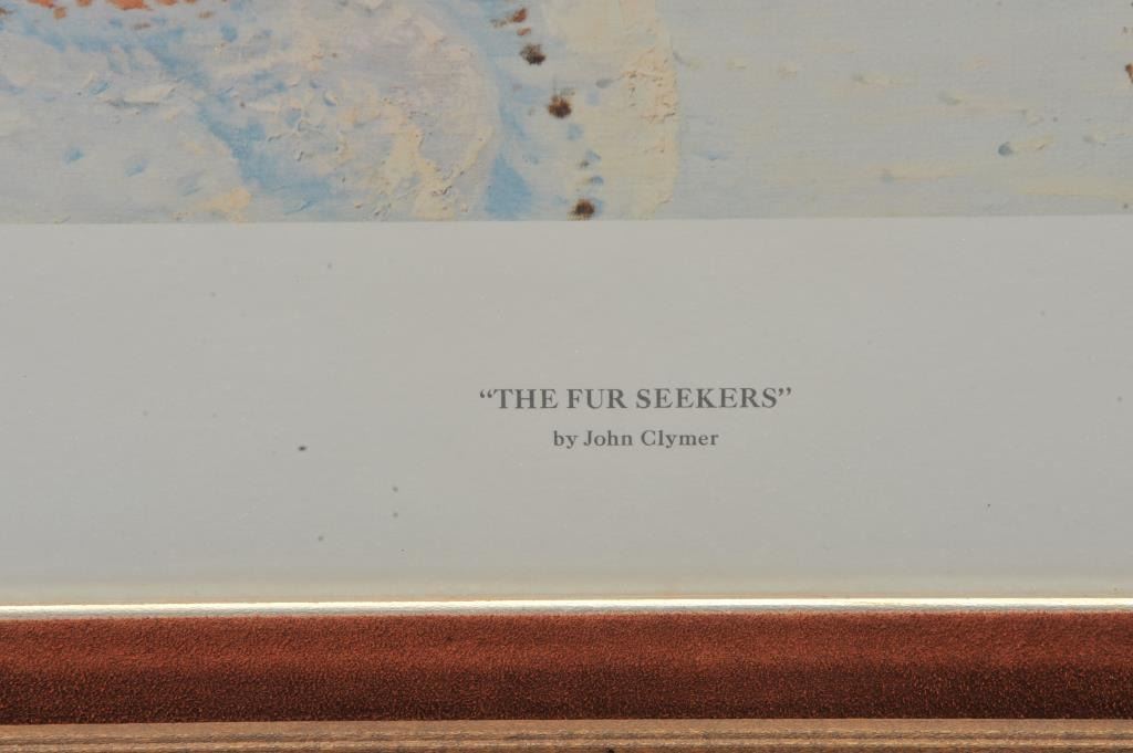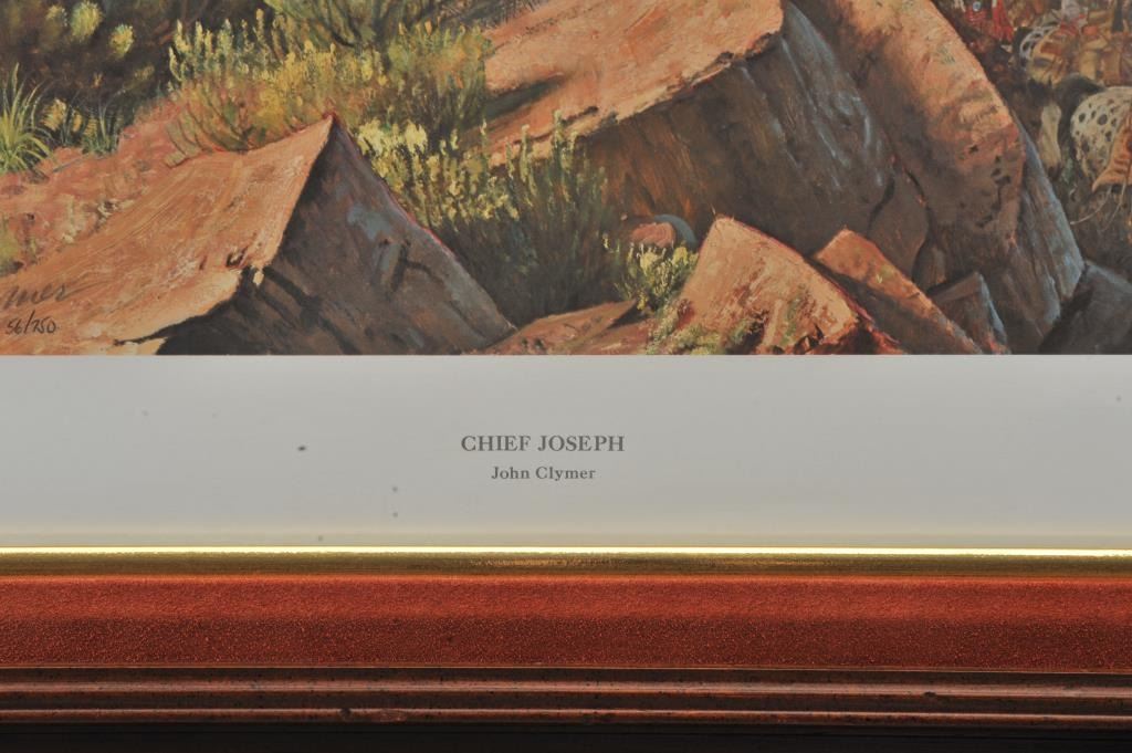 Lot of two John Clymer framed and matted numbered prints. The lot includes: “THE FUR SEEKERS”, measuring 32” x 16”, artist signed in the bottom right corner and numbered 52/750. The 2nd print is “CHIEF JOSEPH”, 19½” x 26”, also artist signed and numbered 56/750. Both pieces are nicely framed in dark wood. John Clymer was a noted American Western artist. Clymer died in 1989. Est.: $200-$400.