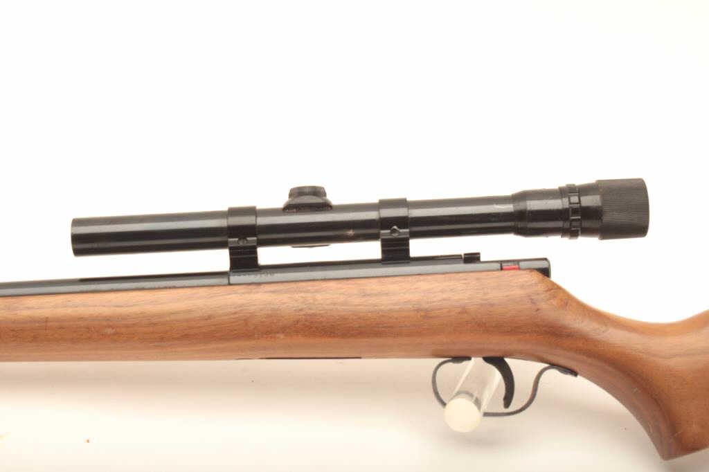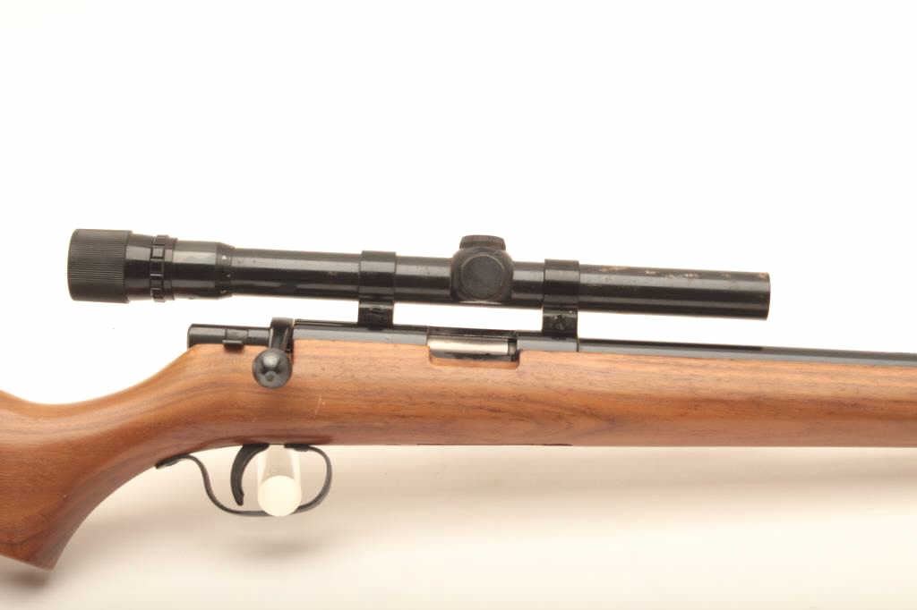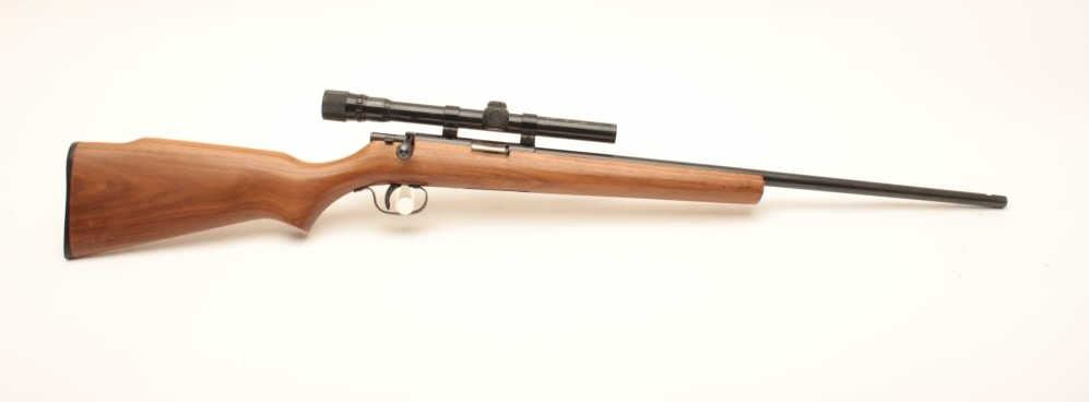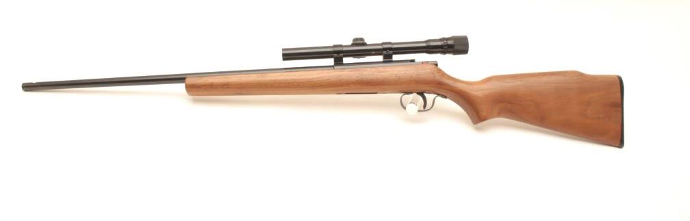 North American Arms Grizzley No.10 bolt action rifle, .22 caliber, Serial #5130. The rifle is in good overall condition with a 22” barrel with the front and rear sights removed. The metal surfaces retain themajority of their blue finish with handling marks. The smooth wood stock is in good condition with small mars and compressions from carry and use. The rifle is topped with a Weaver V-22A variable power scope. Therifle is missing the magazine. The bore is good, the action is crisp and markings are sharp. Est.: $50-$100. (Modern).