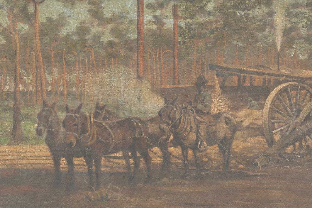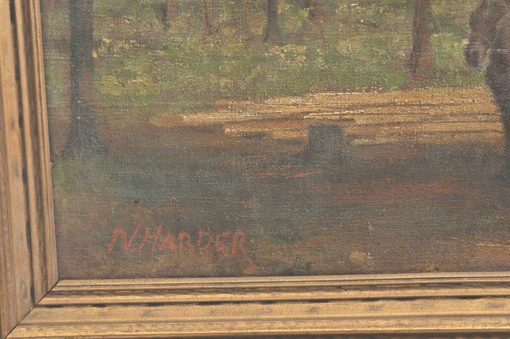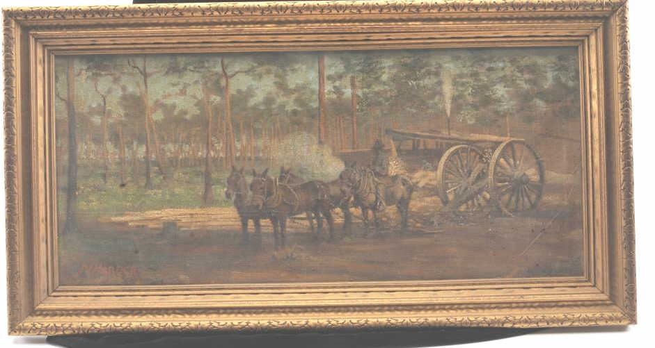 Painting on Canvas by N. Harder of Horses and Wagon. needs repair. Est:$150-300