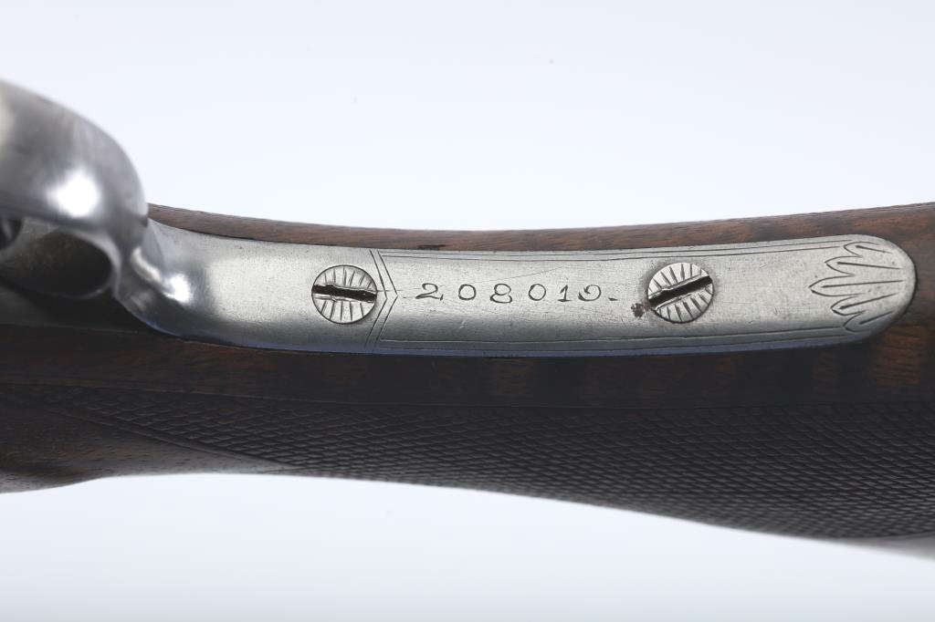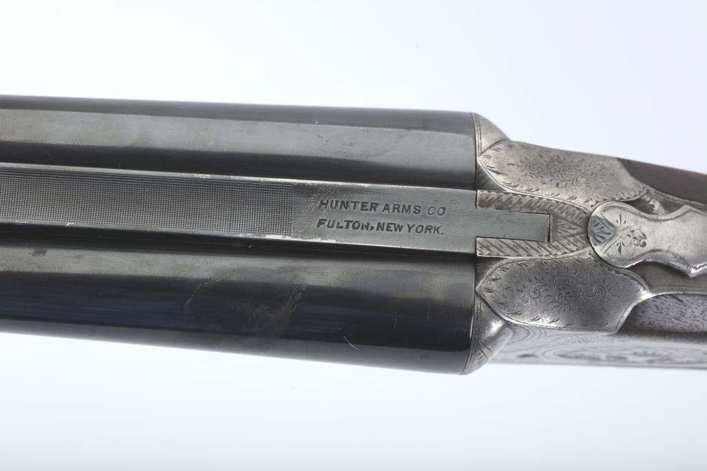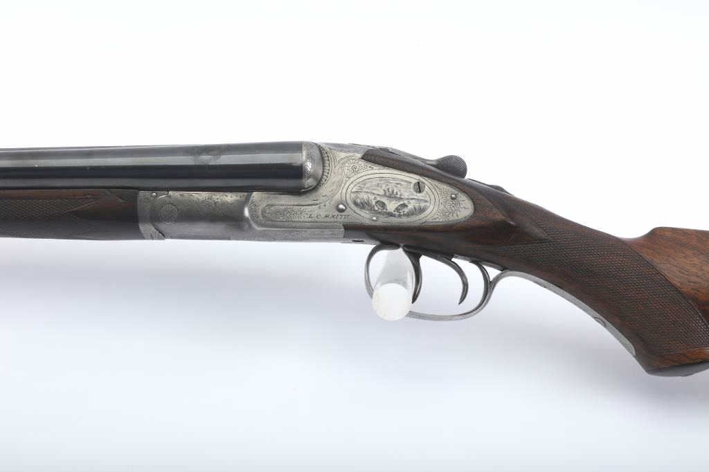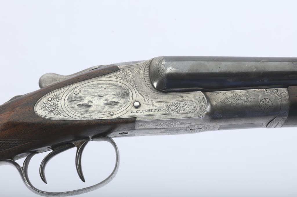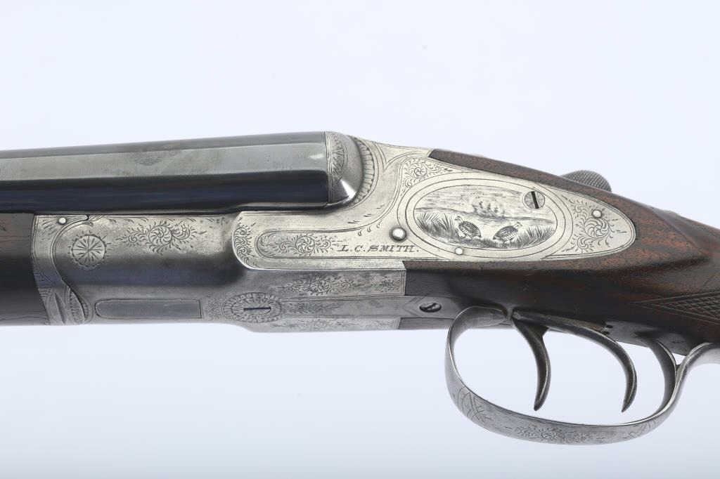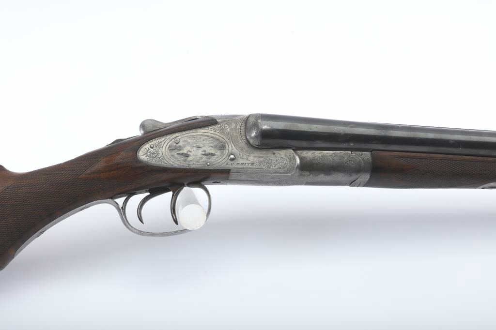LC Smith Specialty grade SxS shotgun, #208019, 20 Ga., 30" solid rib barrels marked Hunter Arms Co, Fulton New York with fine file on the rib,double triggers, and auto ejectors. The receiver has scroll engravingwith a game scene of two quail on the left lock plate, and a waterfowl scene on the right. The deluxe checkered walnut stock with rubber recoil pad is in very good condition, measuring 13 3/4" to the end of the wood, 14 3/4" to the end of the pad. Barrels have been refinished, two screws to tighten the rib. Choked Cyl and Cyl. Bores are good, action is good. (C&R) Est. $1000-2000