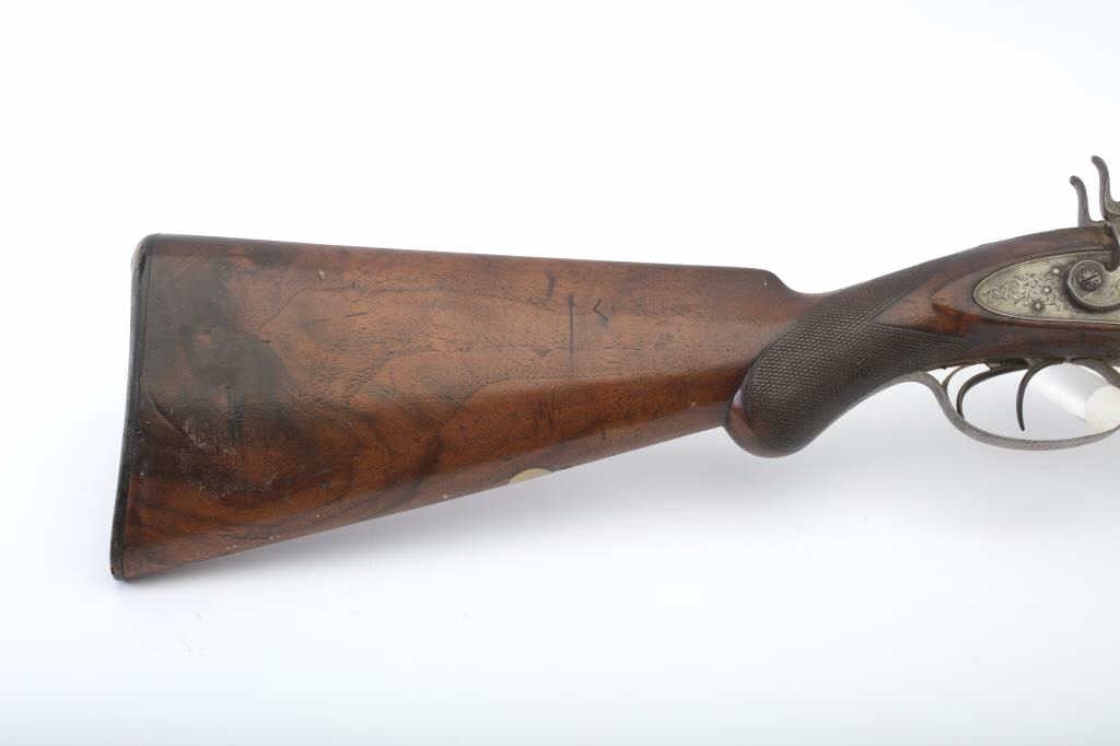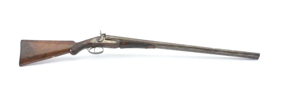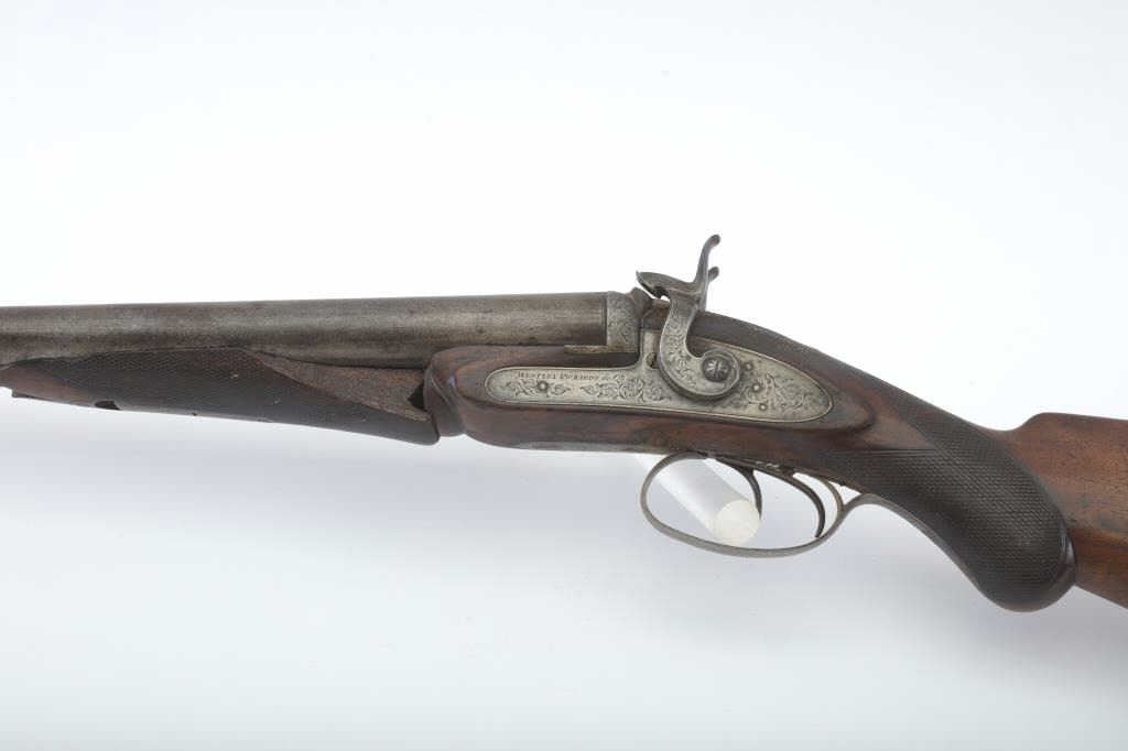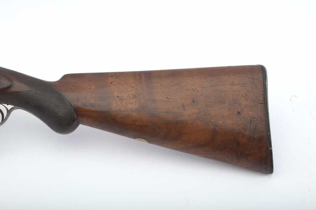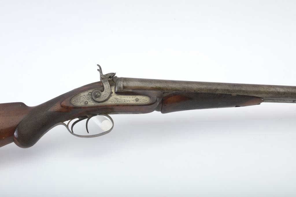 Early Westley Richards Bartwood transitional cartridge shotgun in 10GA with 30” barrels, S/N 4246. Closely resembles percussion shotgun. The release lever is mounted at the top of the action behind the hammers ismissing. The fore end shows a large “Chunk” of wood missing. A couple of dings in the barrel otherwise fair to good overall. Actions working. A rare type needing restoration. Est.: $500-$1000