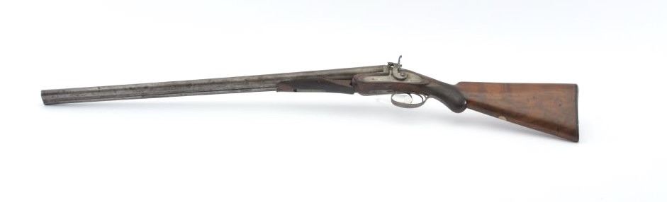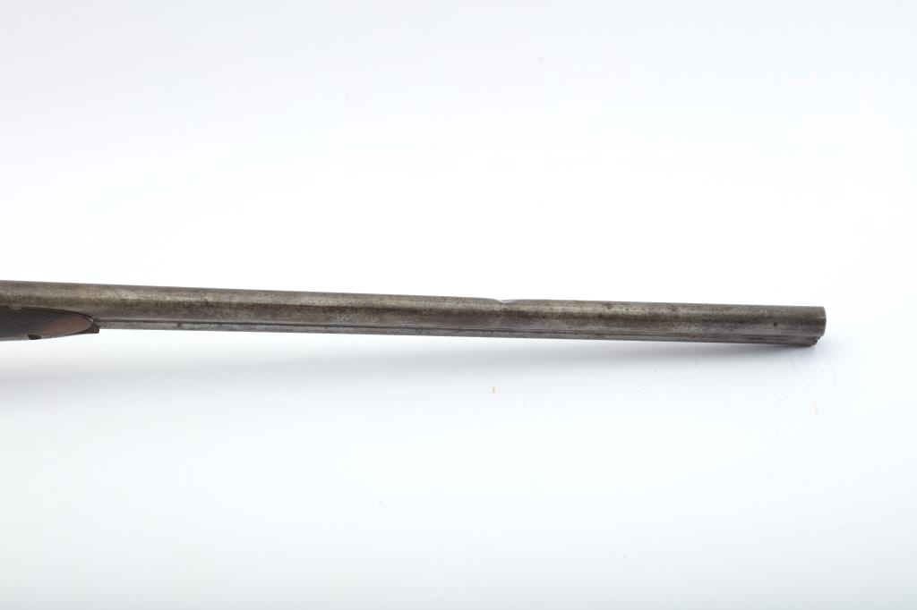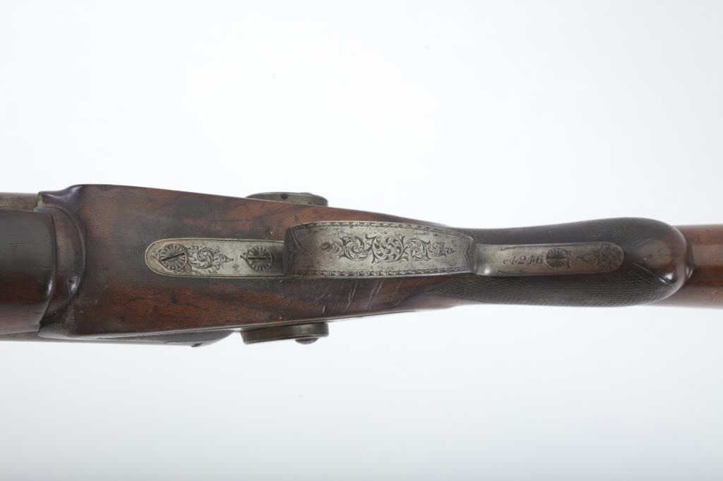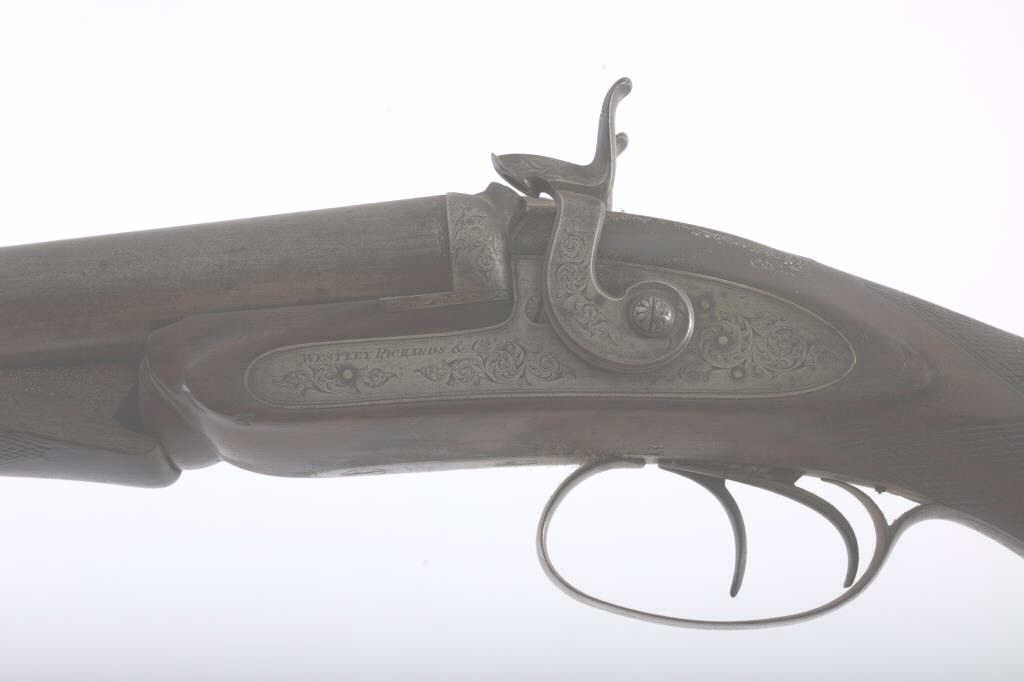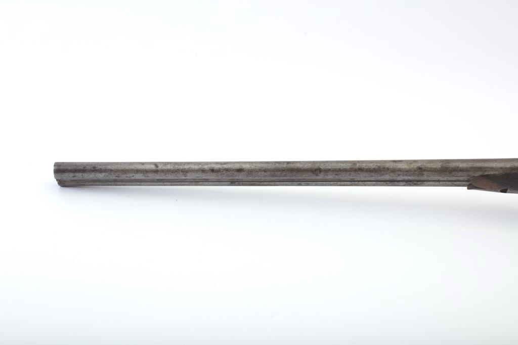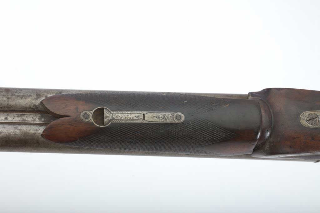 Early Westley Richards Bartwood transitional cartridge shotgun in 10GA with 30” barrels, S/N 4246. Closely resembles percussion shotgun. The release lever is mounted at the top of the action behind the hammers ismissing. The fore end shows a large “Chunk” of wood missing. A couple of dings in the barrel otherwise fair to good overall. Actions working. A rare type needing restoration. Est.: $500-$1000