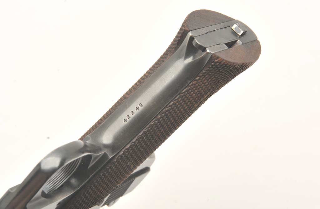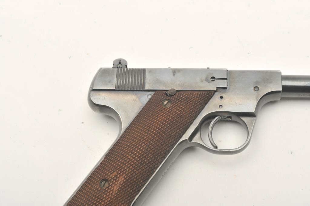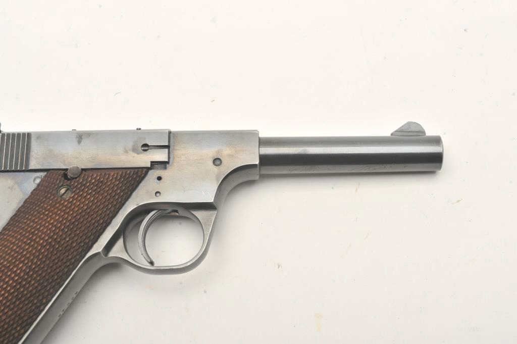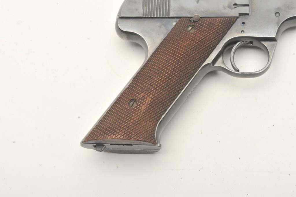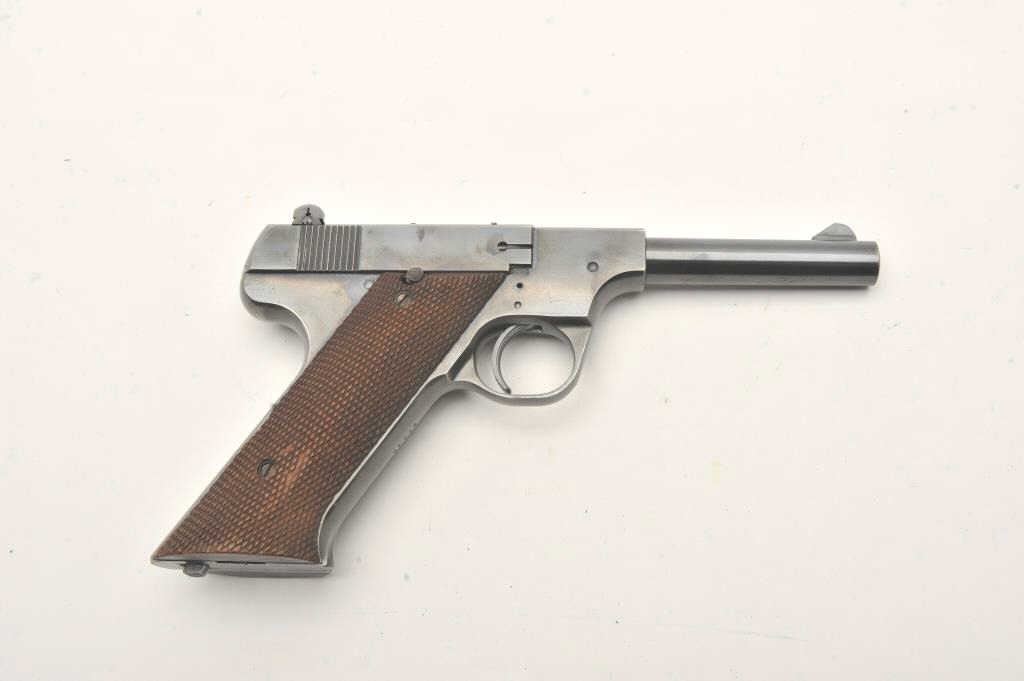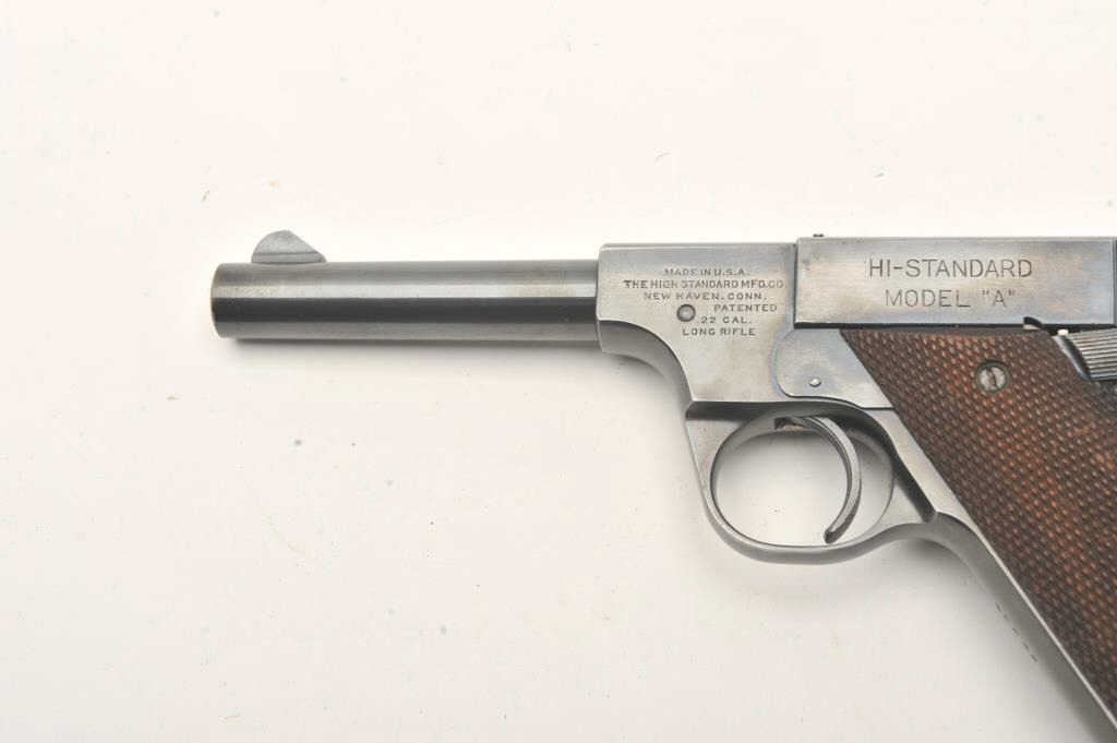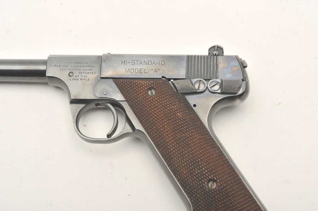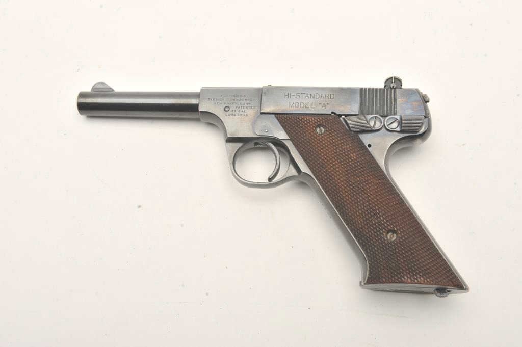 Hi-Standard Model "A", #42249, .22 LR cal., 4 1/2" barrel, blued finish, adjustable sights, with checkered grips. Pistol is in fine condition overall, showing 95%+ original finish, thinning slightly at the muzzle andgrip frame. The grips are very good plus with no chips or cracks, but some losses to the checkering. The bore and action are very good. Includes one correct mag. (C&R / PPT) Est. $400-800