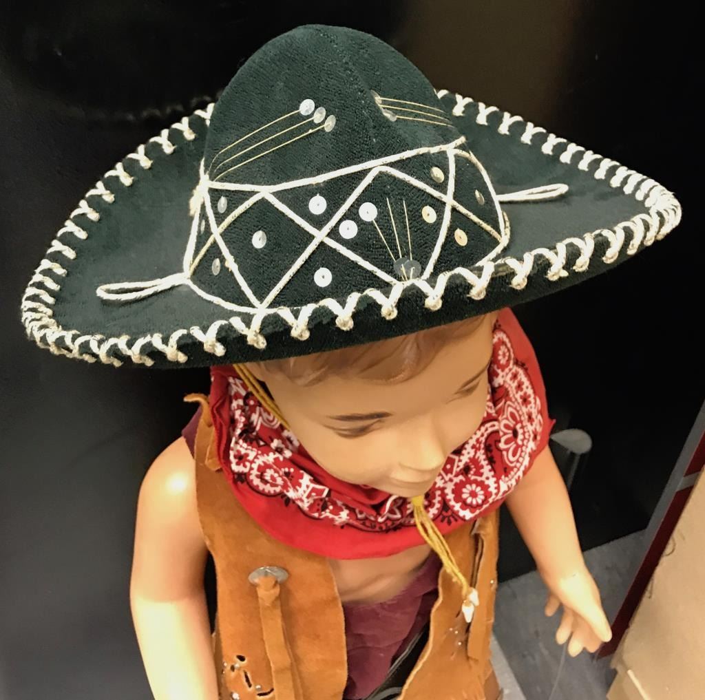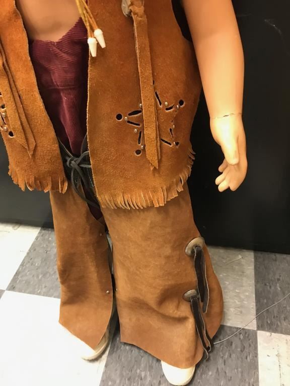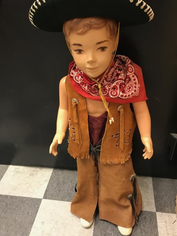 Large Doll wearing a cowboy vest, chaps and Mexican style hat. Est:$75-150