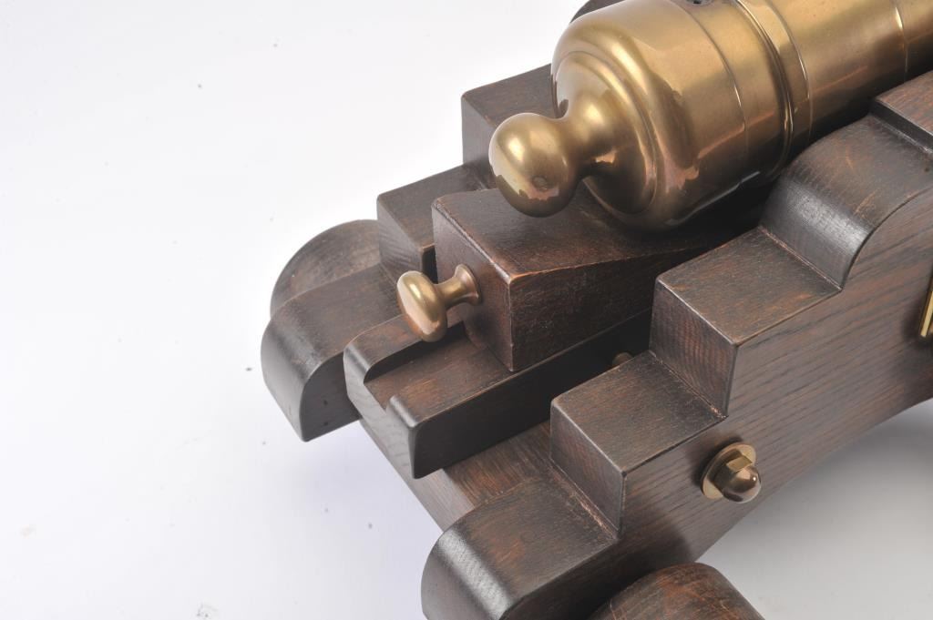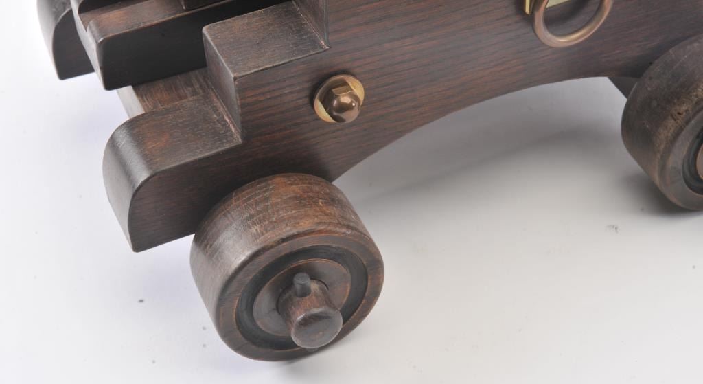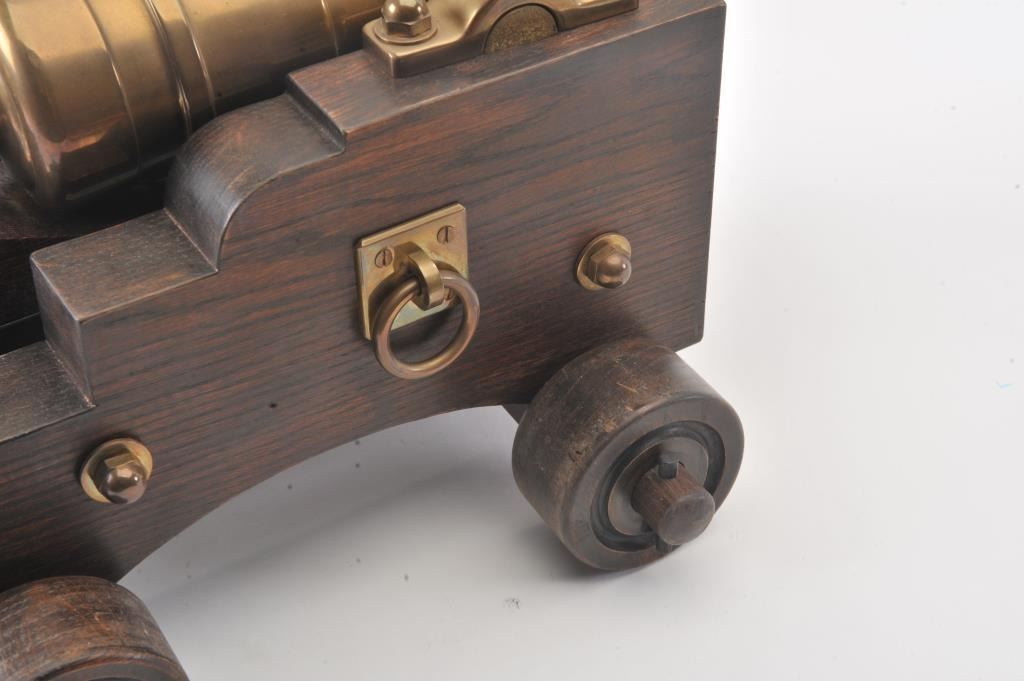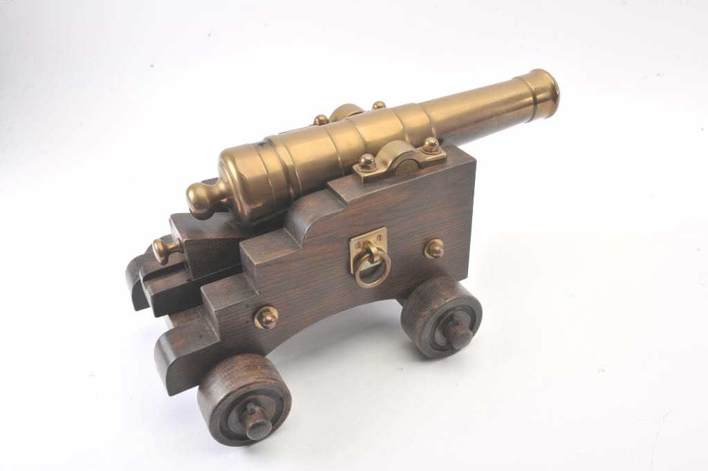 Miniature reproduction deck gun, brass barrel approximately 18” long with a ¾” diameter bore; mounted on a wood carriage approximately 16” long x 13” wide wheel to wheel; a ¾ scale model of an English Model1760 Ship’s cannon. Est.: $350-$700.