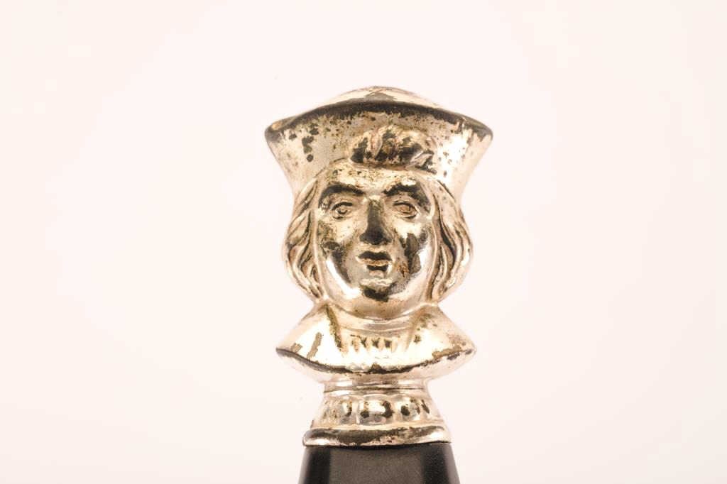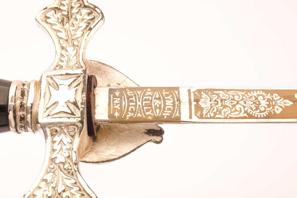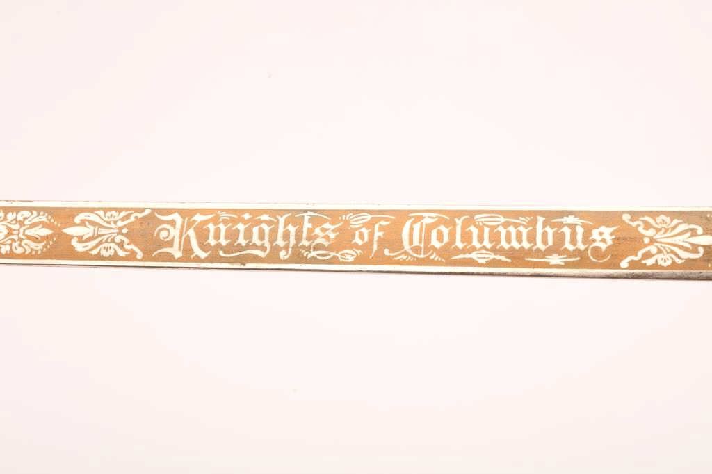 Knights of Columbus sword by Lynch & Kelly of Utica, New York with steel scabbard and case. The sword is 35” in total length with a 28” etched blade. The blade is marked Lynch & Kelly at the handguard and Knights of Columbus on the blade. The handguard is cast with a smooth plastic grip and knight’s head pommel. The steel scabbard shows moderate surface rust with ornamentation at the throat and toe. The lot includes aleather handled canvas case in fair condition. Est.: $75-150