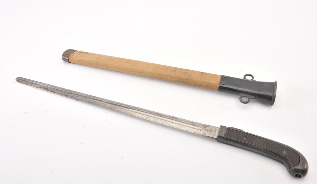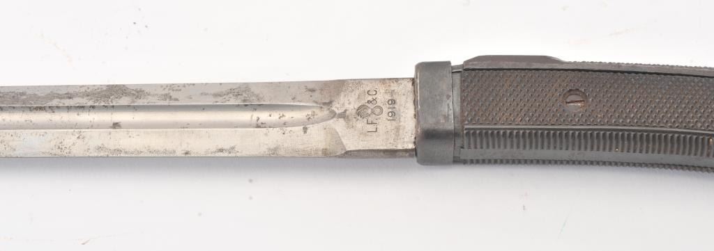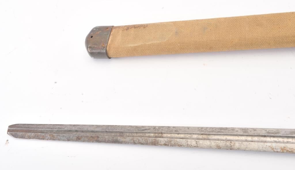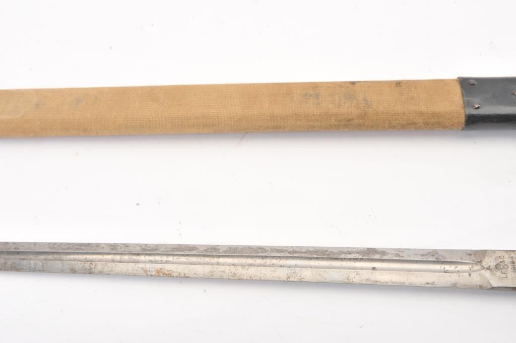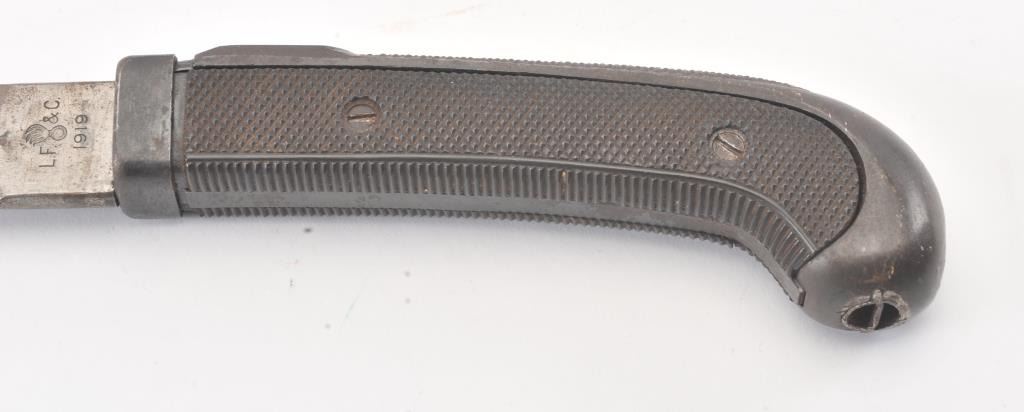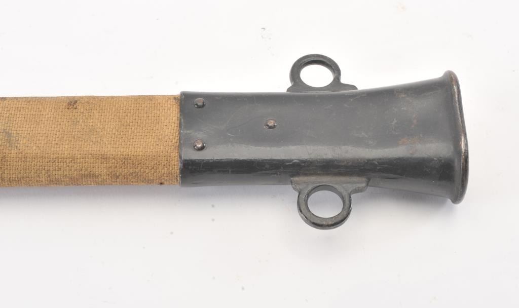 Patton sabre reduced to 22 ½” in length. Guard removed and scabbard shortened to match. Marked “L.F. & C 1918”. Several knowledgeable collectors speculate this type alteration used by military police andPhilippine military forces before WWII as several examples have been traced to that location. However we can find no substarciation to this theory. Good overall. Est.: $75-$150+++