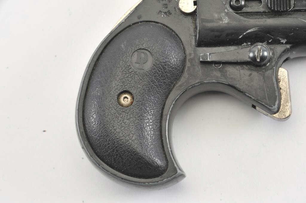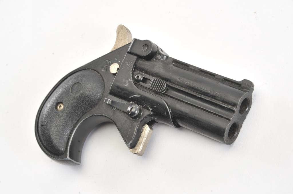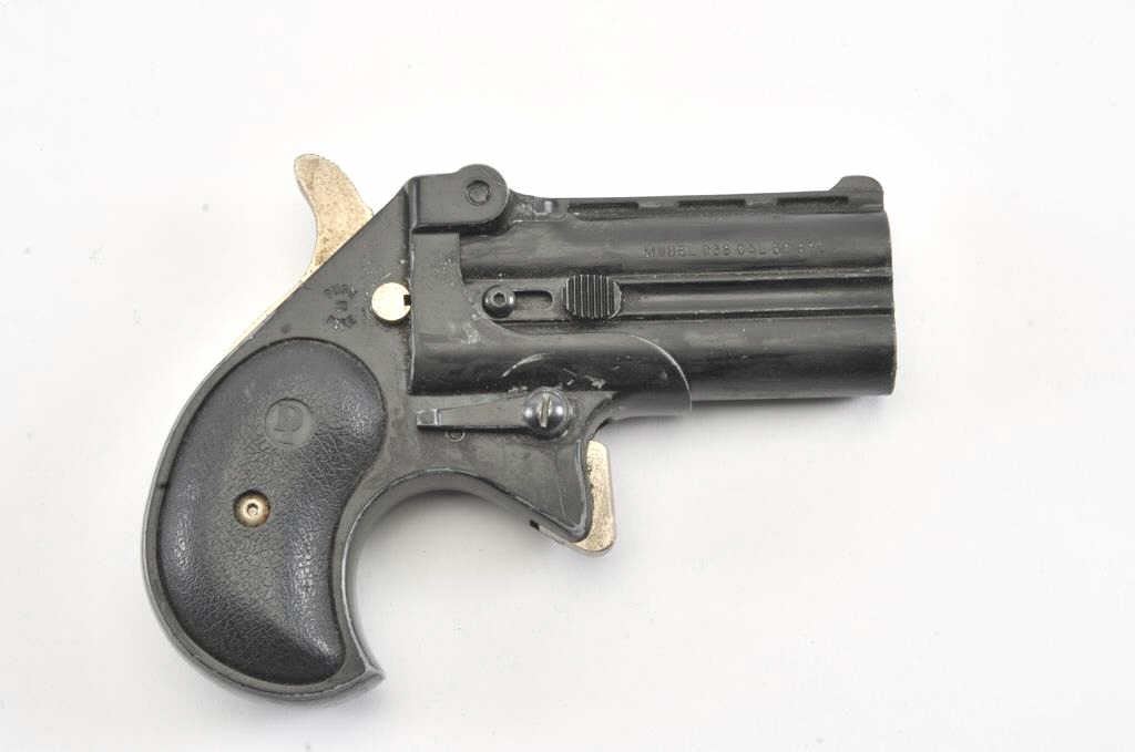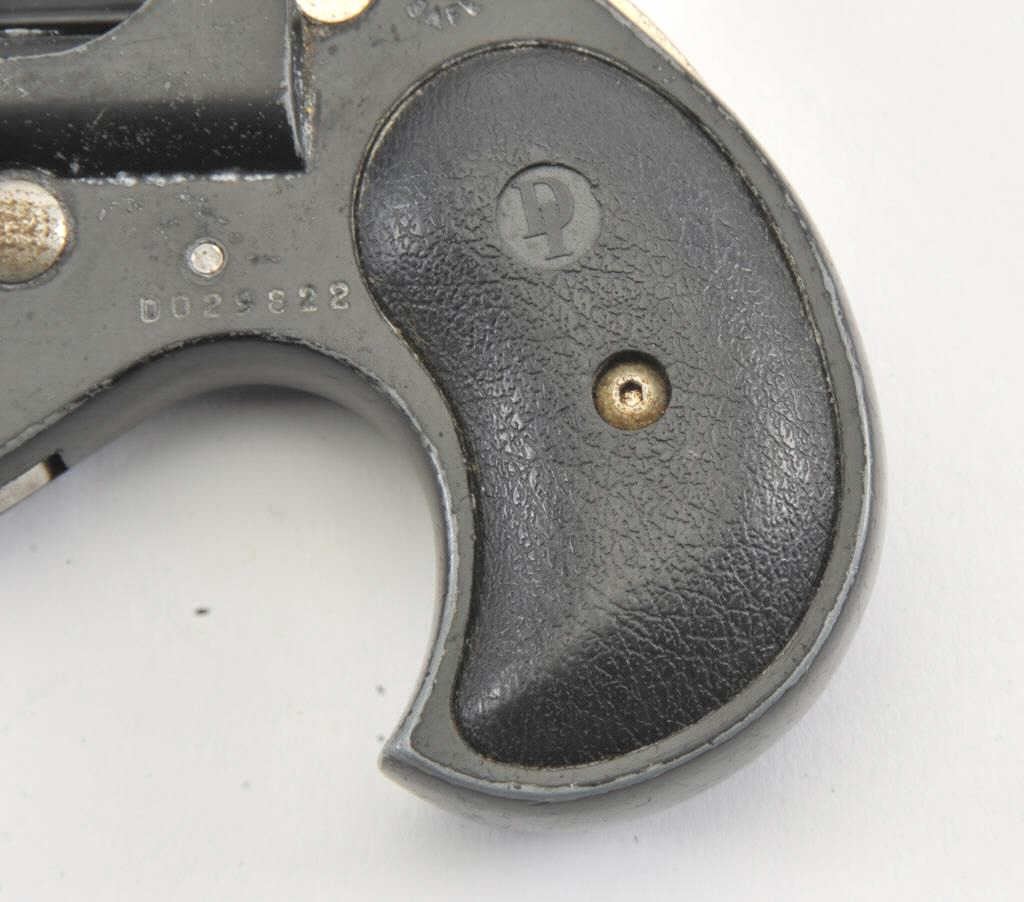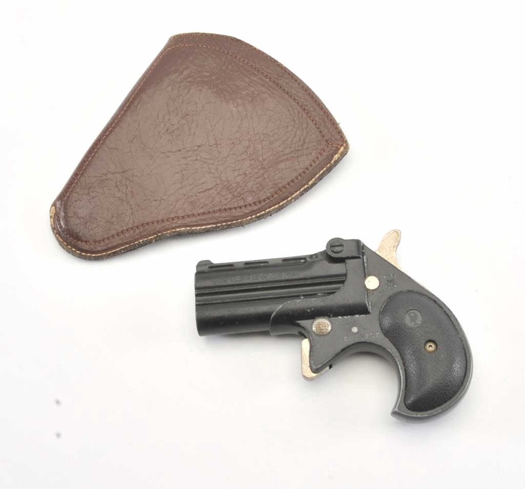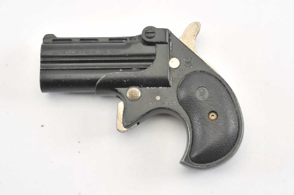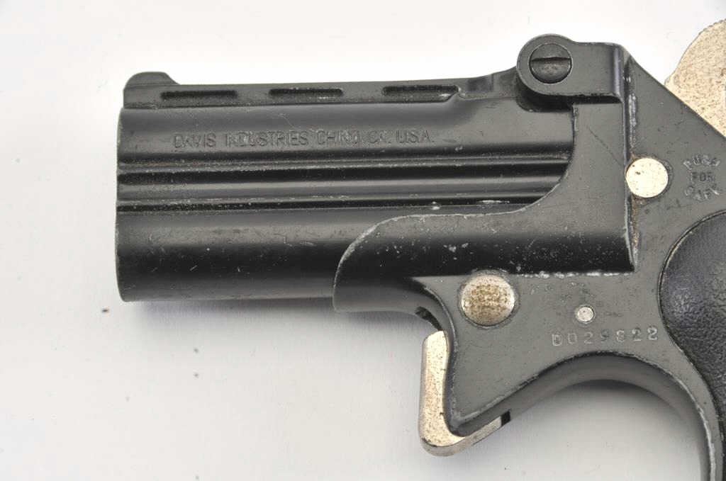 Davis Industries D38 O/U derringer, .38 Special caliber, Serial #D029822. The derringer is in good overall condition with 2 ¾” barrels. The pistol retains the majority of its matte blue finish with wear at themuzzle. The textured rubber grips are in good condition. The bores are good, the action functions and the action is crisp. The lot includes a leather in the waist band holster. Est.: $125-$250. (Modern/PPT).