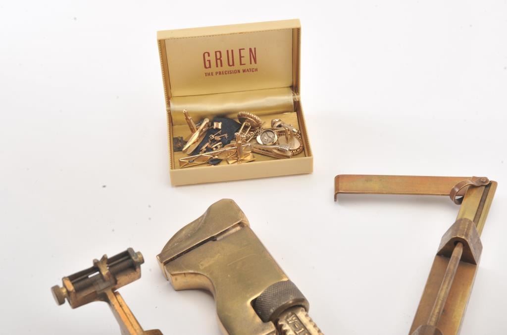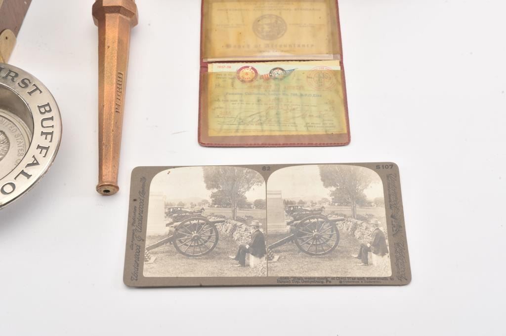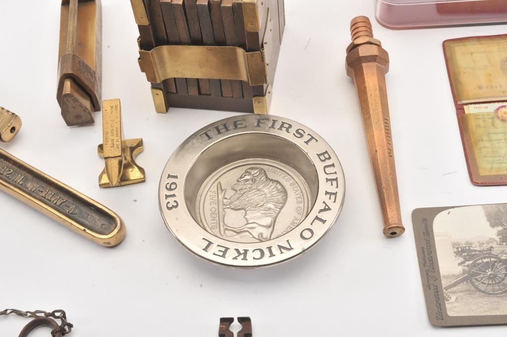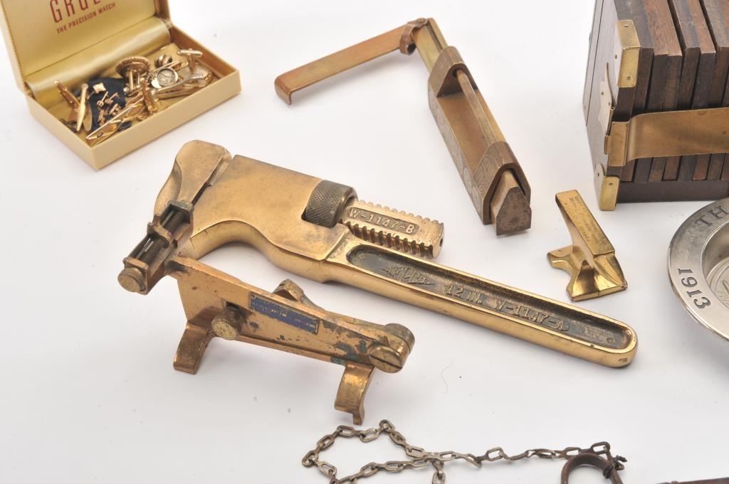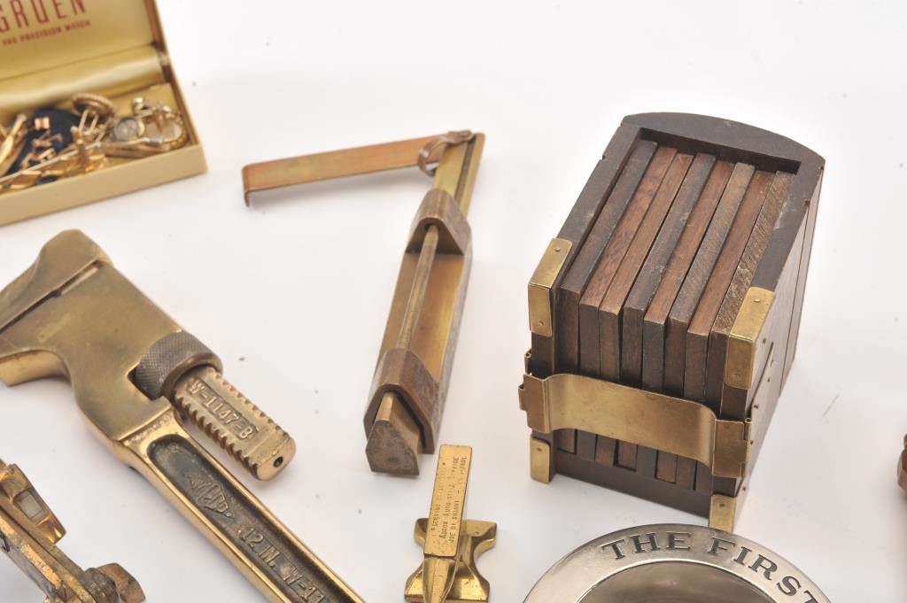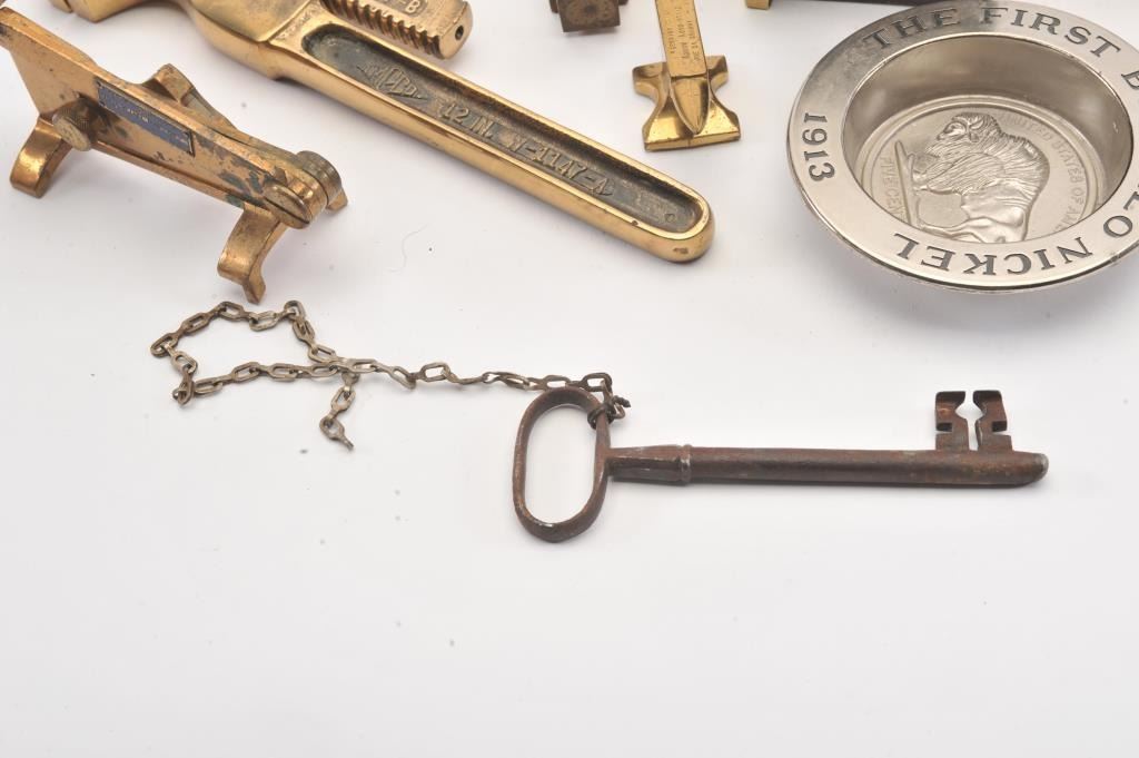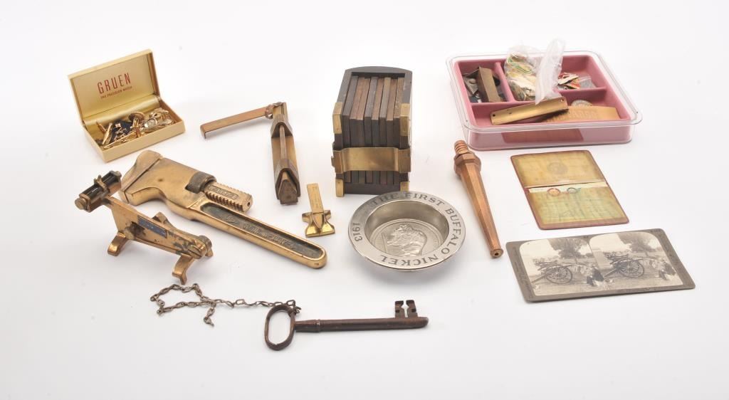 Interesting lot of collector smalls including an all brass vintage adjustable end wrench, several old brass weighing devices, an old large iron key, plus many misc. advertising pins, an old wood drink coaster set andholder, and more. Est.: $150-$300.
