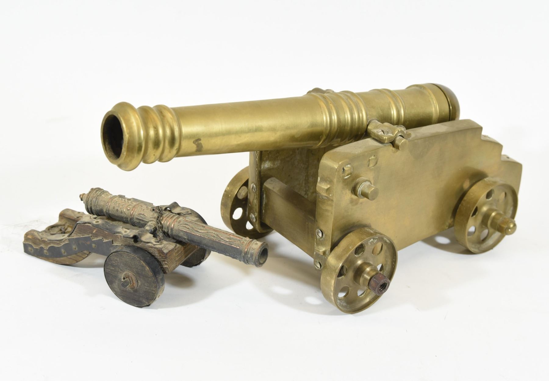 1) Brass canon fuse cap is cracked 12" long. 2) Wood/metal canon 6 3/4" long.