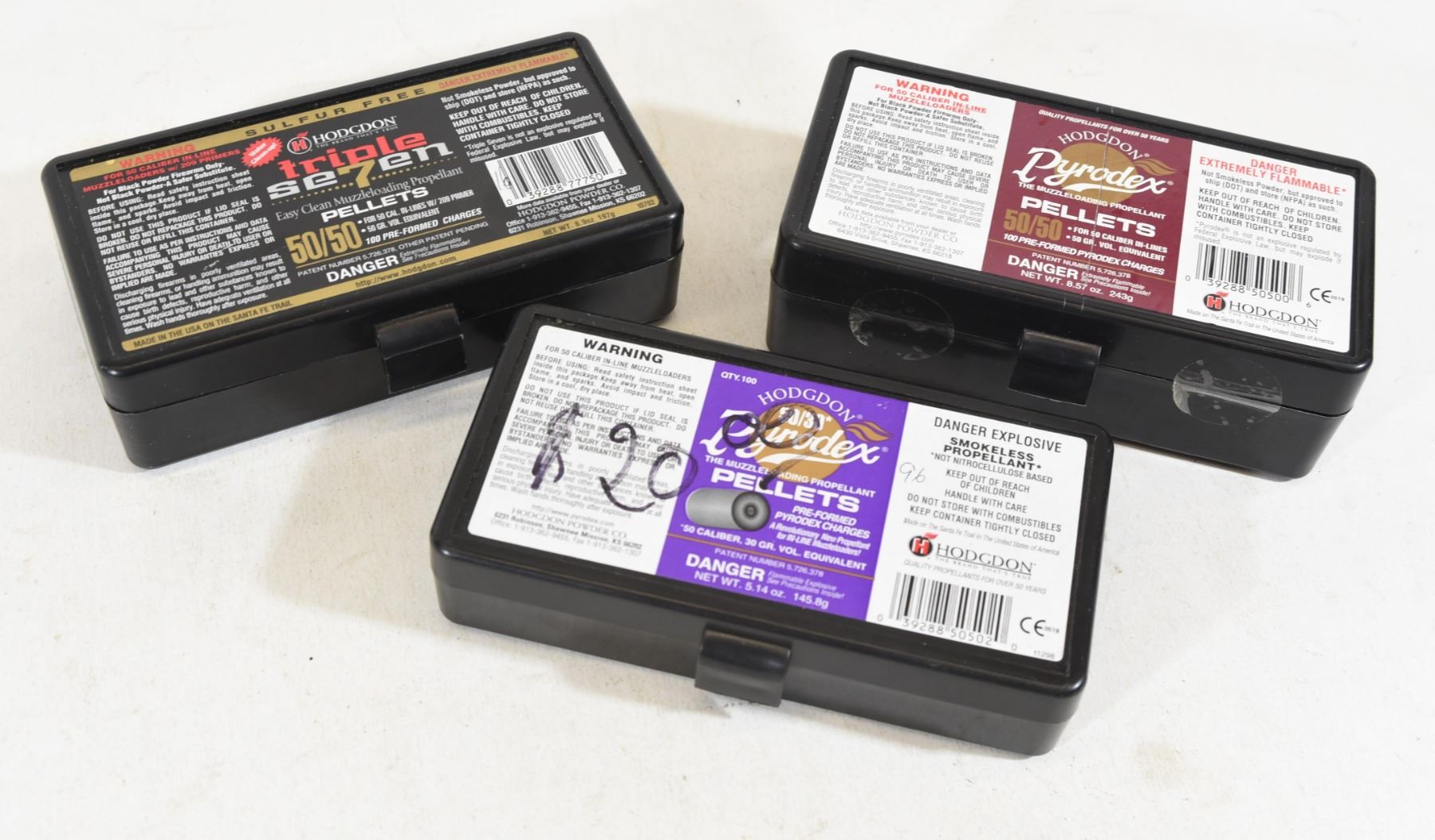 1) 96 50/30 Pyrodex pellets. 2) 100 50/50 Pyrodex pellets. 3) 16 50/50 triple se7en pellets.