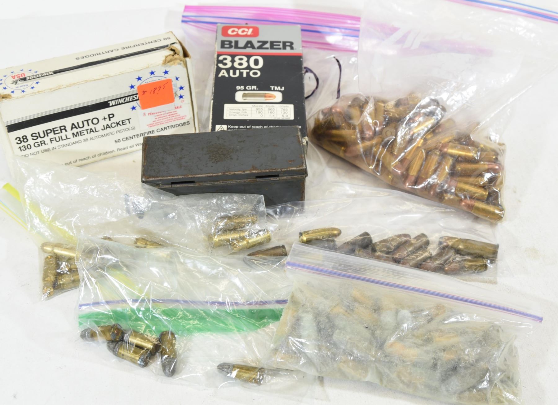 1) 12 rounds 9mm rounds. 2) 10 rounds 9mm blanks. 3) 50 rounds 38 S&W. 4) 5 rounds 380 Auto CCI Blazer. 5. 62 rnds 25 Auto 6. 72 rnds 38 super + 36 brass