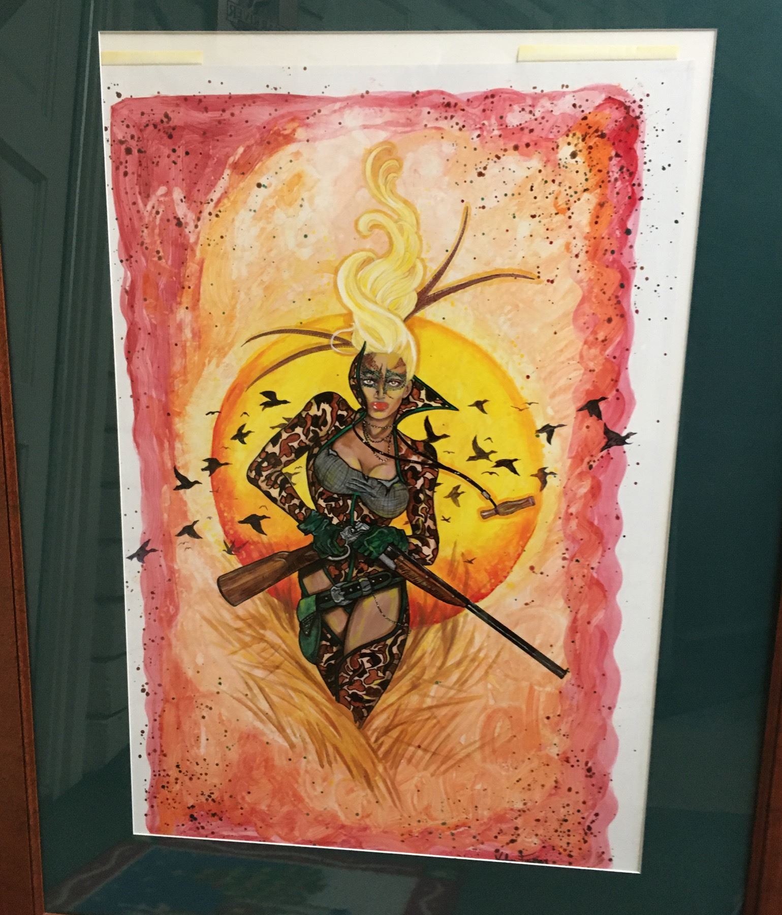 This original water color painting was done by Kalani Freeman of Las Vegas, Nevada and comes courtesy of one of our founding members. Kalani was a well known show girl in Las Vegas and was also a talented artist. Her art represented a cultural mash-up of exotic ladies and hunting themes.