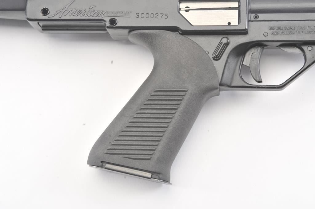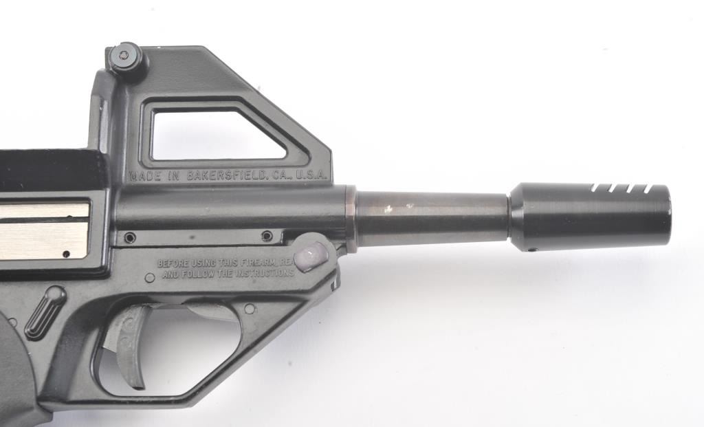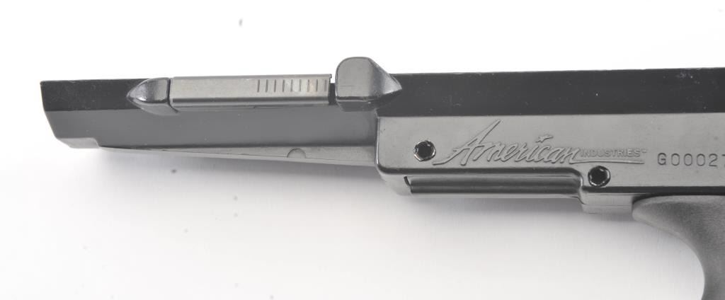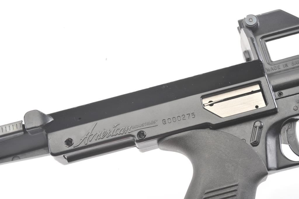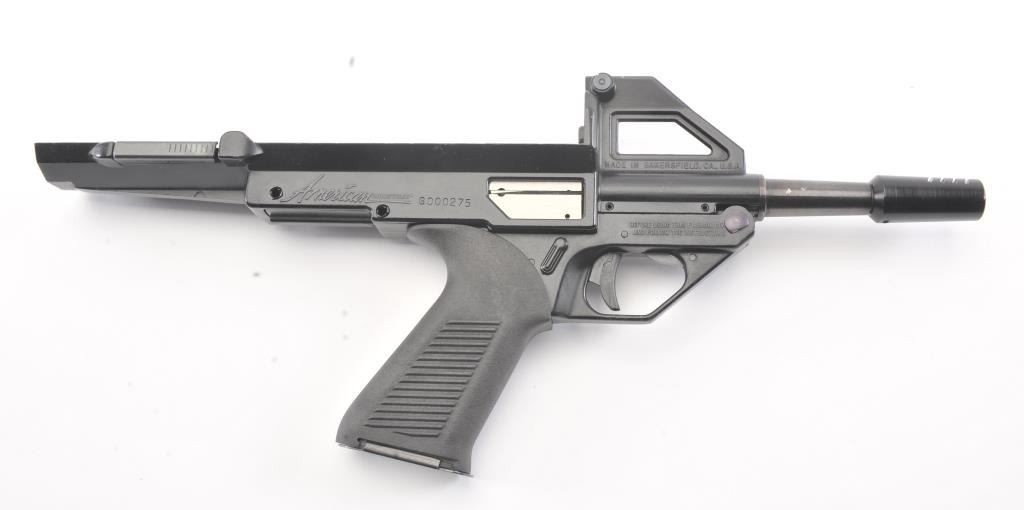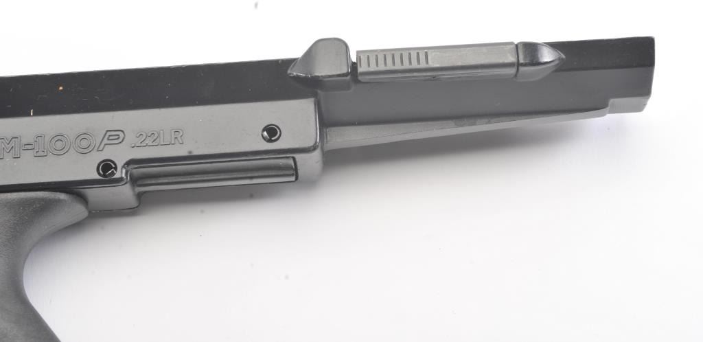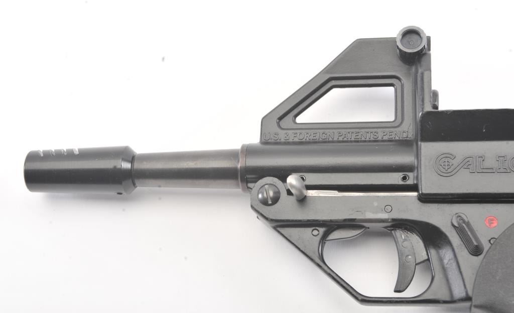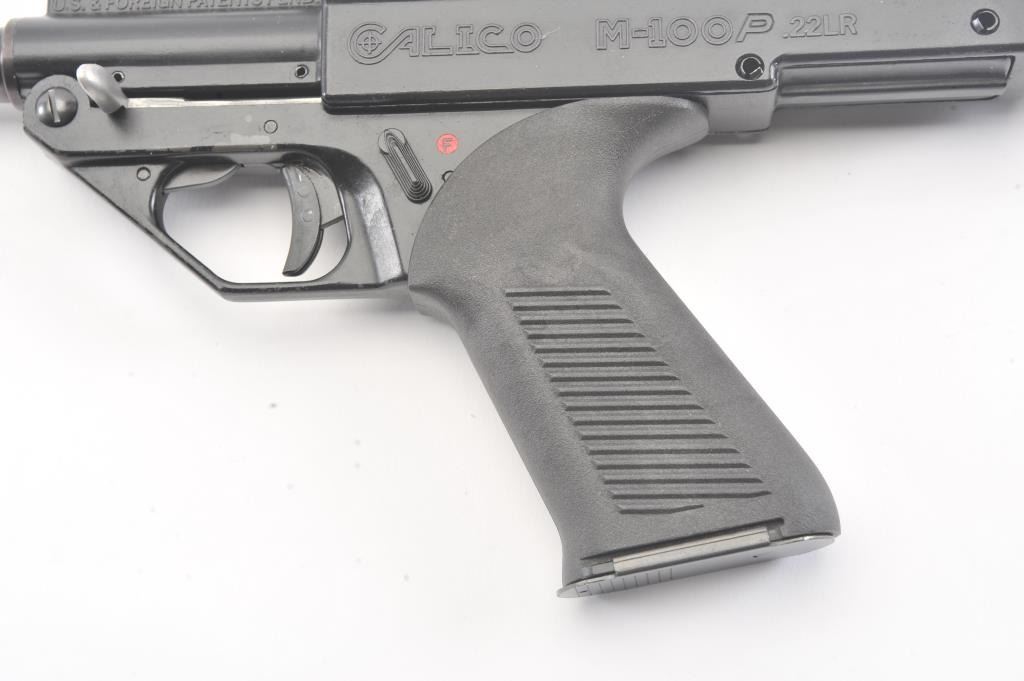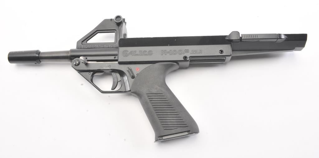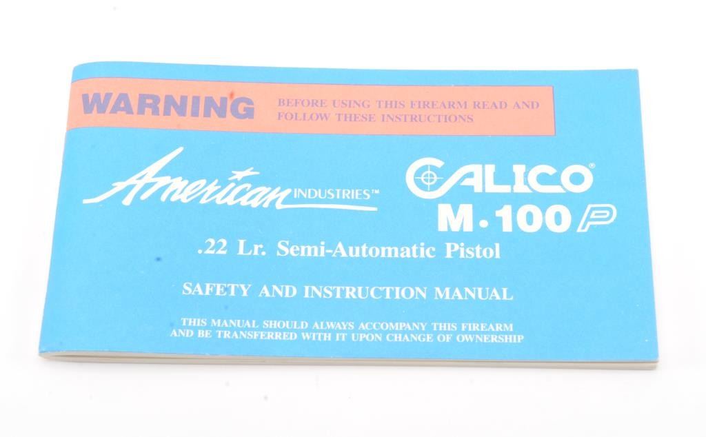 American Industries Calico M-100P semi automatic pistol, #G000275, .22 LR cal., matte black finish, 7" compensated barrel, adjustable sights, with black hard rubber grips. Pistol is in very good plus to nearfine condition overall, with minor paint chips on the trigger guard. The bore is minty, the action is crisp, and the grips are fine. Includes manual and one hi cap magazine (not transferable to CA or otherprohibited areas). (Modern/PPT) Est. $200-400