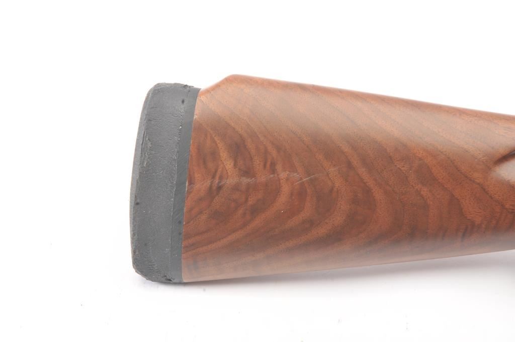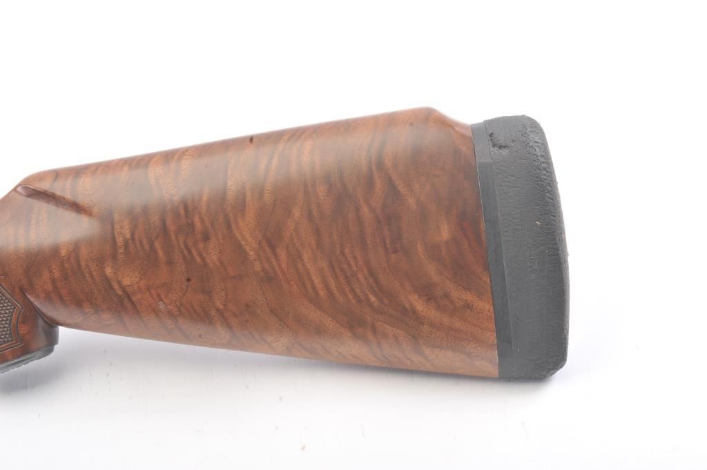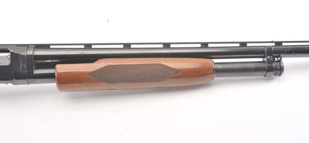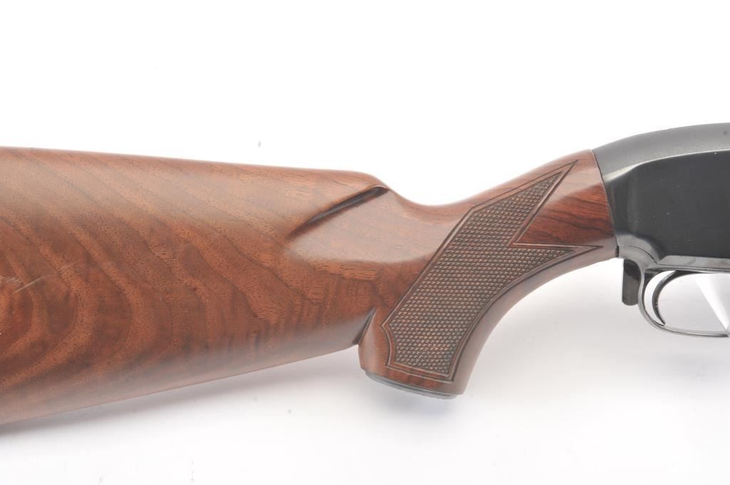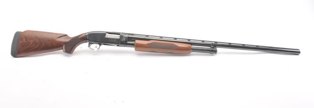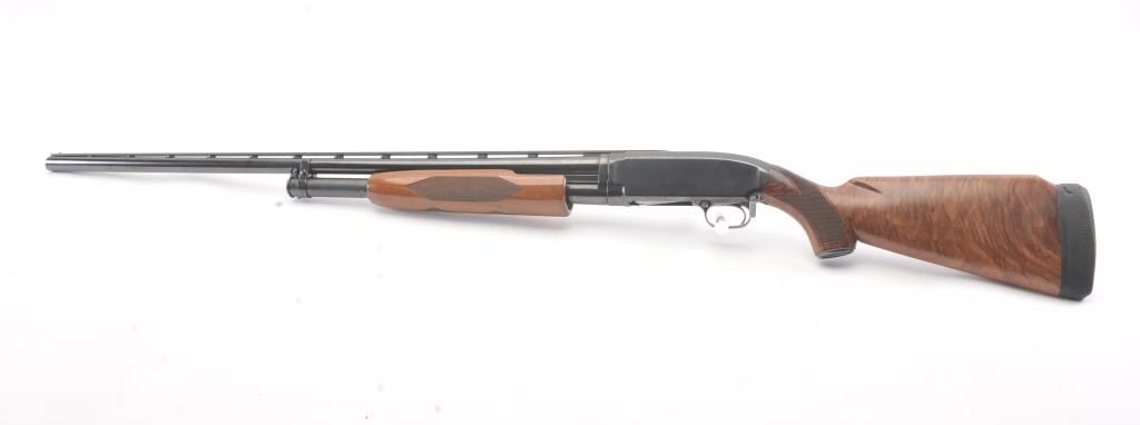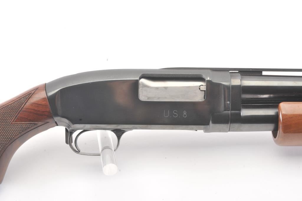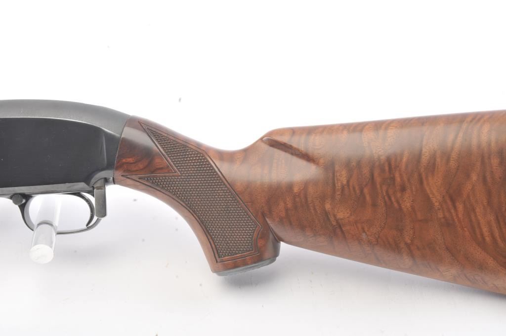 Winchester Model 12 Trap Shotgun in 12 GA with 32” full choked barrel and vent rib, S/N 1018394. Utilizing U.S. marked military frame and matching barrel. Custom burl wood stock with fine checkering and Winchesterblued steel pistol grip cap. Note: Has been equipped with release trigger that fires when trigger released also extended slide release. Measures 14” to the end of thick recoil pad. Near fine as restored andrefinished showing very good quality of workmanship. Excellent bore. (C&R) Est.: $500-$1000