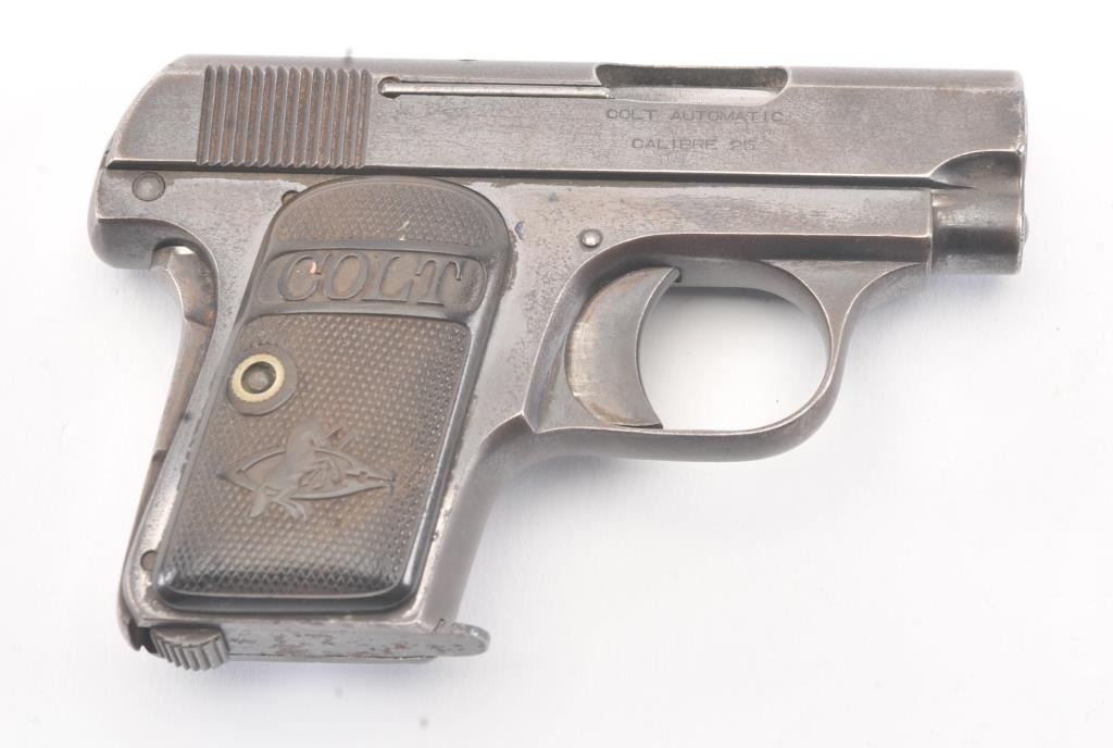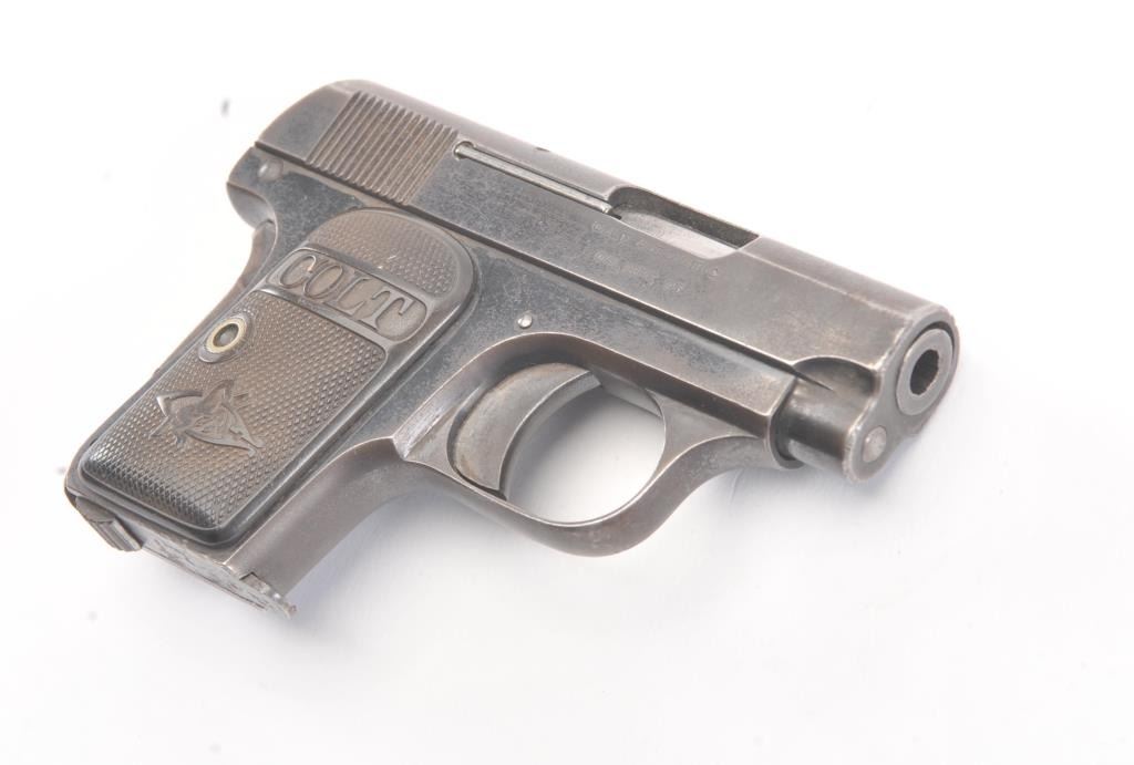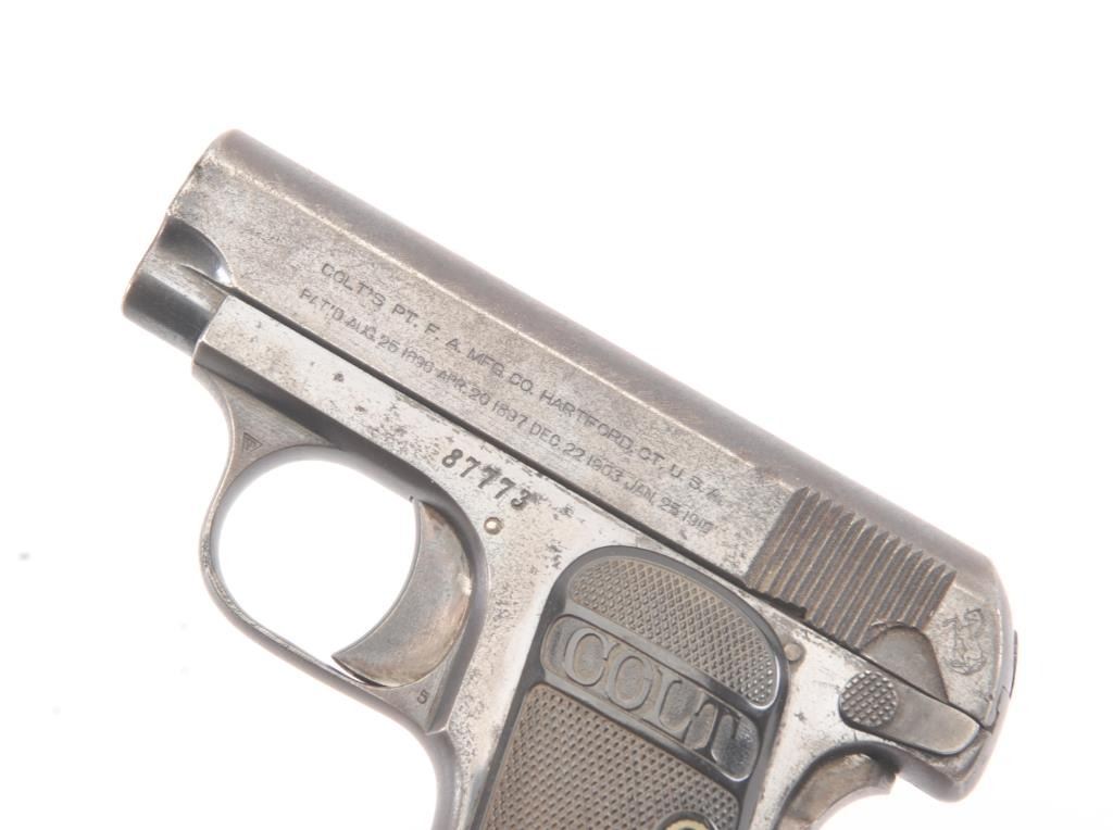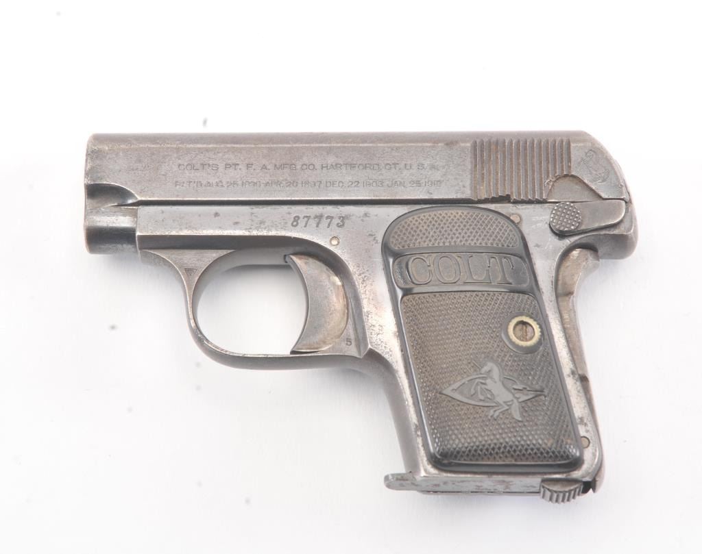Colt 1908 .25 caliber Semi-Auto pistol with blue finish and hard rubber grips, S/N 87773. Good to very good condition with 60%-80% original blue showing minor surface erosion and beginning to pit. Good overall. (C&R/NoPPT) Est.: $300-$600