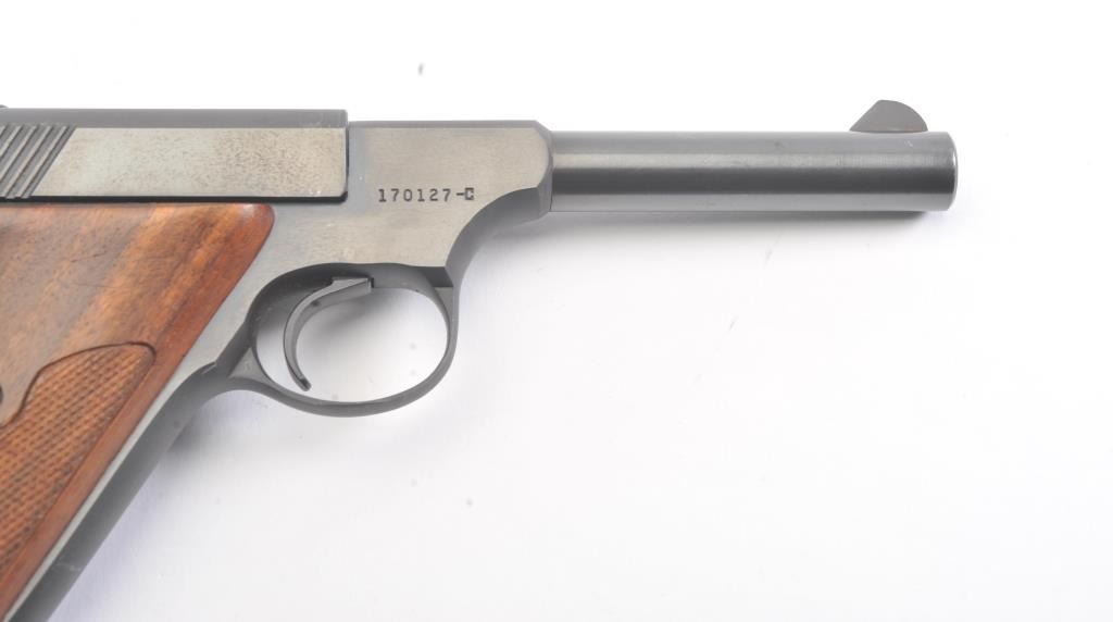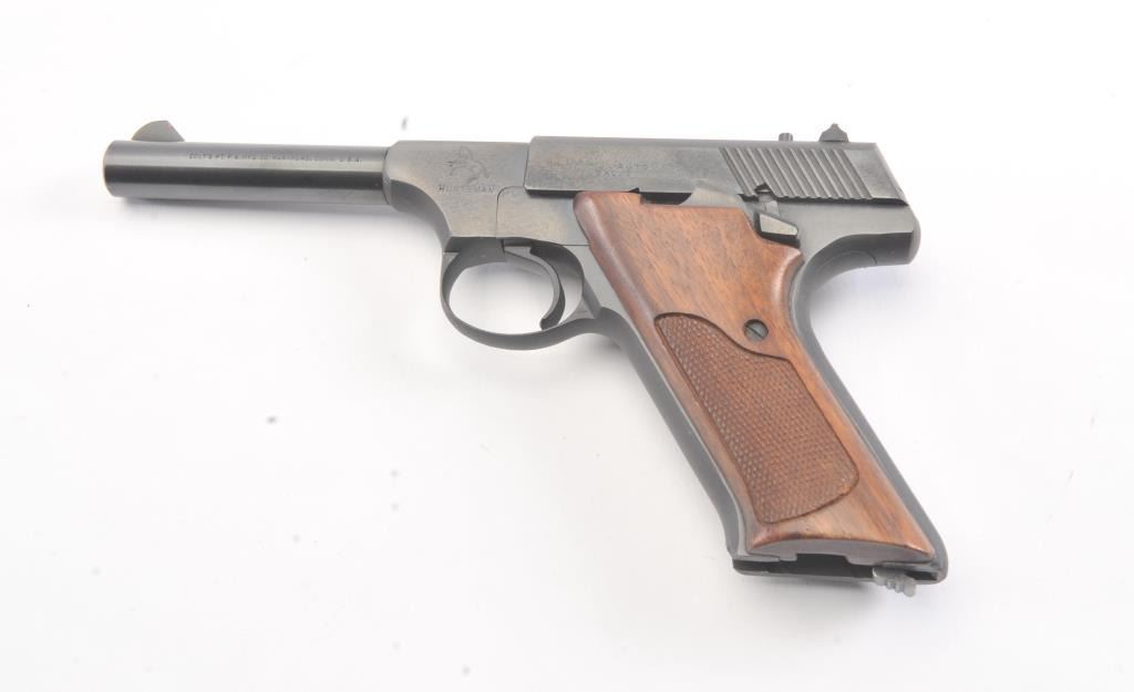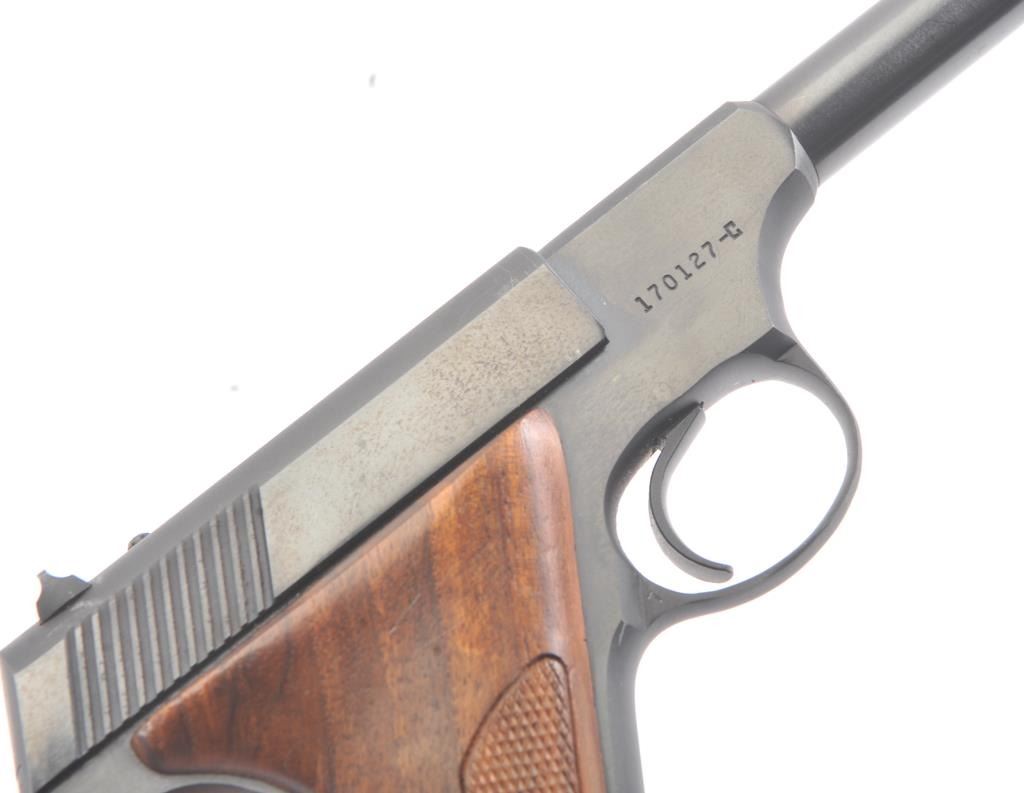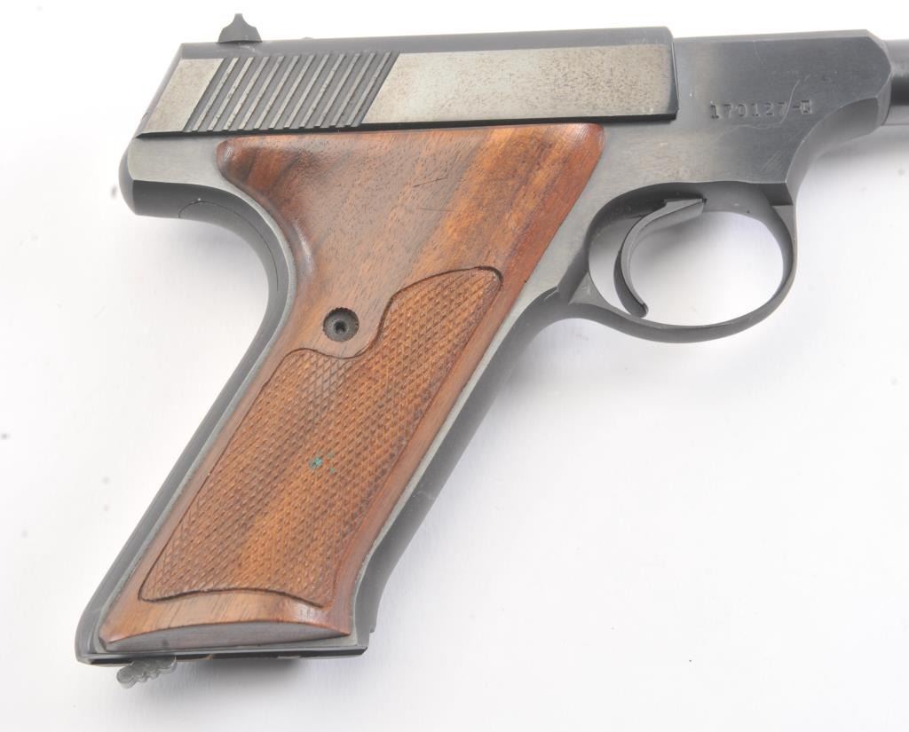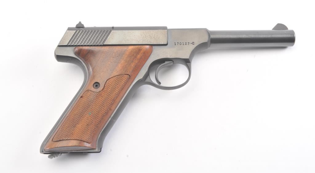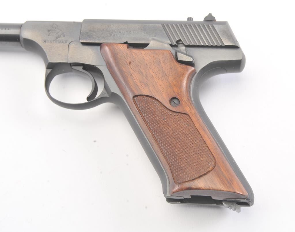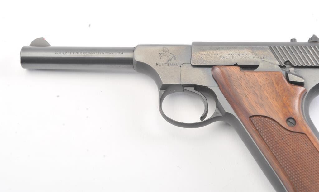 Colt Huntsman .22 L.R. Semi Auto pistol in Woodsman’s series with a 4” barrel, S/N 17012-C and made in 1950. Fine to excellent original condition showing minor firing and use. The front sight is painted red. 97%-99%overall. (C&R/PPT) Est.: $400-$800