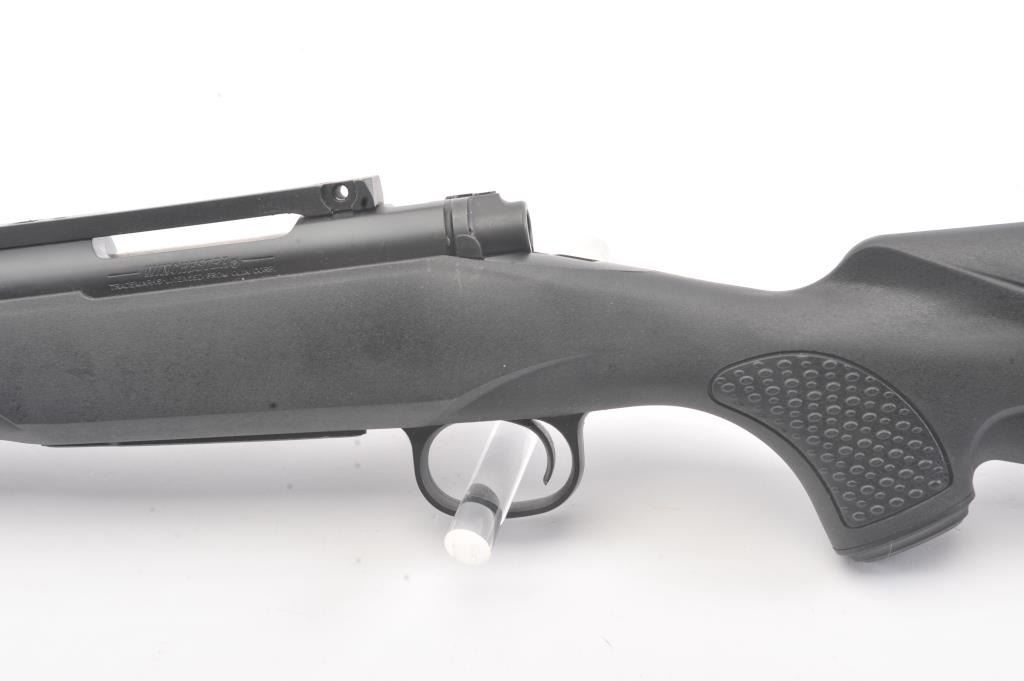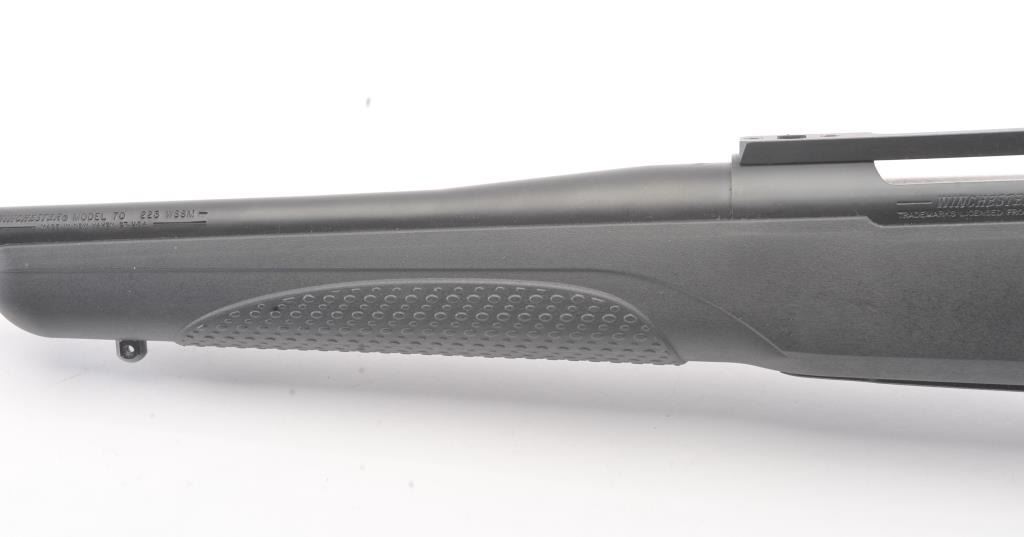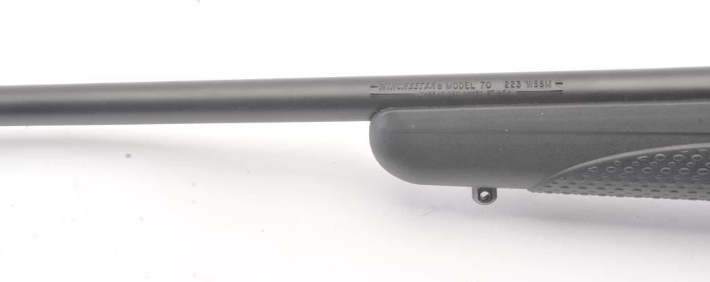 Winchester model 70, #G2517529 , .223 WSSM cal., 22 1/2" barrel, matte black finish, black synthetic stock, with rubber recoil pad. Rifle is in excellent condition overall, showing approximately 99% originalfinish. Bore is mint, action is crisp, stock is minty. In the original box, appears unfired. (Modern) Est. $400-800