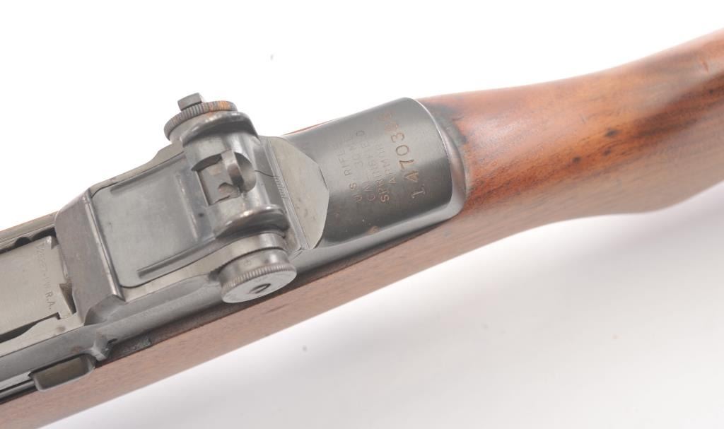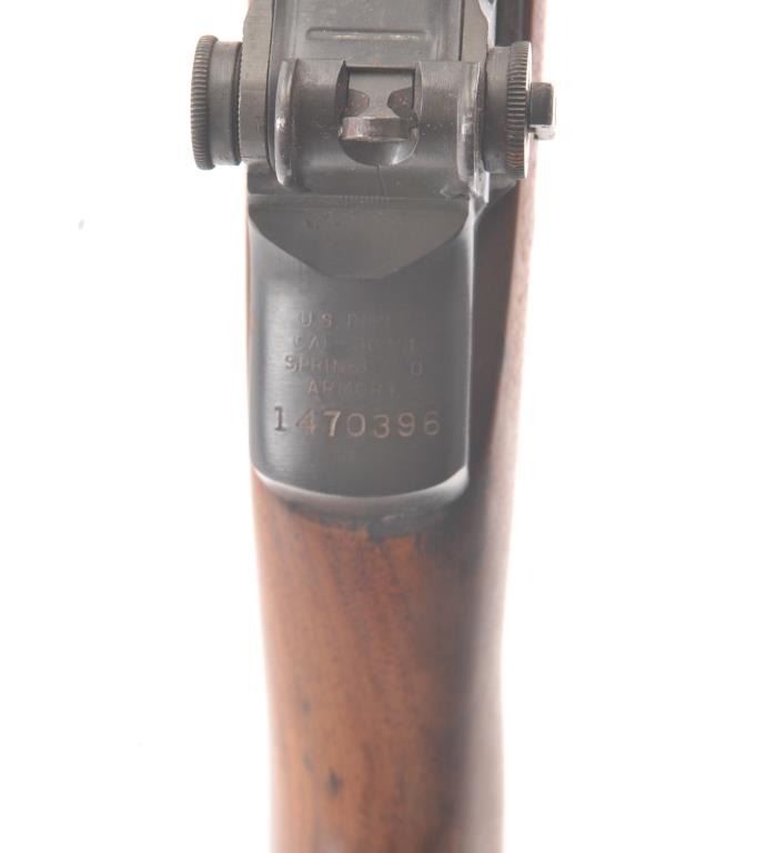 Springfield M1 Garand in .30-06 caliber with 24” barrel, S/N 10470396. Dated 43 and Springfield marked Winchester bolt, early sights, SA trigger group, SA operating rod, and stock “P” marked and re-finished. 90%-95% original military finish with near fine and shiny bore. With D.C.M. papers to our consignor’s estate. (C&R) Est.: $800-$1600