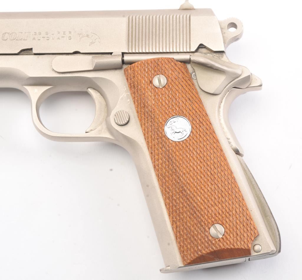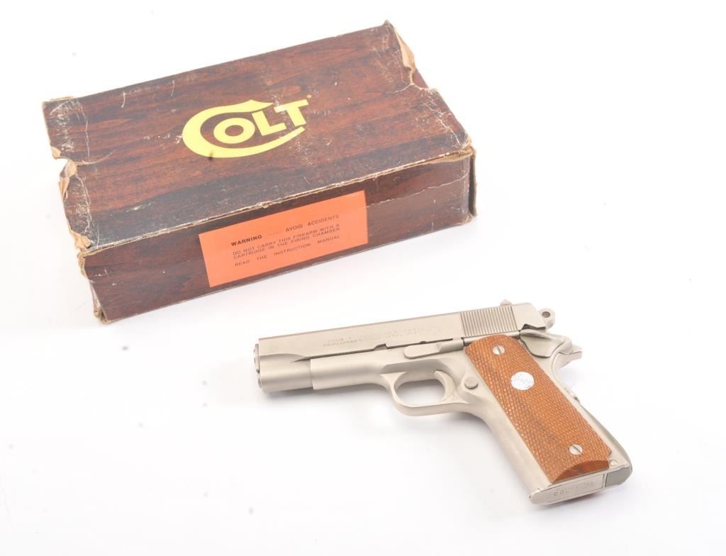 Colt Combat Commander Semi-Auto Pistol in .38 Super with factory ejectrolus nickel finish in original box, S/N 70SC41418. In near fine used condition with 3 electrolus nickel finish Colt mags, 1 Colt blue mag, and 1 MecCar (Italy) mag (5 total). Shows powder residue from firing and needs a cleaning! Desirable. (Modern/PPT) Est.: $1400-$2800