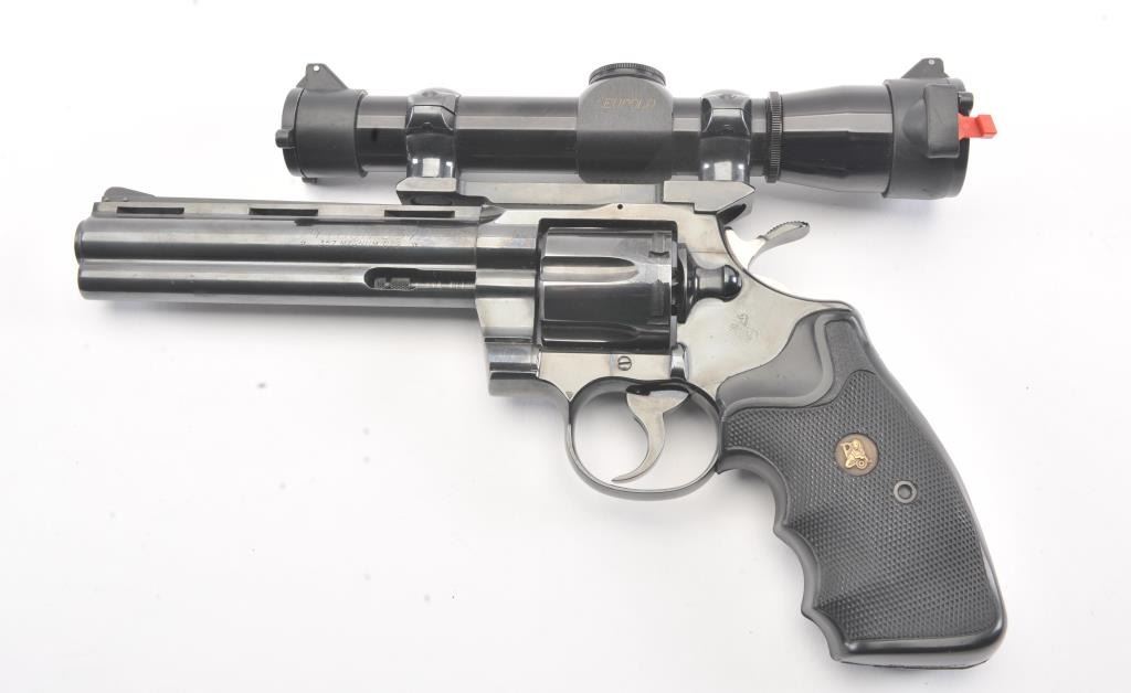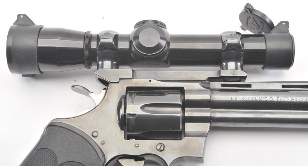 Colt Python Double Action revolver in .357 Mag with a 6” barrel mounted with leupold scope and Pachmayer grips, S/N 84720. 90%-95%+ original blue showing minor use and firing. A couple small nicks. Slight indexline on the cylinder. A fairly early python circa 1968. Showing a little use but no abuse. (C&R/PPT) Est.: $2000-$4000