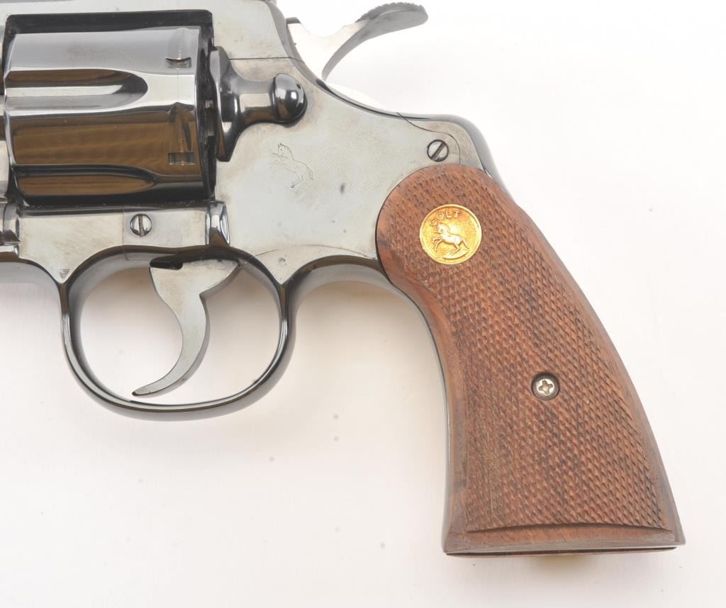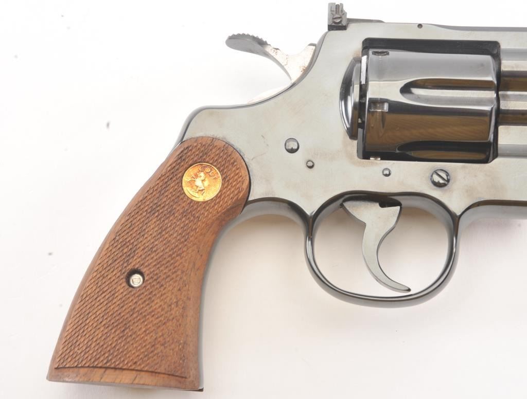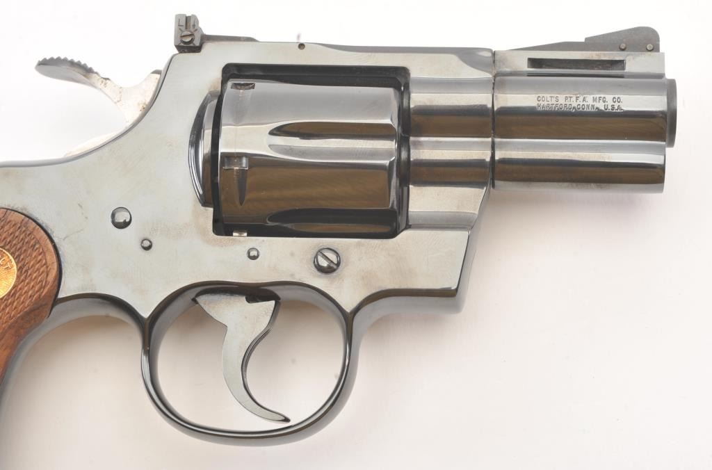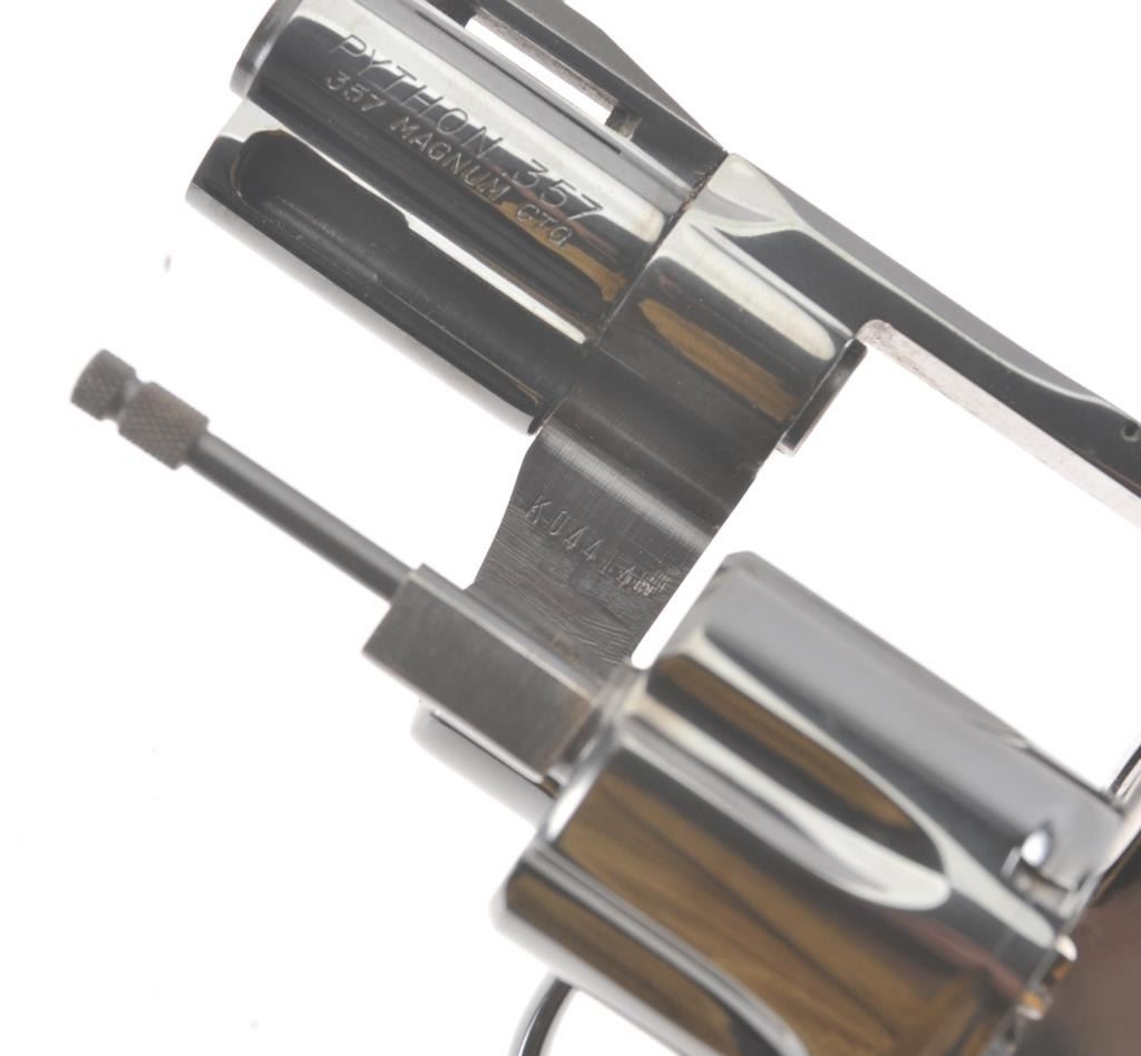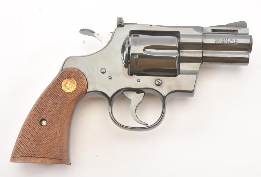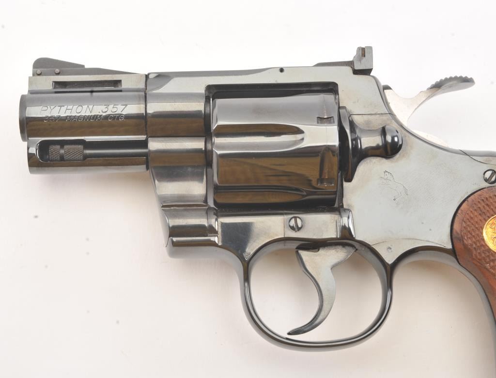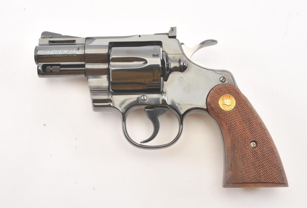 Colt Python in .357 with desirable 2 ½” barrel, blue finish, and checkered medallion wood grips, S/N K04414. Fine to excellent original condition with 98%-99% original blue showing minor operation and limited toalmost no use. With instruction manual and “Gun Club” soft case with purchase. New in west L.A. about 1979-80. (Modern/PPT) Est.: $1750-$3500