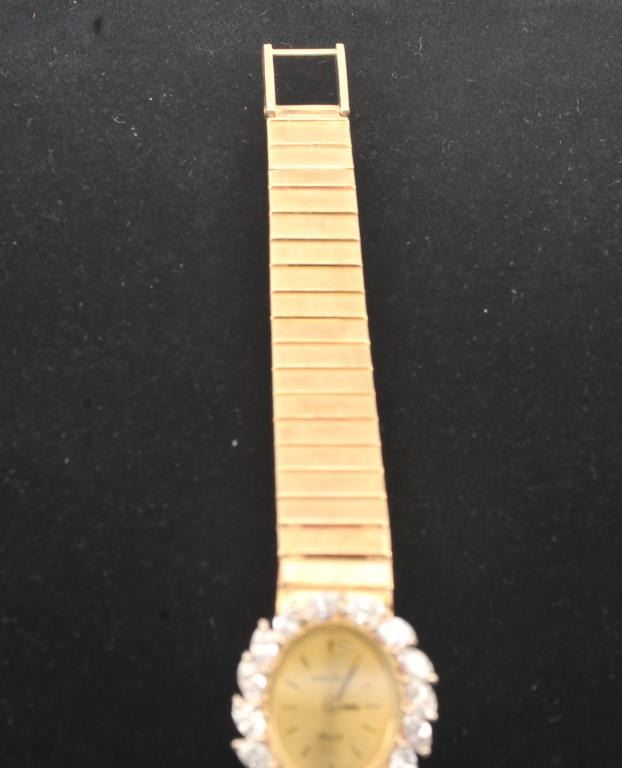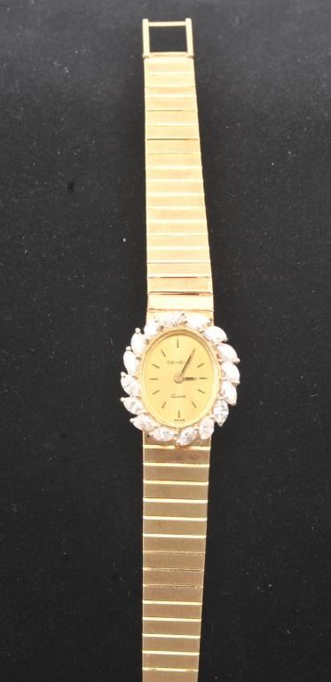 14K Gold Ladies watch with face marked “Geneve” (Quartz) surrounded by 1.71 high quality diamonds and 39 grams gross weight (Over 1 Oz. 14K) with appraisal AGL Lab $3,500. Est.: $1750-$3500