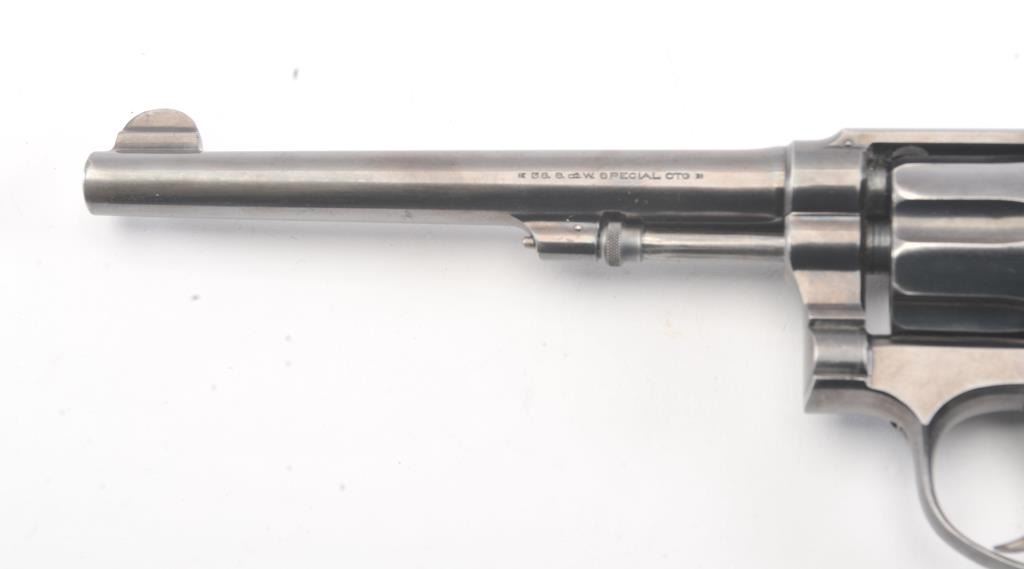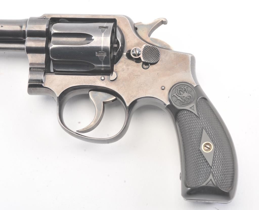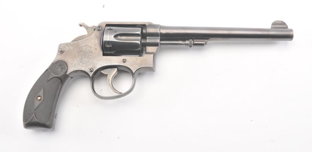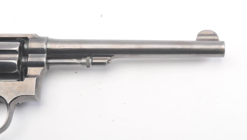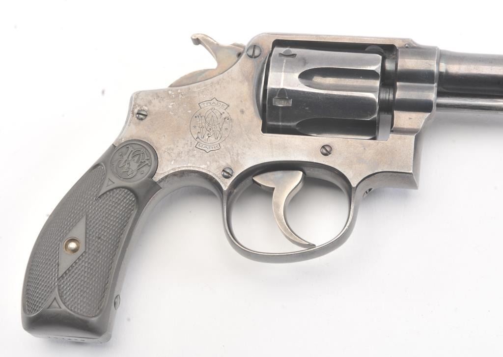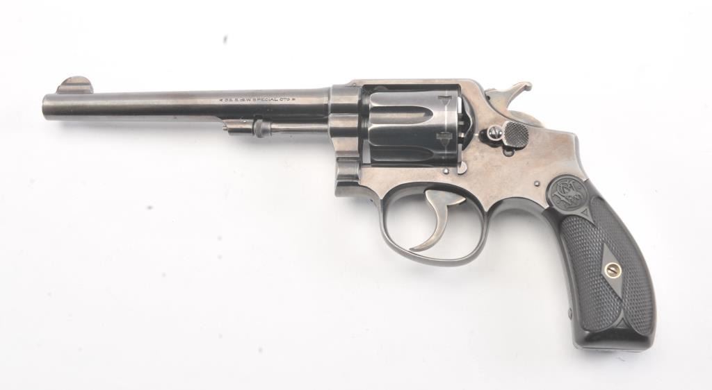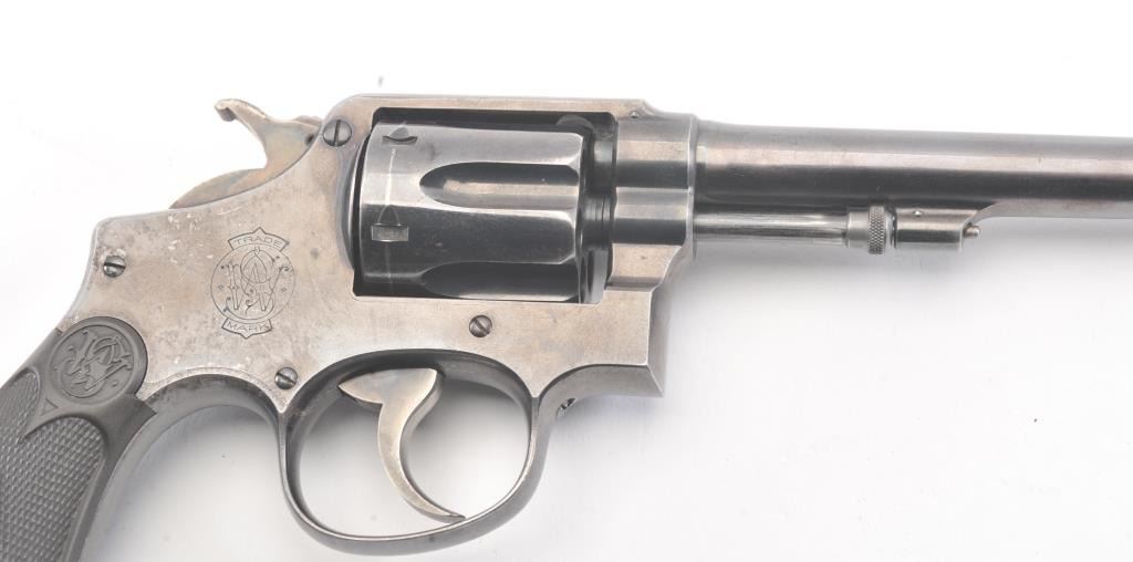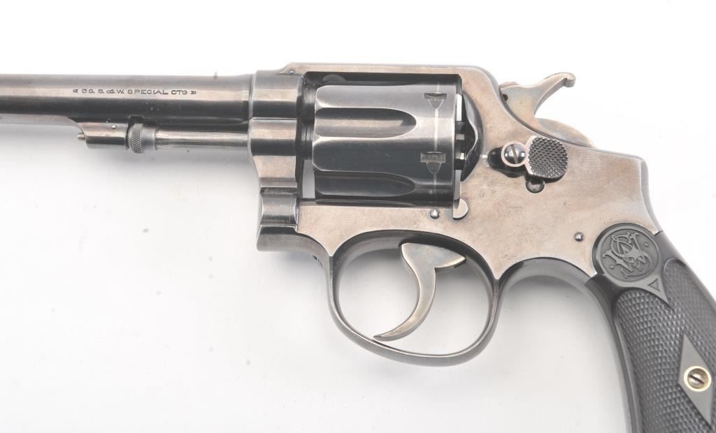 Early S&W Model 1905 Pre-Model 10 Double Action Revolver with high polish blue finish, hard rubber grips and 6” barrel, S/N 121436. 50%-70% original blue with even loss and some spotting on the right side from aholster near the logo. The grips are good with even wear. 75%-85% bright case colors on the hammer and trigger. The action is tight and the bore is bright. (C&R/No PPT) Est.: $400-$800