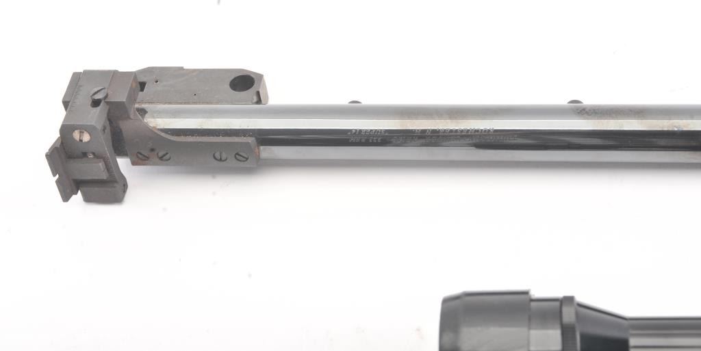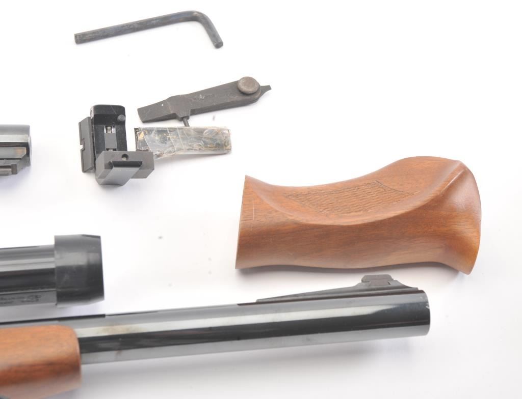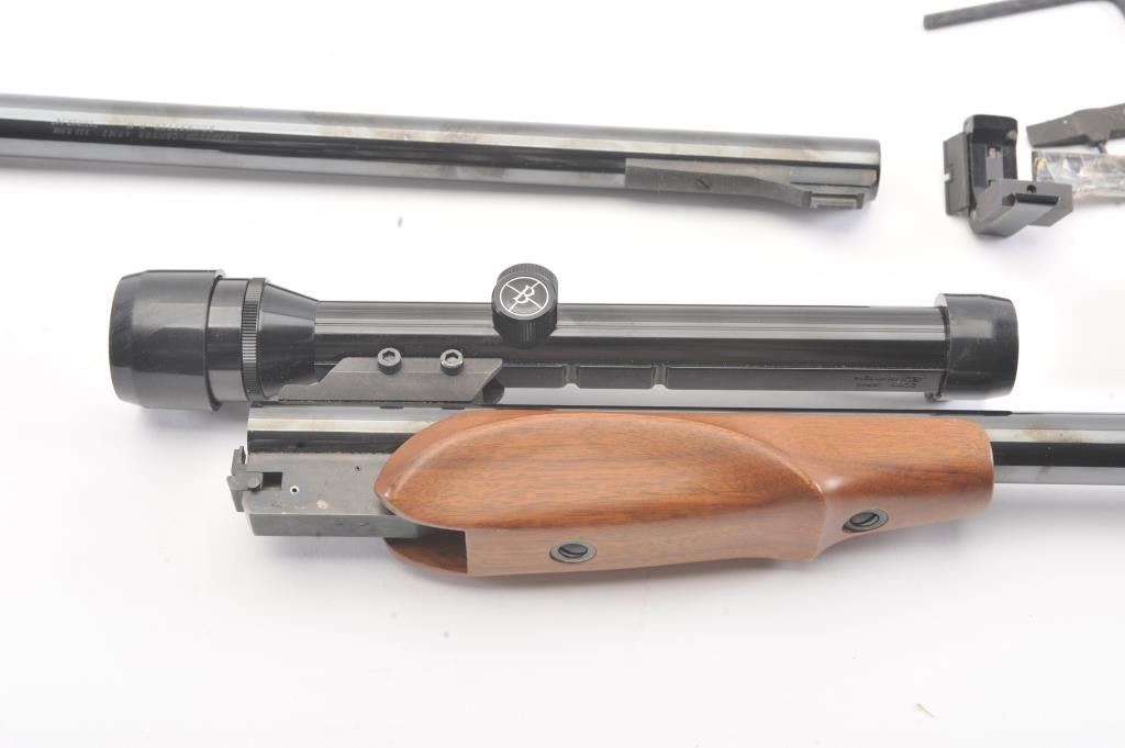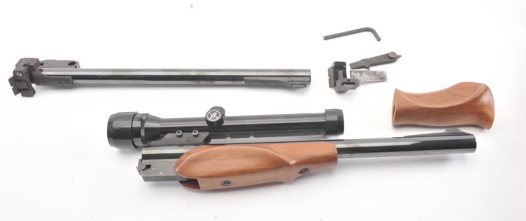 Thompson Contender lot consisting of the following: 1. .222 Remington barrel, 14”, iron sights. Near fine and little use. 2. .30-.30 Winchester barrel, 14” withBushnell 2.5 x Phnaton scope and fore end. Very good plus used condition. 3. Pistol grip 4. Carry case Est.: $200-$400