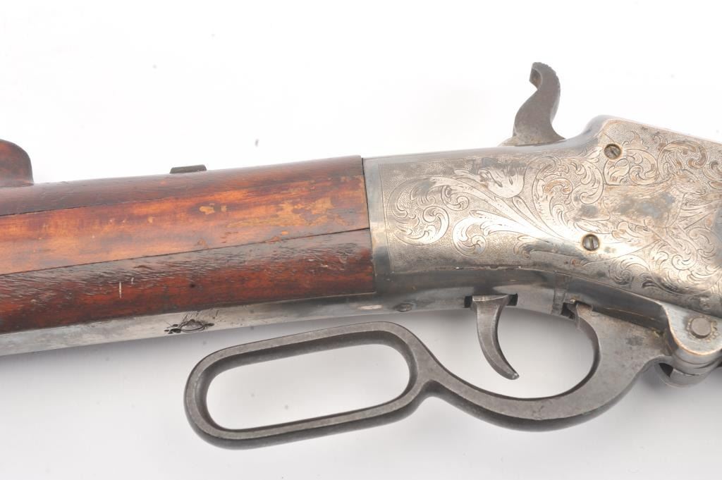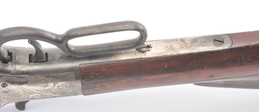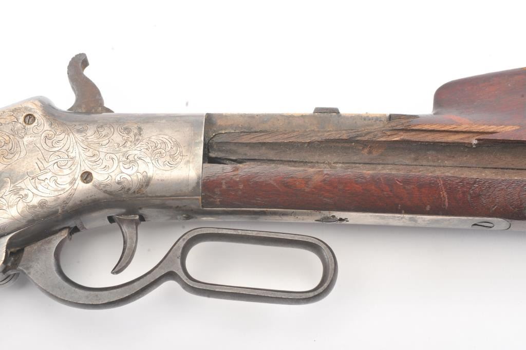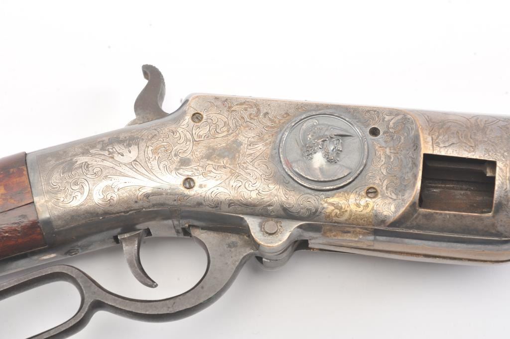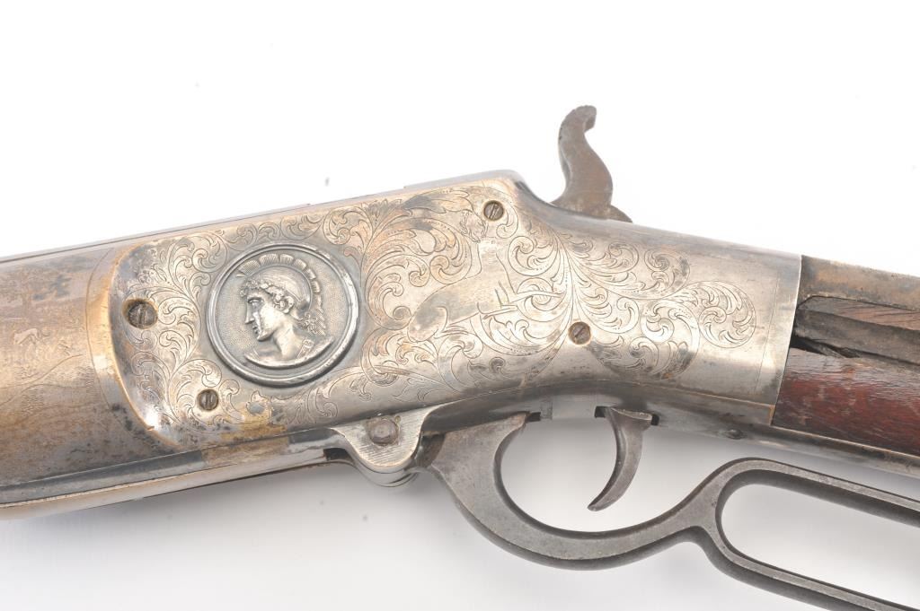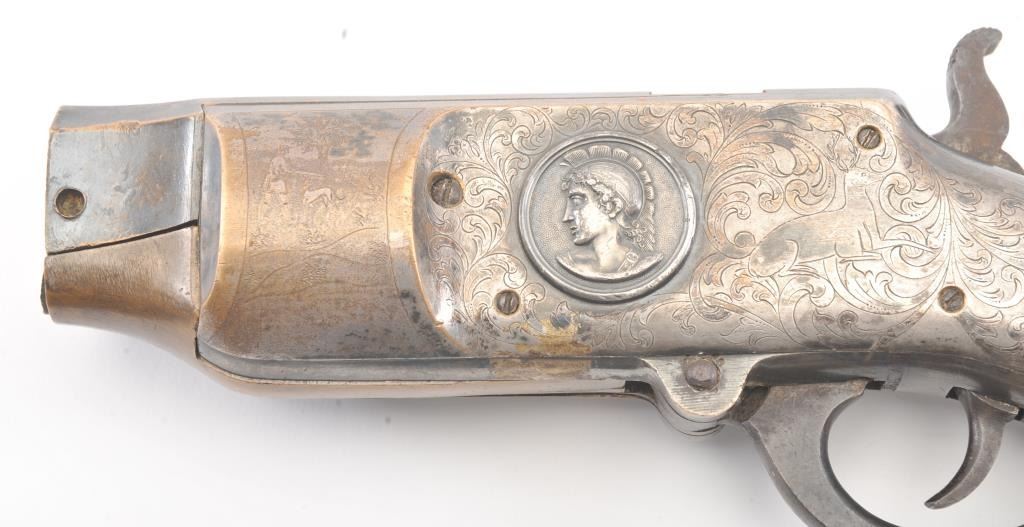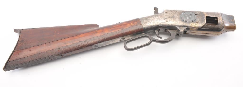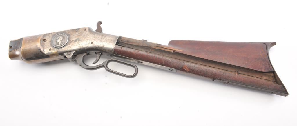 Brass frame lever action prototype or incomplete display or patent model that is exhibition quality engraved with silver overlaid plaques resembling ancient coins. Attributed to Fogarty Repeating Rifle Co. ofBoston, Mass. Who were bought out by Winchester and closed out as to not compete with the Henry and ’66 Winchester products. (Refer Flayderman 9B-049). This particular example was in the old time collection ofMark Aziz (Rutgers Book Center) New Jersey. It is considerably more refined then the two other examples which have a military appearance and this example is more similar to a Henry. The stock was made in sectionsand the arm appears to never been completed. Showing action function was its purpose. It fits nicely with Henry’s, Volcanic’s, 1866’s and early brass frame lever action arms. Most original silver turned black remains on theframe. (Antique) Est.: $5,000-$10,000