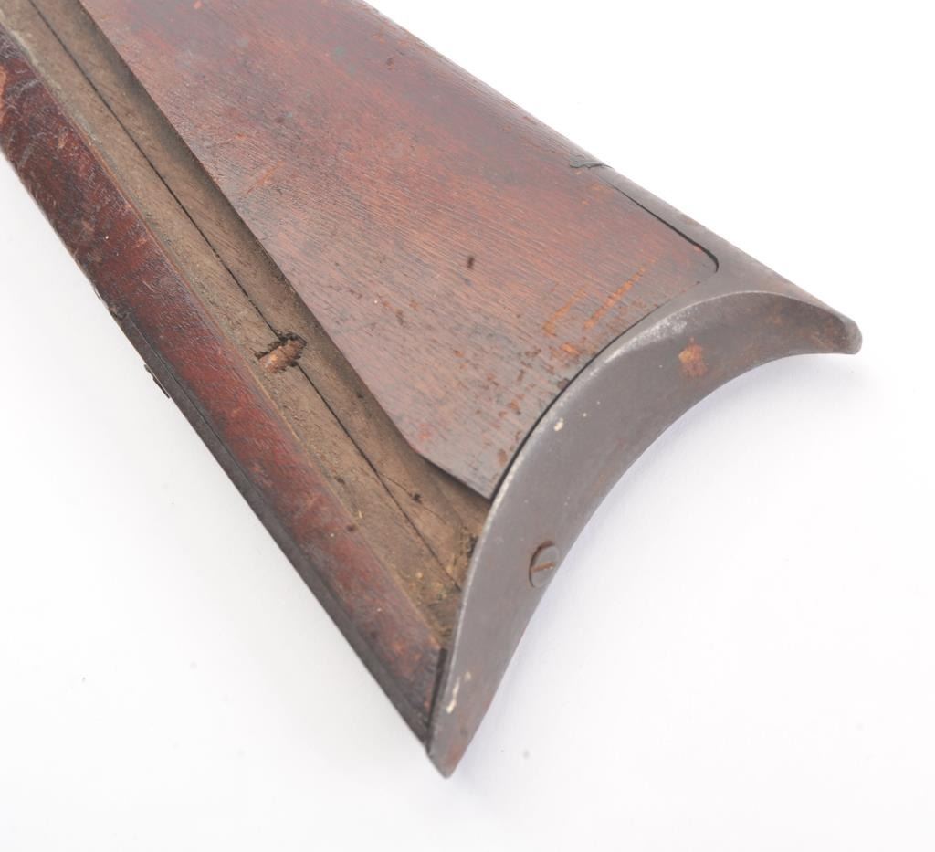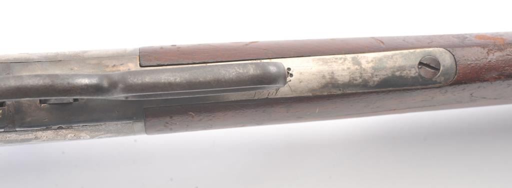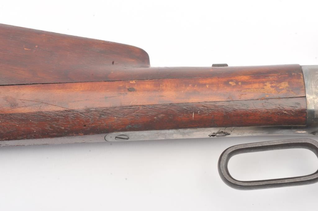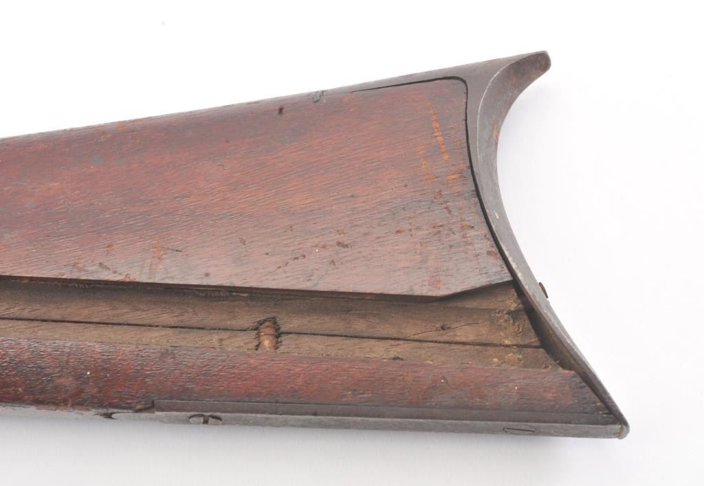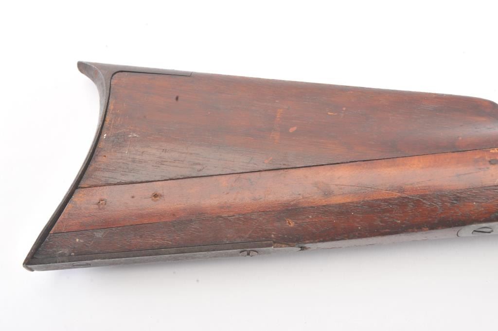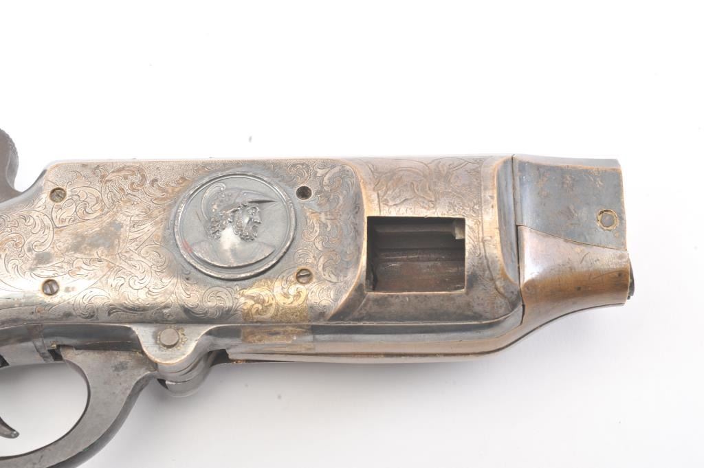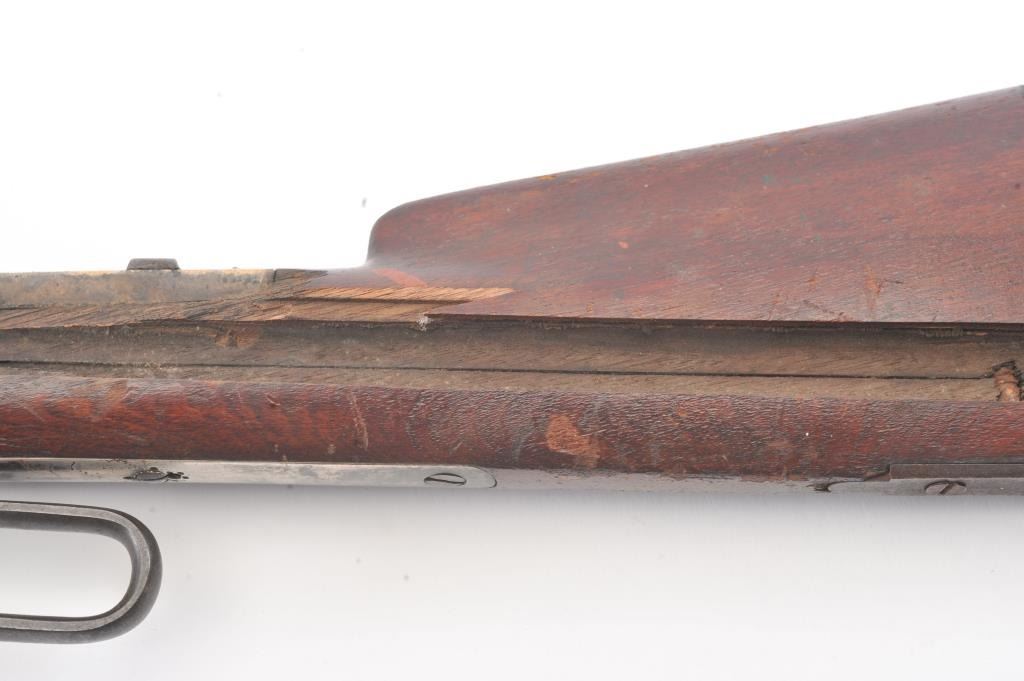 Brass frame lever action prototype or incomplete display or patent model that is exhibition quality engraved with silver overlaid plaques resembling ancient coins. Attributed to Fogarty Repeating Rifle Co. ofBoston, Mass. Who were bought out by Winchester and closed out as to not compete with the Henry and ’66 Winchester products. (Refer Flayderman 9B-049). This particular example was in the old time collection ofMark Aziz (Rutgers Book Center) New Jersey. It is considerably more refined then the two other examples which have a military appearance and this example is more similar to a Henry. The stock was made in sectionsand the arm appears to never been completed. Showing action function was its purpose. It fits nicely with Henry’s, Volcanic’s, 1866’s and early brass frame lever action arms. Most original silver turned black remains on theframe. (Antique) Est.: $5,000-$10,000