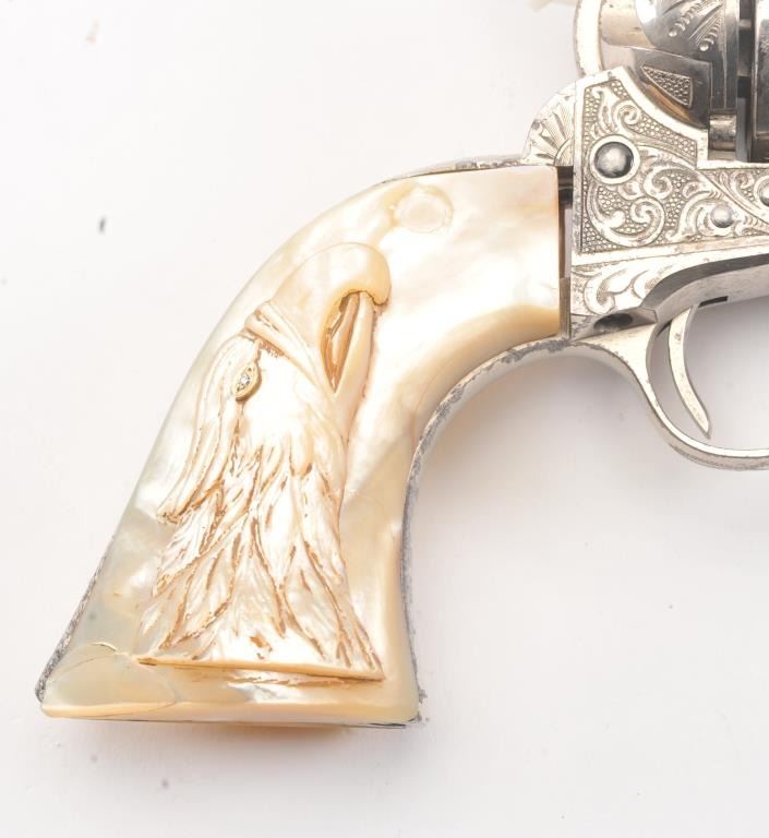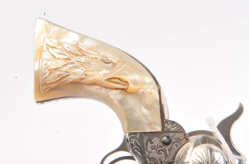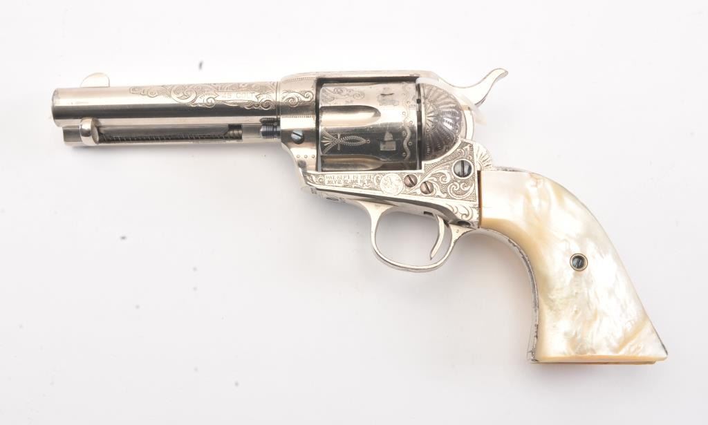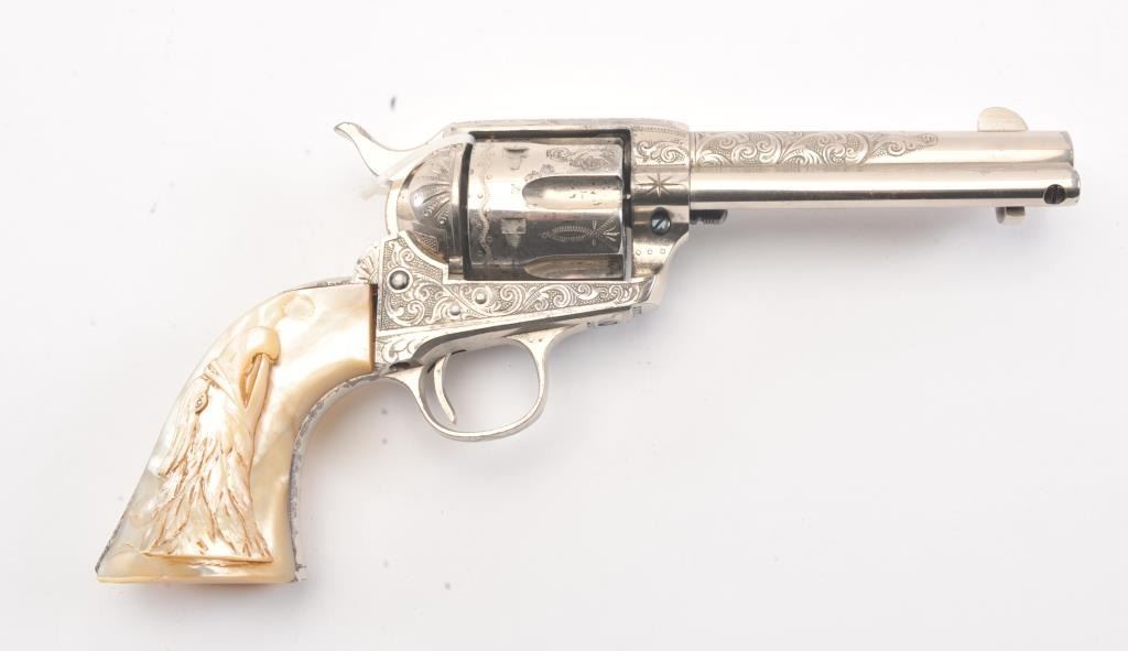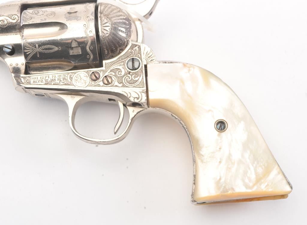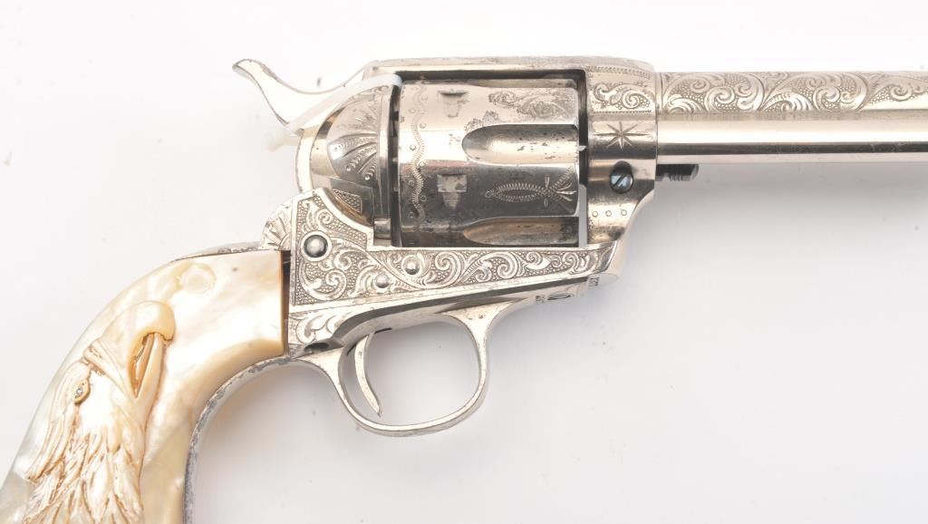Colt SAA factory engraved with carved eagle grips set with diamond eye, S/N 278771. Factory letter confirms factory engraved, nickel finish, .45 caliber with 4 ¾” barrel, shipped to H&D Folsom Arms, New York, NewYork, June 18, 1906 with 1 gun in shipment. This Colt remains in excellent original condition retaining the majority of its original finish. Very slight aging and 95%-98% plus estimated original nickel. Crisp and sharp edges and markings. The grips are not listed but definitely period and possibly supplied by Folsom. The grips are beautifully carved and fit well with iridescent rainbow hues with quality carving. The eye is set with a small diamond in jeweler made gold bezel. The bore is bright and the front sight is its unaltered and full original heights. A 9 plus on a 1-10 collector’s scale from an award winning Coltcollection. (C&R/No PPT) Est.: $40,000-$80,000