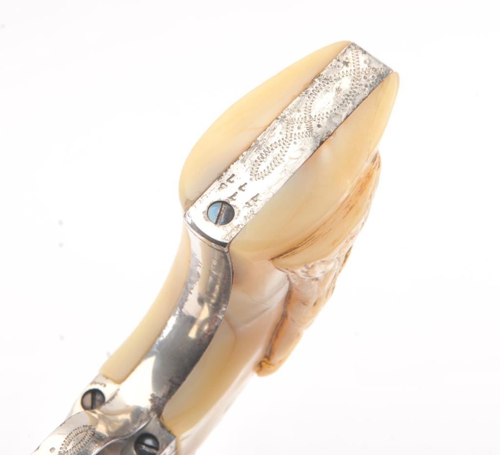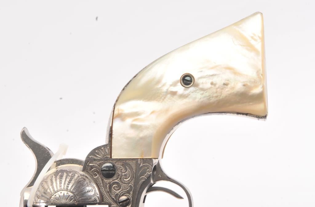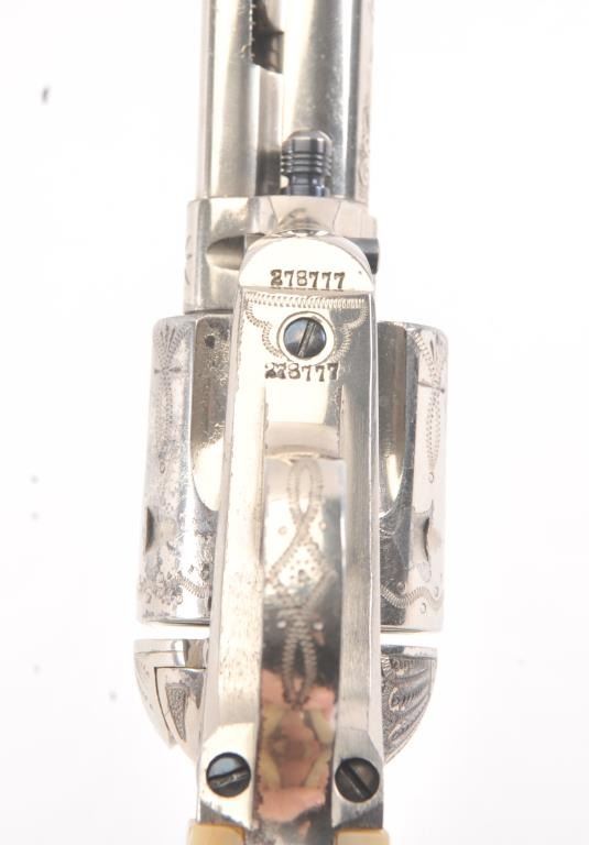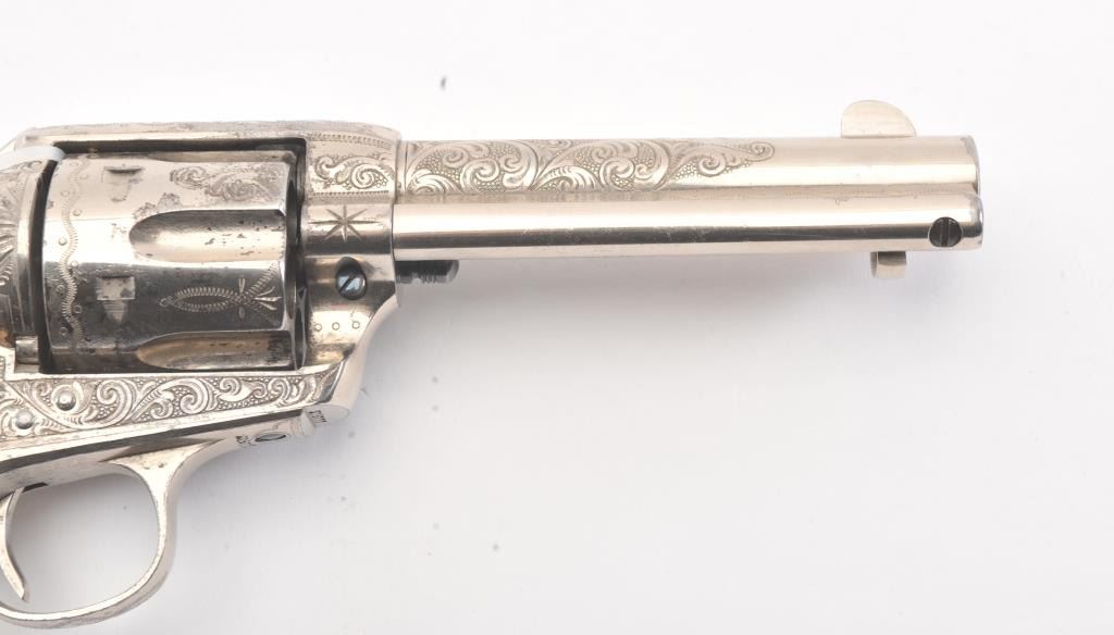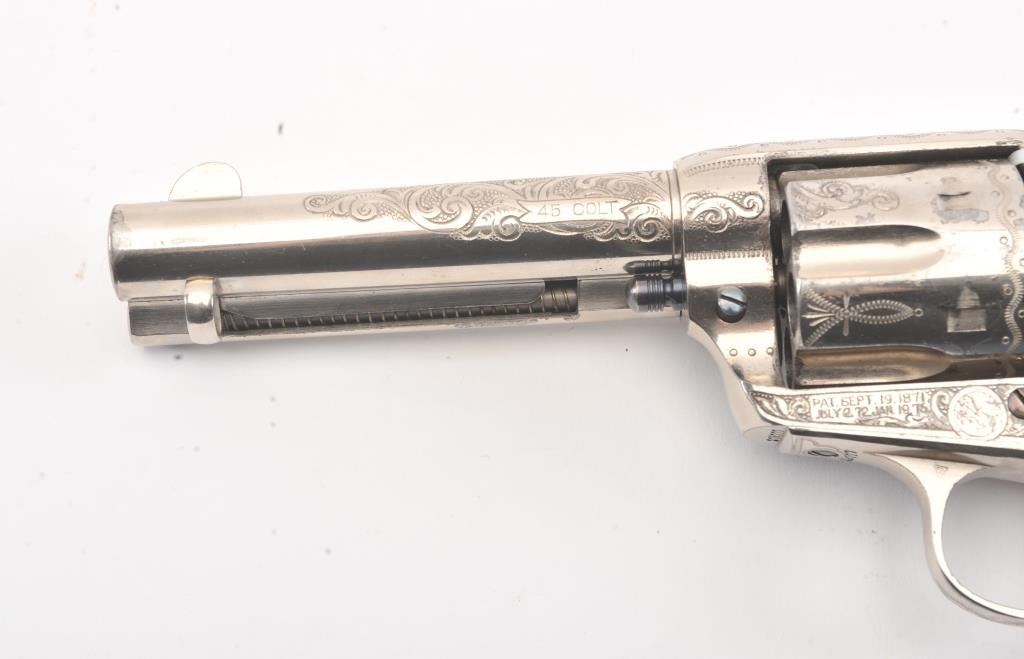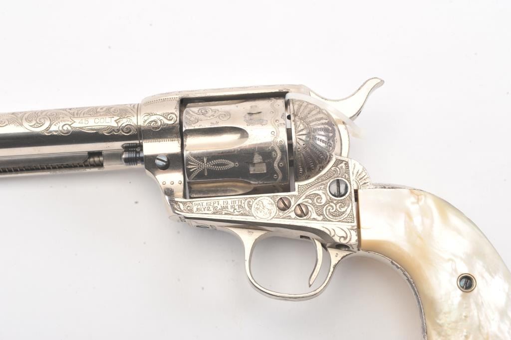Colt SAA factory engraved with carved eagle grips set with diamond eye, S/N 278771. Factory letter confirms factory engraved, nickel finish, .45 caliber with 4 ¾” barrel, shipped to H&D Folsom Arms, New York, NewYork, June 18, 1906 with 1 gun in shipment. This Colt remains in excellent original condition retaining the majority of its original finish. Very slight aging and 95%-98% plus estimated original nickel. Crisp and sharp edges and markings. The grips are not listed but definitely period and possibly supplied by Folsom. The grips are beautifully carved and fit well with iridescent rainbow hues with quality carving. The eye is set with a small diamond in jeweler made gold bezel. The bore is bright and the front sight is its unaltered and full original heights. A 9 plus on a 1-10 collector’s scale from an award winning Coltcollection. (C&R/No PPT) Est.: $40,000-$80,000