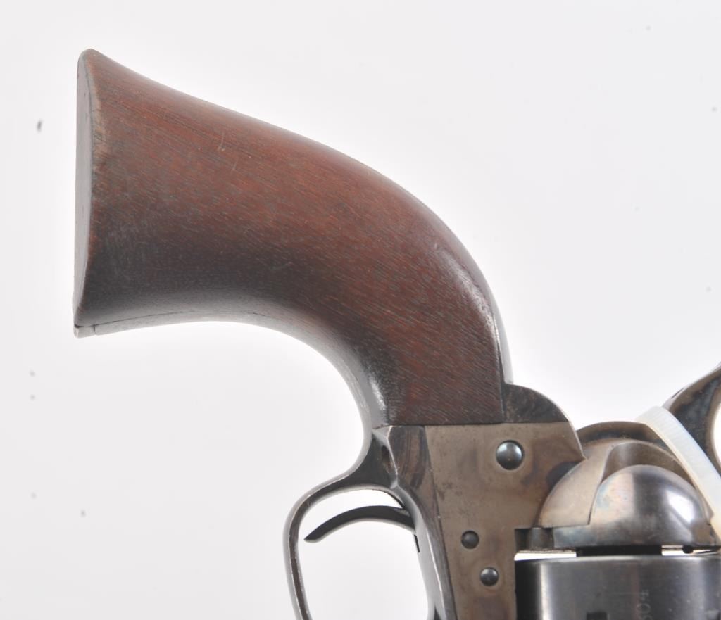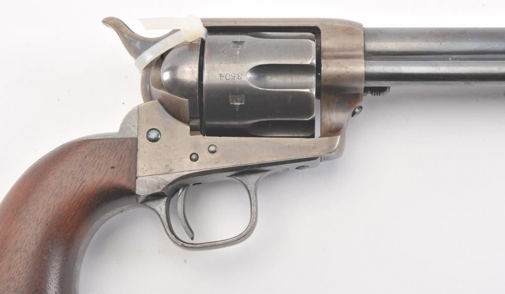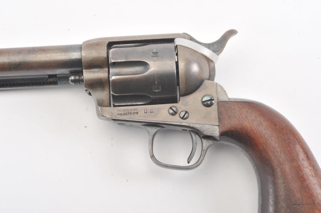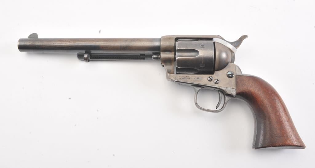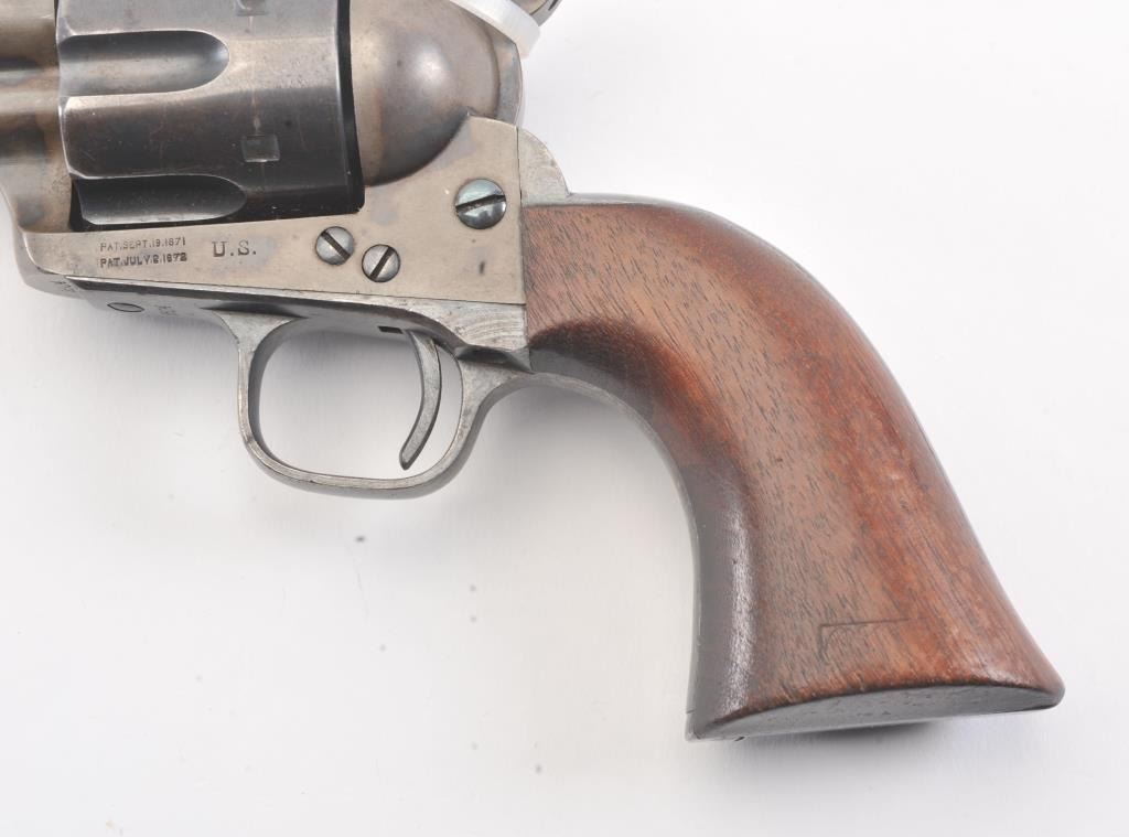 Colt Single Action Army Revolver Cavalry Series showing U.S. marking and Ainsworth inspections in .45 Colt caliber with a 7 ½” barrel, S/N 3504. Kopec letter states “Date of manufacture is 1874 and likely 4th Cavalry issued at Fort Kerville, Fort McKavett, Fort Clark, Fort Felipe, Fort Concho and also the troops “In the field” during the era of Kawana Parker and Indian Wars”. Kopec also states this revolver was issued early enoughfor use Sept. 26-28th 1874 on the Red River near Palo Duro Canyon, Texas and other subsequent skirmishes throughout Texas. Also that the ejector tube is numbered and matching. Kopec further lists the following;“Subject revolver remains in unfired condition” 1. Hammer A. Hammer modified “Sharp Edges” B. Marring of the surface areasC. Firing pin changed 2. Grips replaced A. Appear undersized B. Cartouchea facsimilie C. Butt stamp not correct