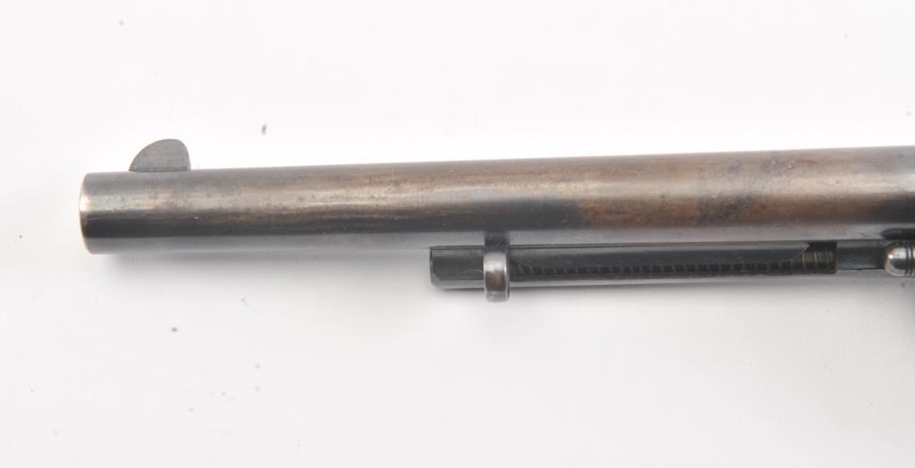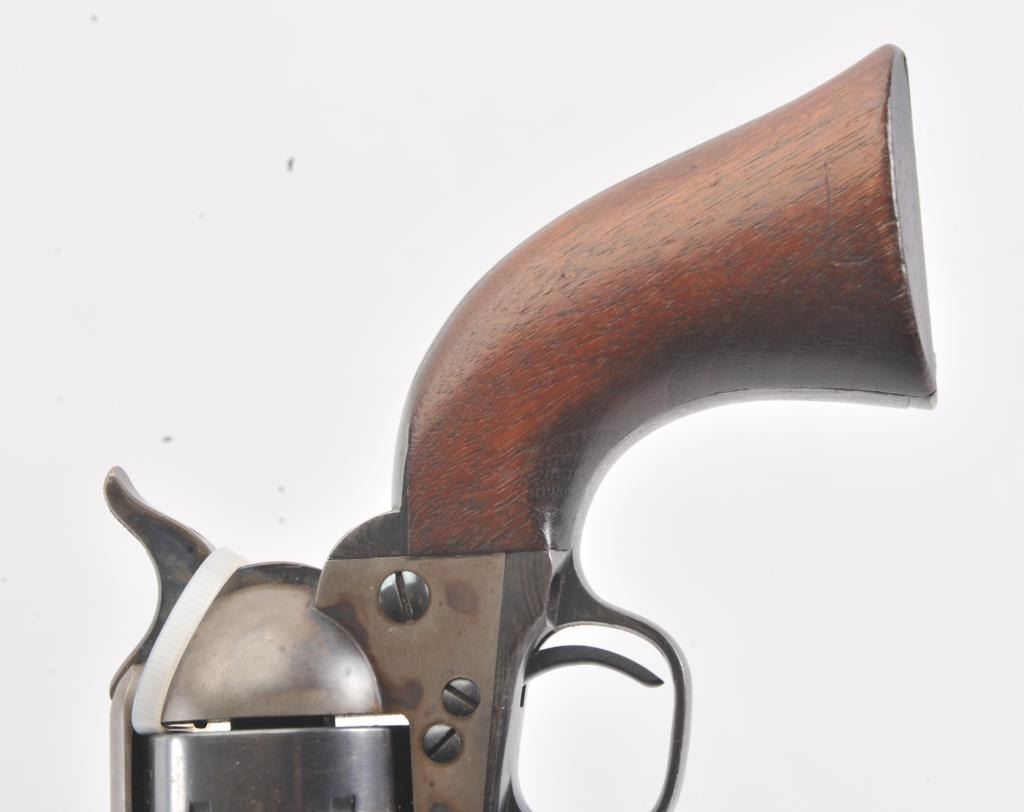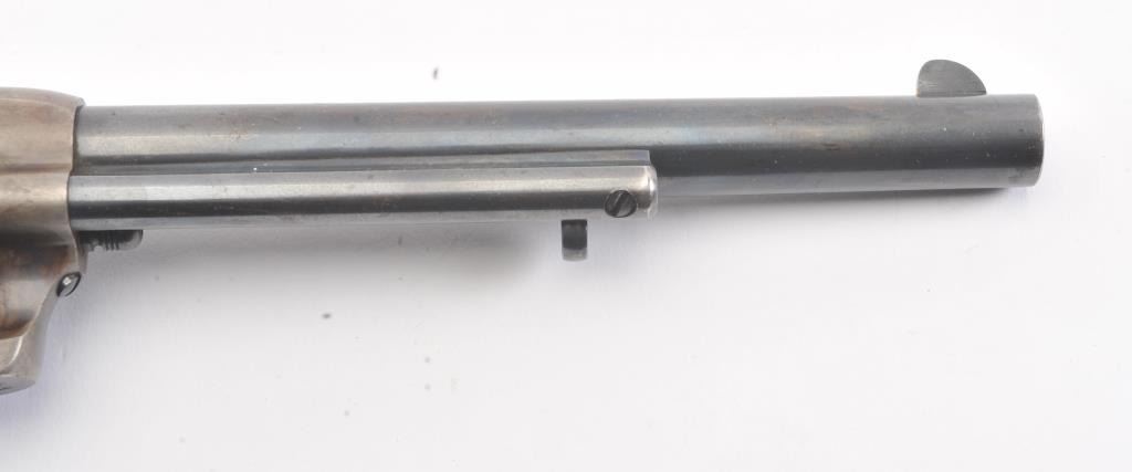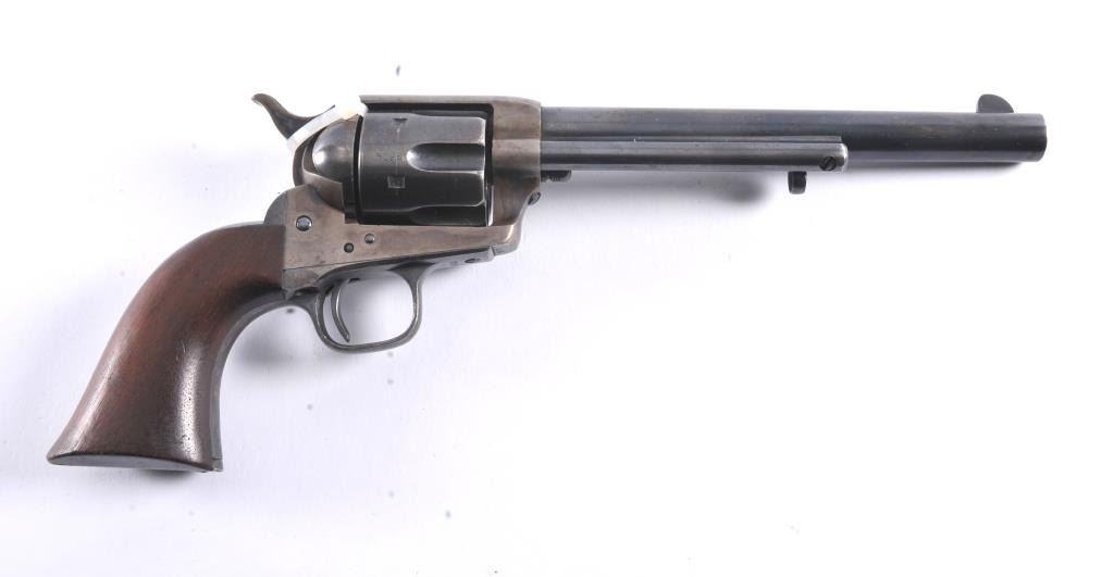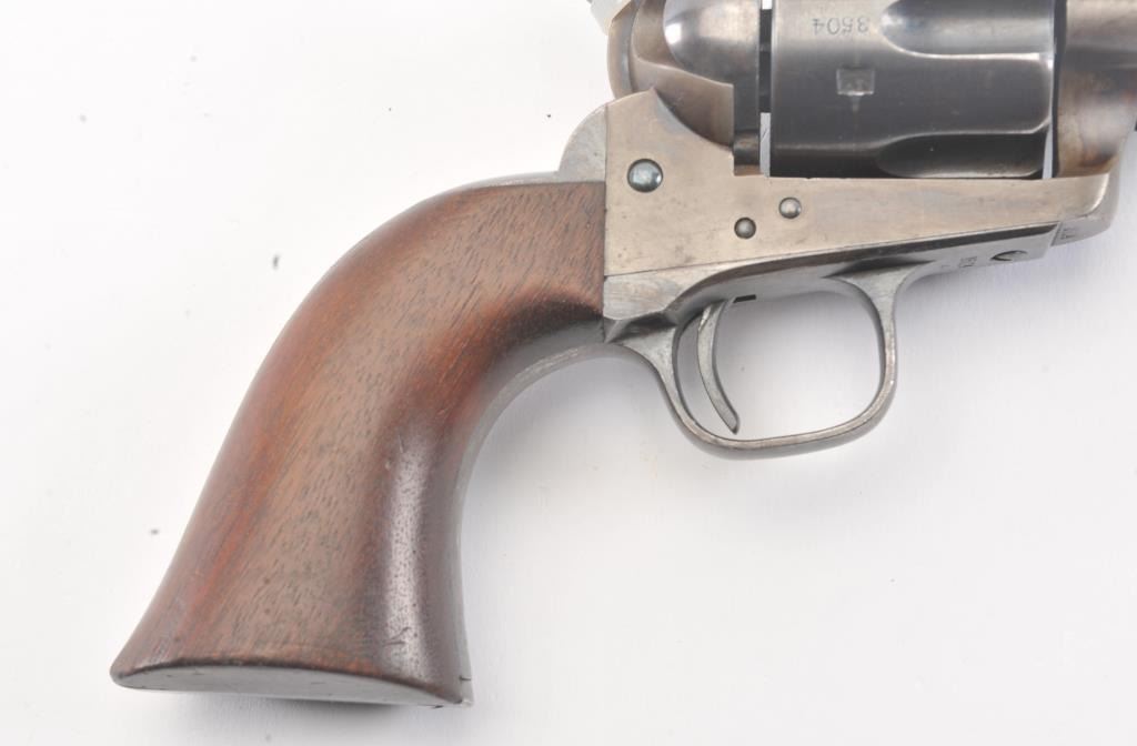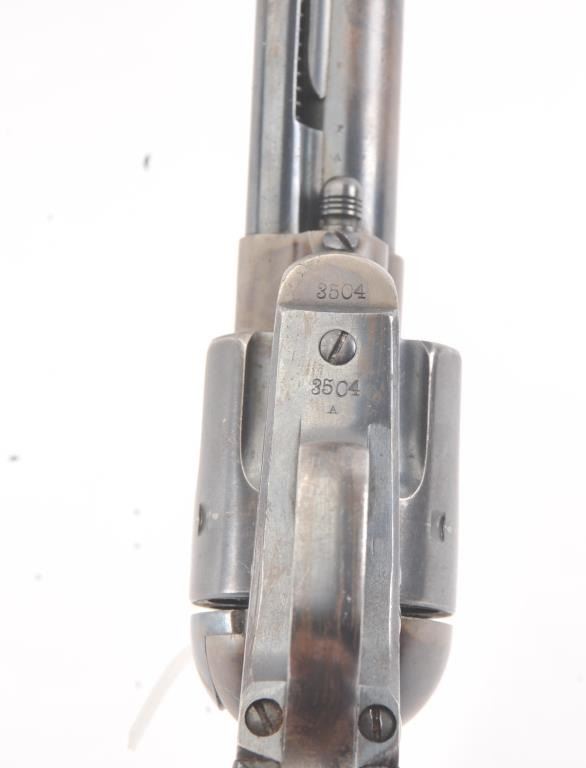 Colt Single Action Army Revolver Cavalry Series showing U.S. marking and Ainsworth inspections in .45 Colt caliber with a 7 ½” barrel, S/N 3504. Kopec letter states “Date of manufacture is 1874 and likely 4th Cavalry issued at Fort Kerville, Fort McKavett, Fort Clark, Fort Felipe, Fort Concho and also the troops “In the field” during the era of Kawana Parker and Indian Wars”. Kopec also states this revolver was issued early enoughfor use Sept. 26-28th 1874 on the Red River near Palo Duro Canyon, Texas and other subsequent skirmishes throughout Texas. Also that the ejector tube is numbered and matching. Kopec further lists the following;“Subject revolver remains in unfired condition” 1. Hammer A. Hammer modified “Sharp Edges” B. Marring of the surface areasC. Firing pin changed 2. Grips replaced A. Appear undersized B. Cartouchea facsimilie C. Butt stamp not correct