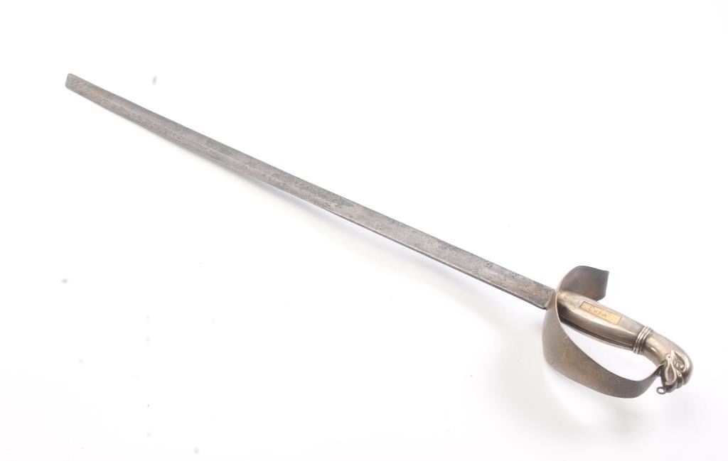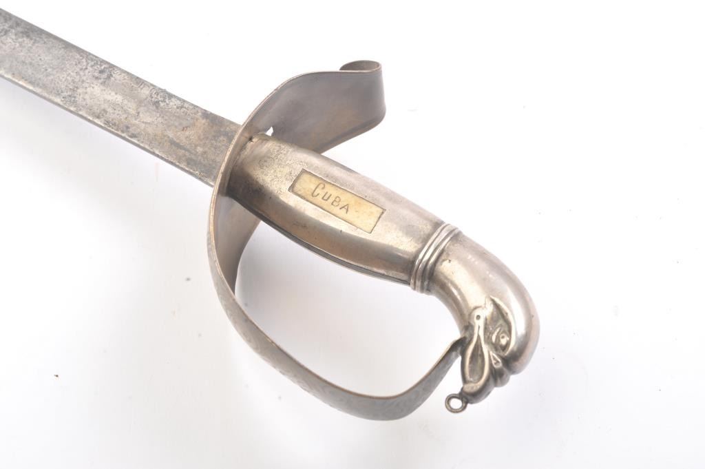 Silver hilted cutless in Spanish style with eagle head pommel. Two tone panel inset in the manufacture one on each side of the grip and inscribed “General Marmol” and “Cuba”. Donato Marmol Tamayo was key in the Lot Title liberation of Cuba from Spain in the early 19th century. He is a true hero of Cuba and monuments to him exist on the island although the communists down play his historic significance and his role in Independence.Lot Title Measures 33” overall with a 27 ½” blade. Good as found condition and authentic. “Viva Cuba Libre!” Est.: $2500-$5000