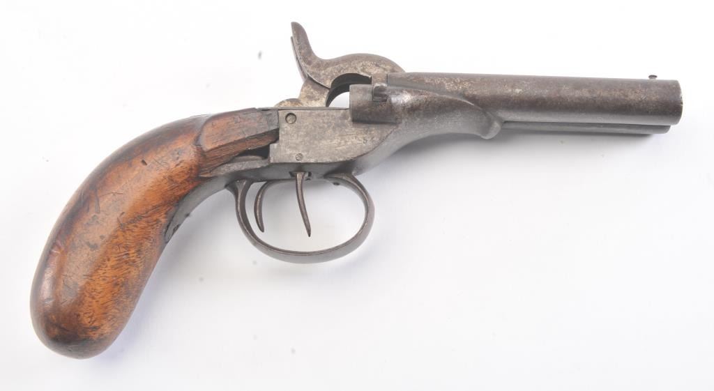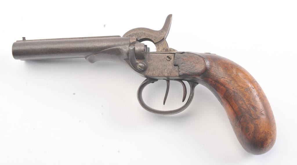 Double Barrel Pinfire Pistol of central European manufacturing circa about 1850s-60s. Measures 9 ½” overall with a 4 3/8” barrels of approximately 9mm smoothbore pinfire. The action works well. Brown patina. The gripshave 1 large chip and loss but otherwise good. (Antique) Est.: $150-$300