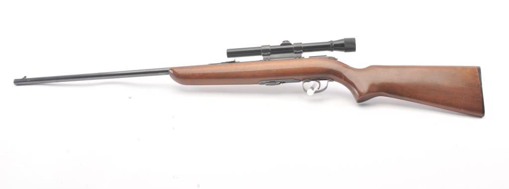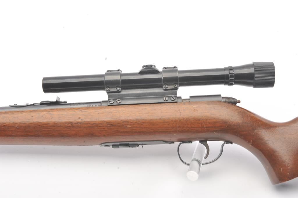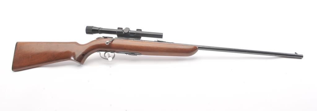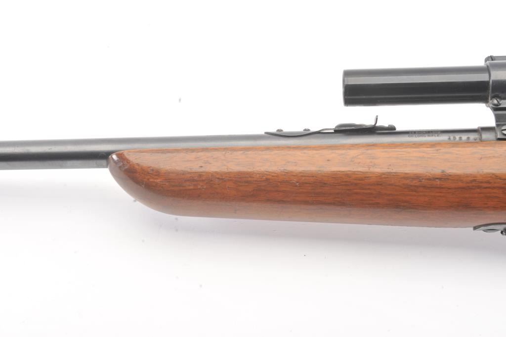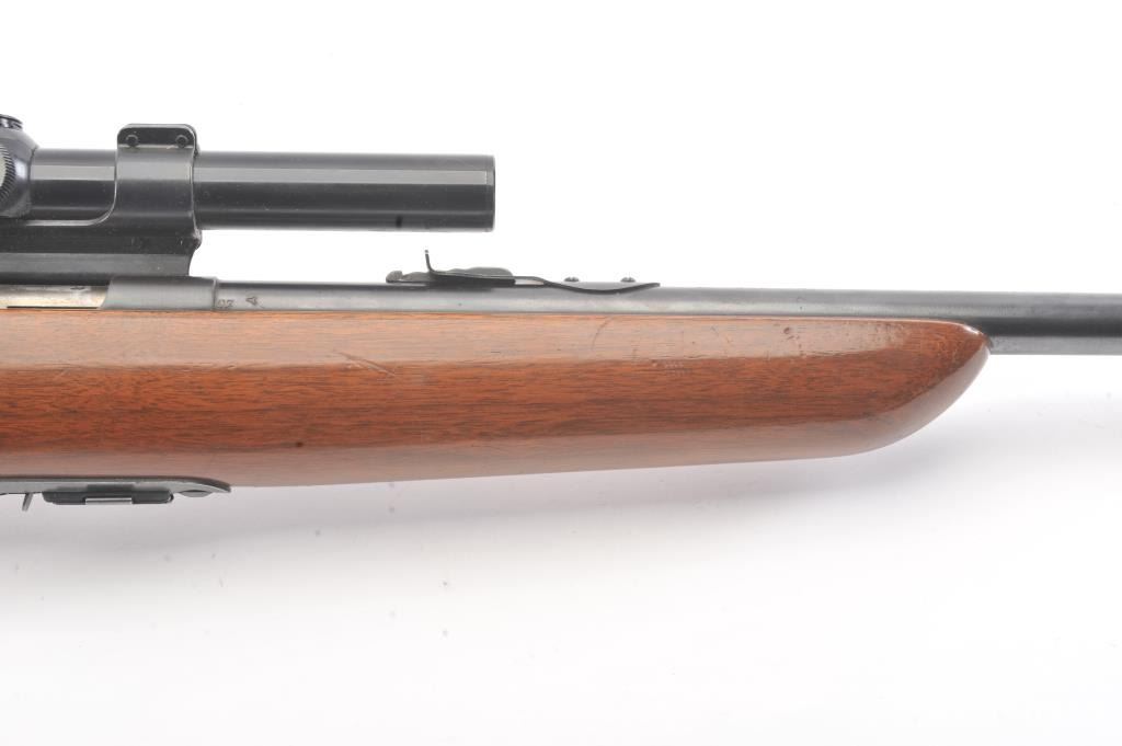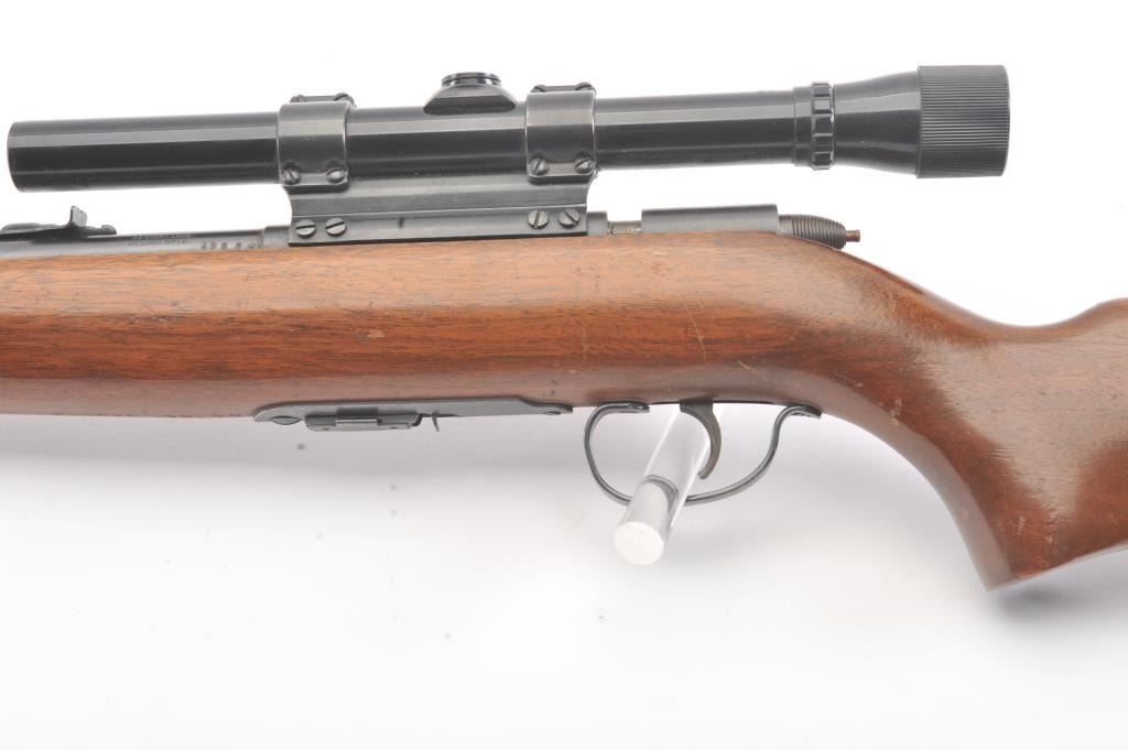 Remington Scoremaster 511 Semi-Auto rifle in .22 S, L, L.R. with Weaver scope on N3 mount. Very good plus with 85%-95% blue with minor scratches at the losses mostly near the muzzle. The stock is also very good withsmall scratches, dings, and mars. Good mechanically with bright bore. (C&R) Est.: $150-$300