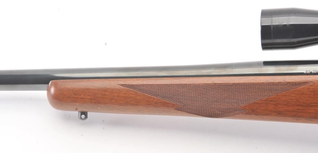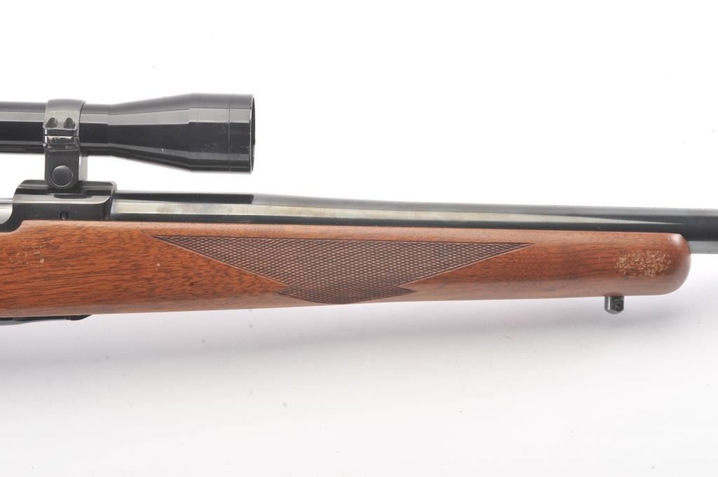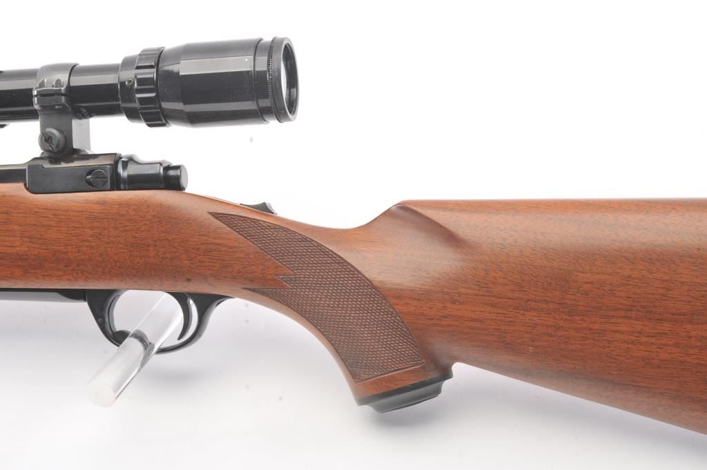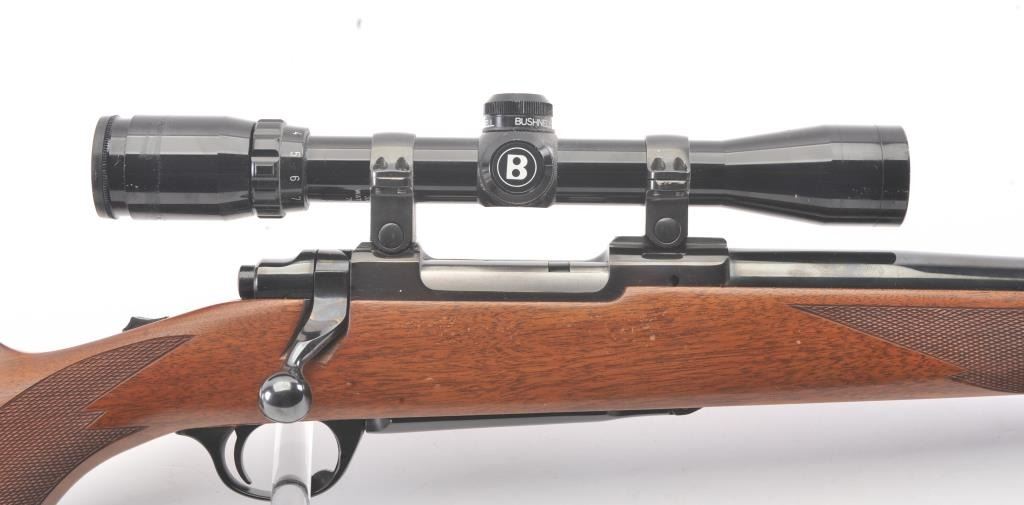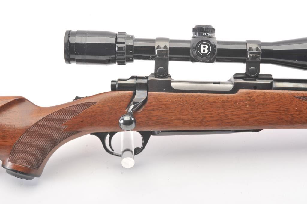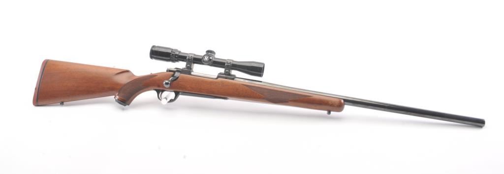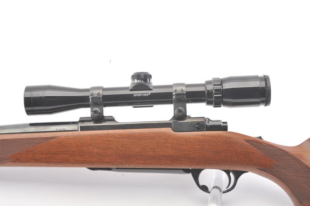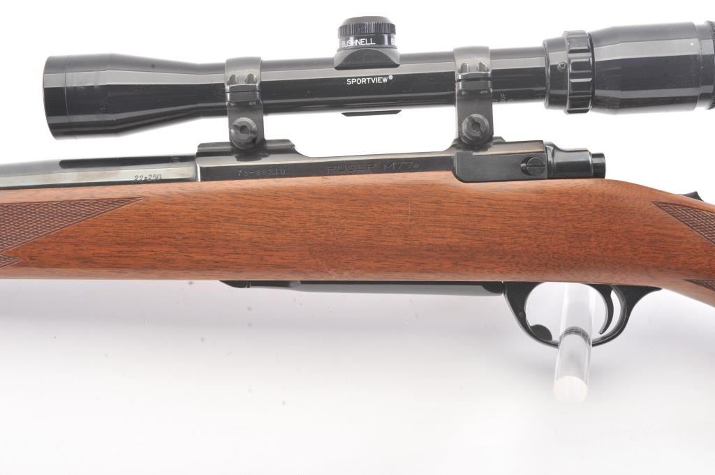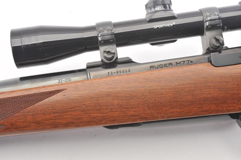 Ruger Model 77 Bolt Action Rifle with factory Semi-Heavy 24” barrel in .22-250 caliber mounted with Bushnell 3x9 Scope on factory bases. S/N 78-86210. Ruger rubber butt plate. Near fine used condition with minor storagescratches in the stock. (Modern) Est.: $350-$700