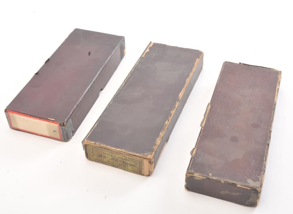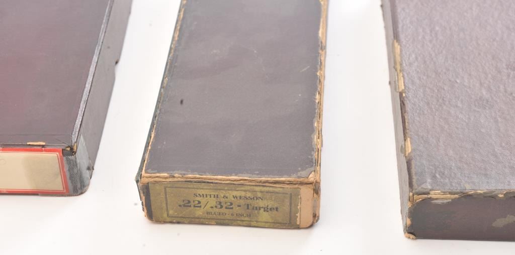Lot of 3 vintage S&W gun boxes: 1. 22/32 Target, 6”, Blue, Fair to good with normal aging. 2. Hand ejector .32 Nickel, 6”. Fair to good with tatters, loss and taping.3. 4” M&P square butt blued. Taped at end with tatters. Est.: $150-$300