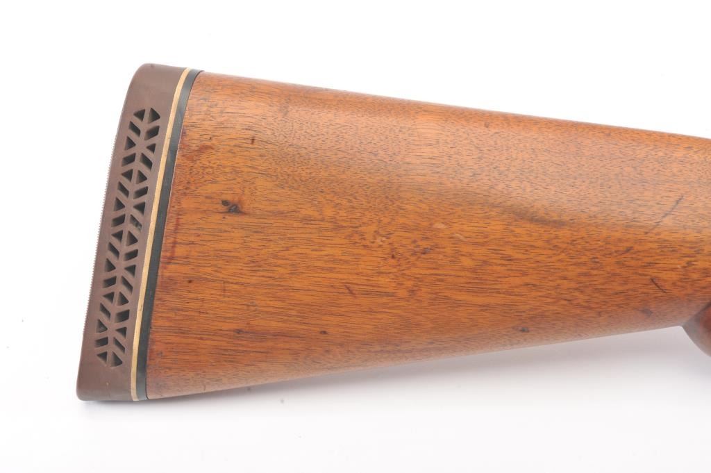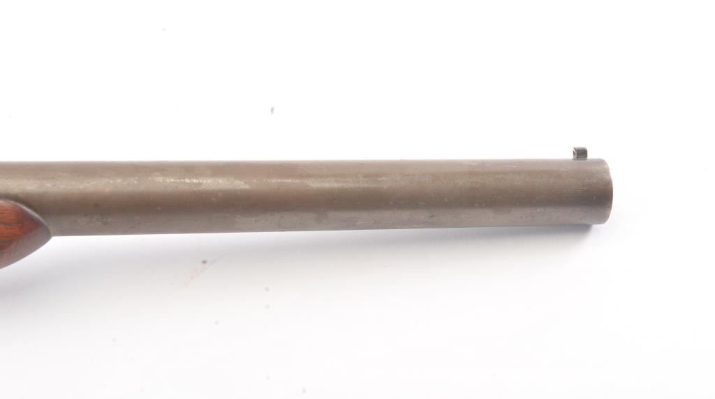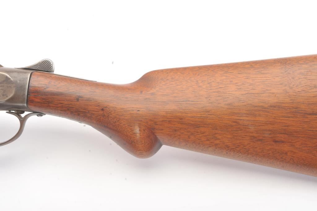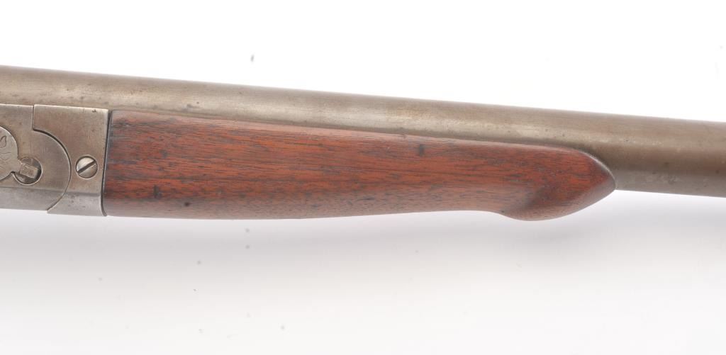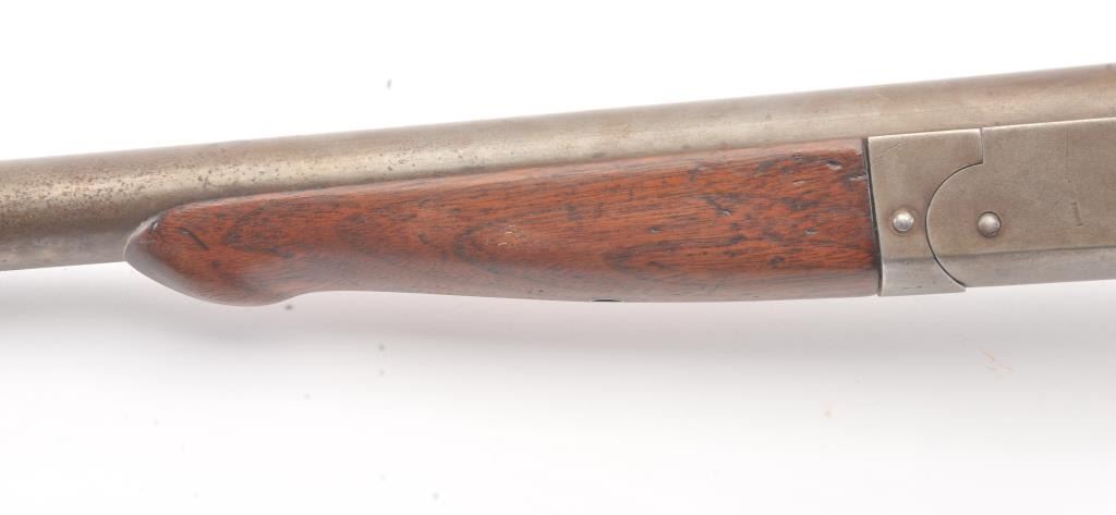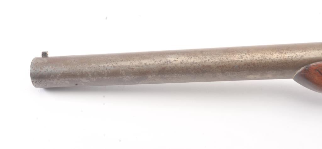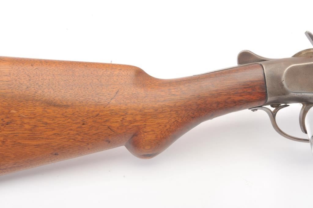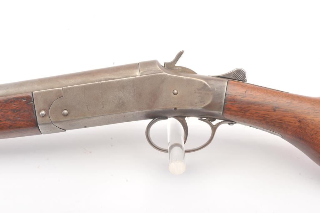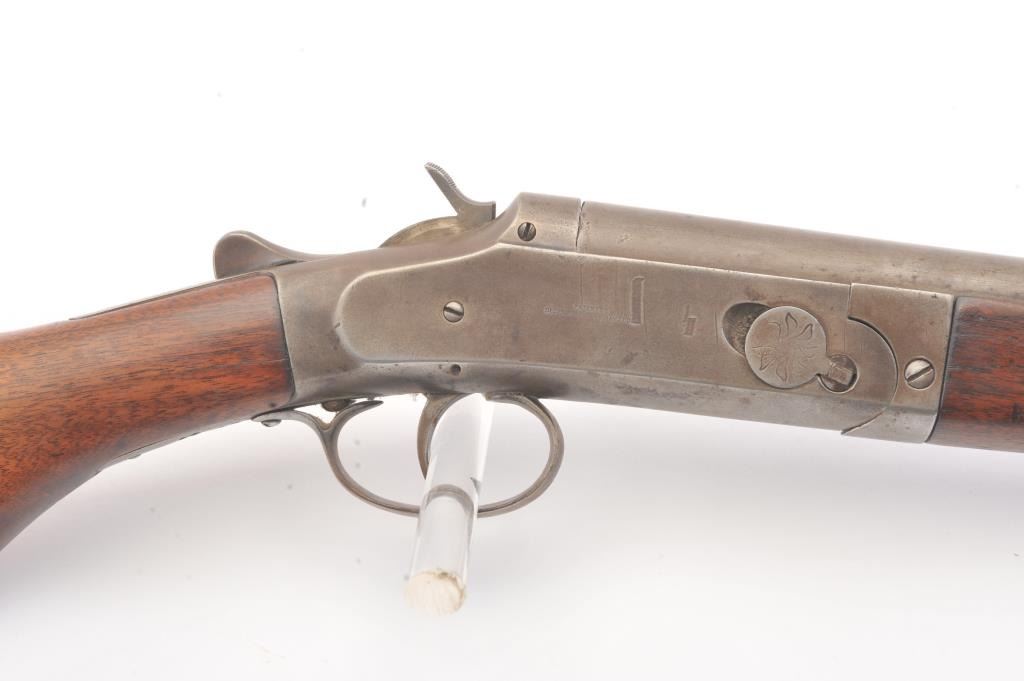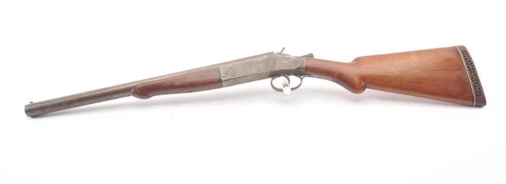 Hopkins & Allen single shot shotgun, 12 gauge, Serial #45. The shotgun is in good overall condition with an 18” barrel. The metal surfaces have all gone to brown patina with light surface erosion noted I areas.The barrel has been shortened and an ivory bead front sight has been added during the period of use. The smooth wood stock is in good condition with a ventilated rubber pad providing a 14 ½” LOP. The bore is fair, the action functions and the markings are legible. Est.: $125-$250. (C+R).