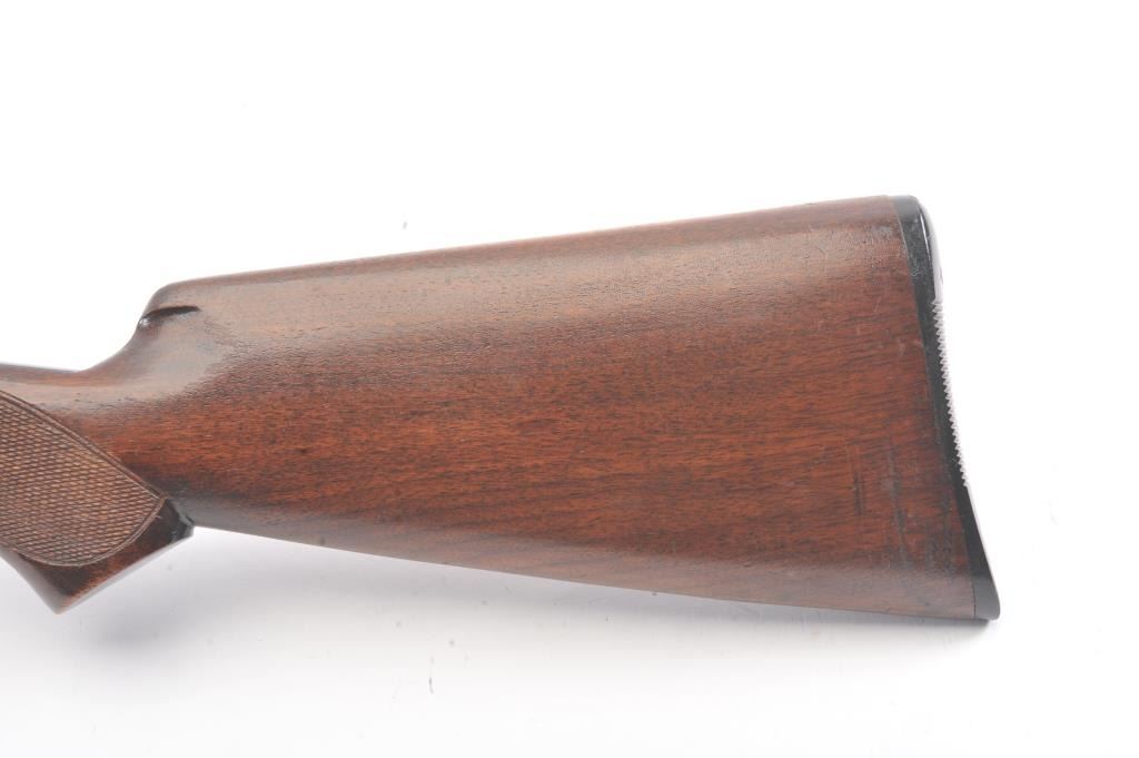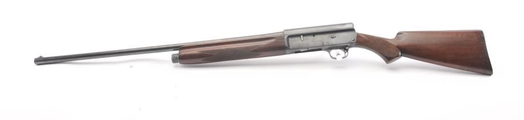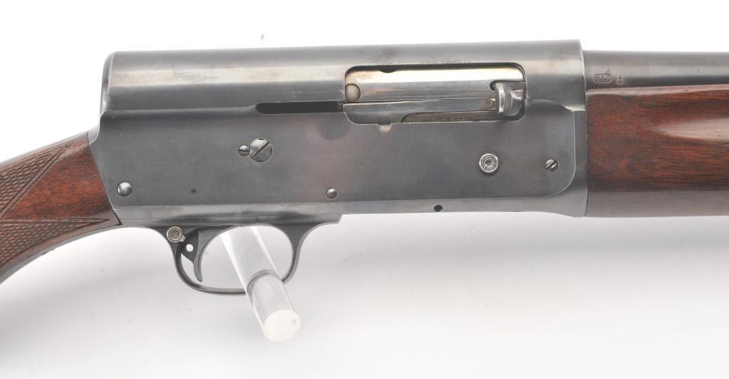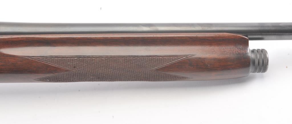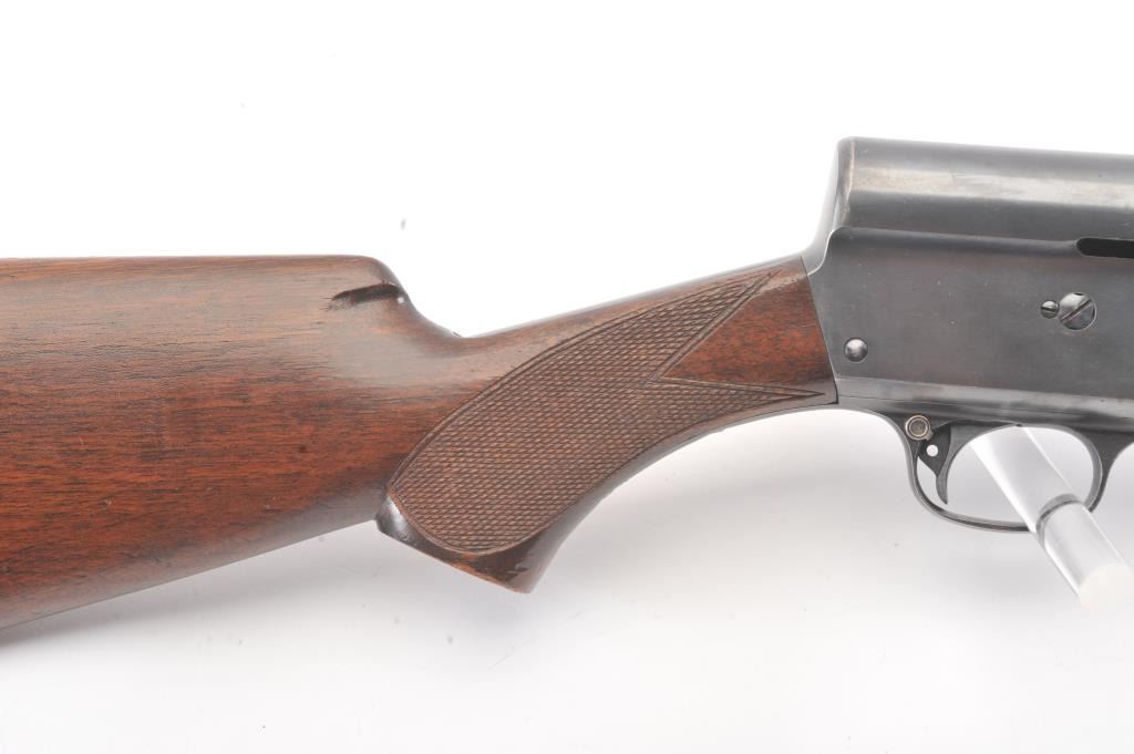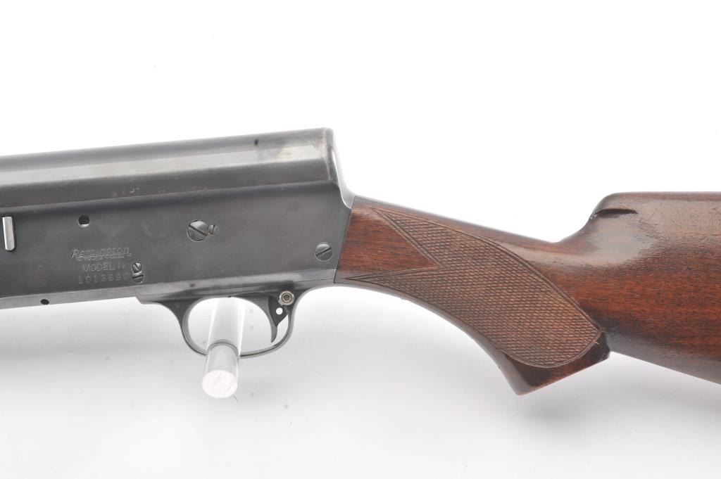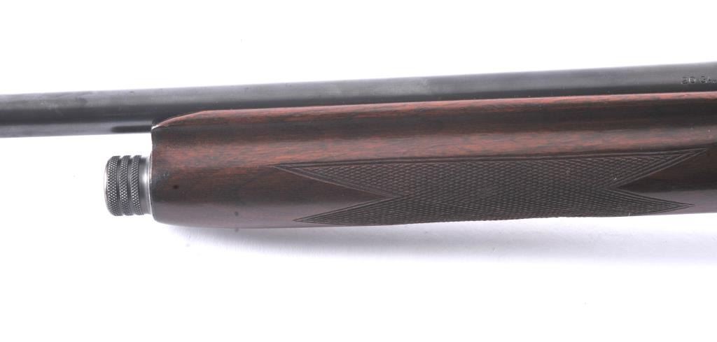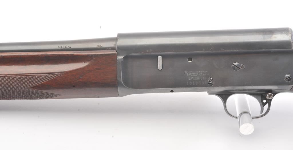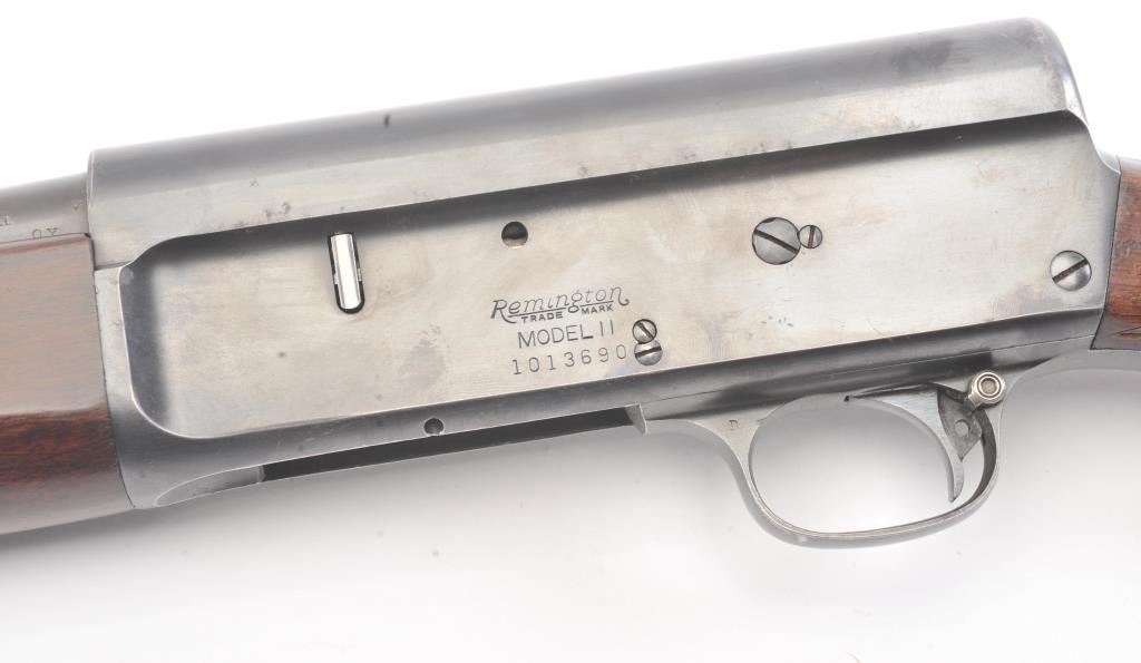 Remington model 11 semi auto shotgun, #1013690 , 20 Ga., 28" full choke barrel, blued finish, checkered walnut stock, with plastic butt pad. Shotgun is in very good condition overall, showing approximately 80%original finish. Bore is very good, action is crisp, stock is very good. Length of pull is 14 1/4". (C&R) Est. $300-600