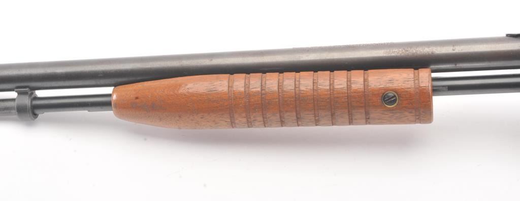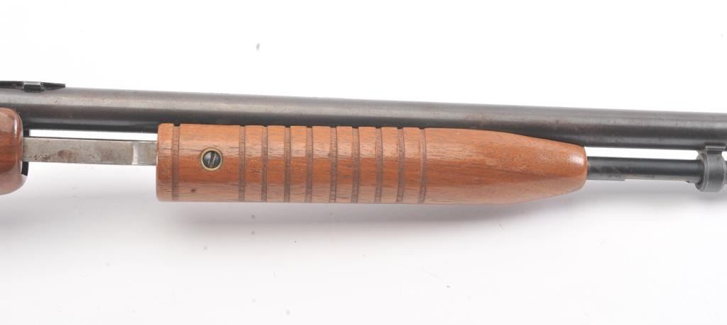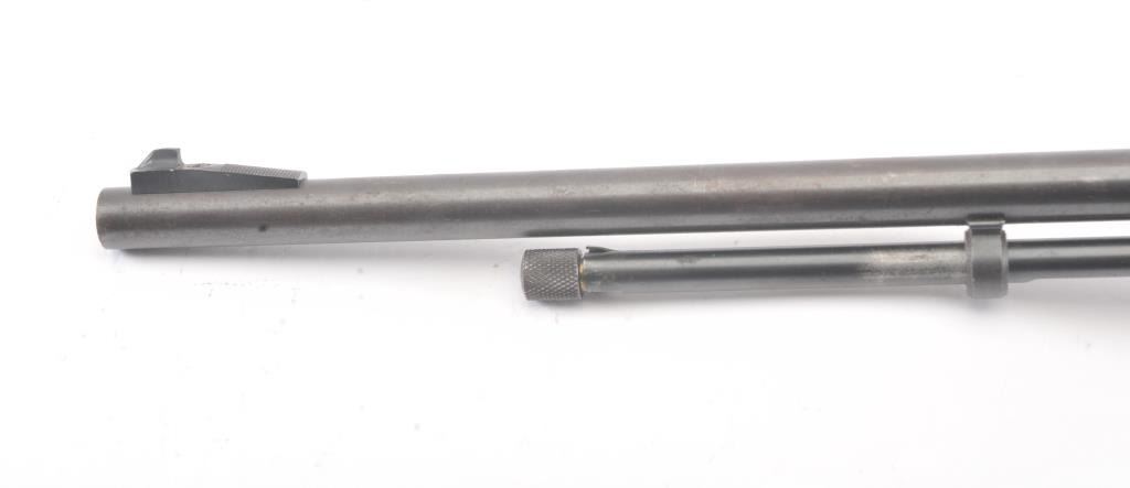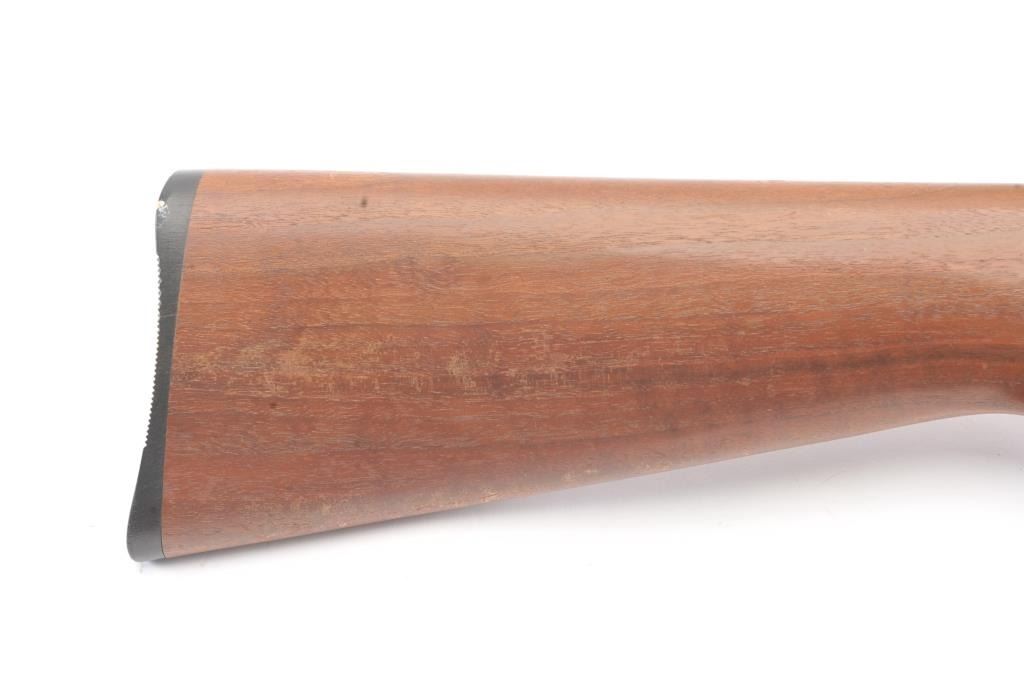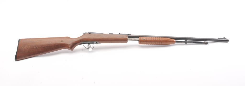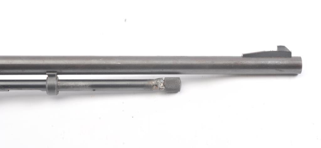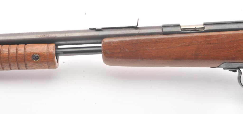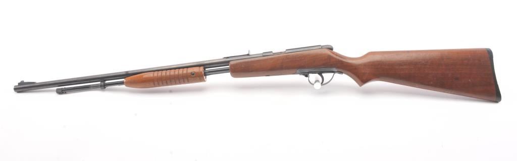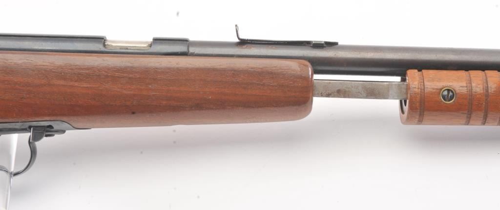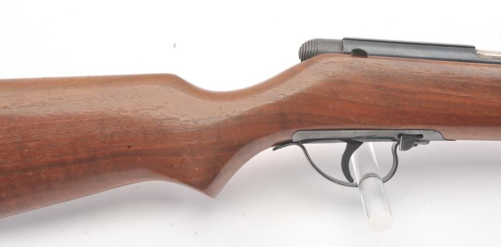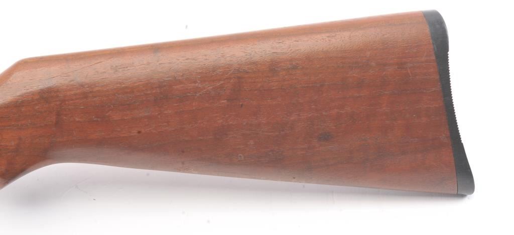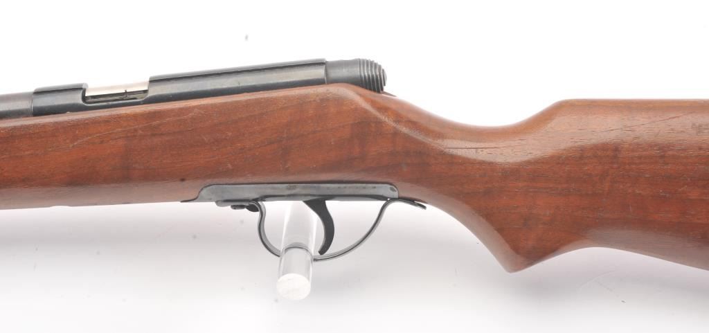 Noble model 235G, #NSNV , .22 cal., 24" barrel, blued finish, smooth walnut stock, with plastic butt plate. Rifle is in good condition overall, showing approximately 75-80% original finish. Bore is very good,action is very good, stock is near fine with slight lifting of the varnish on the right side of the butt. The magazine tube catch has been broken and repaired. (C&R) Est. $150-300