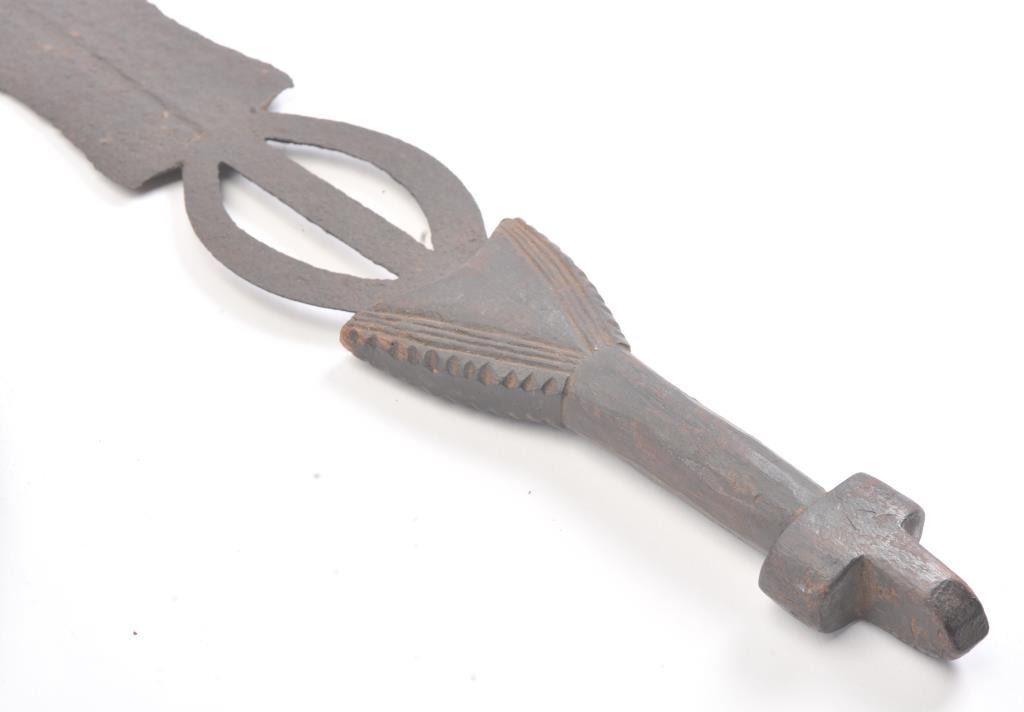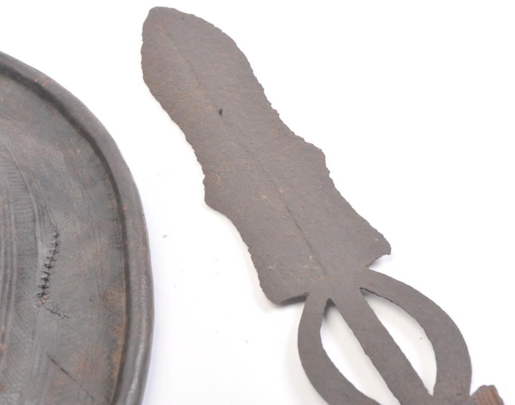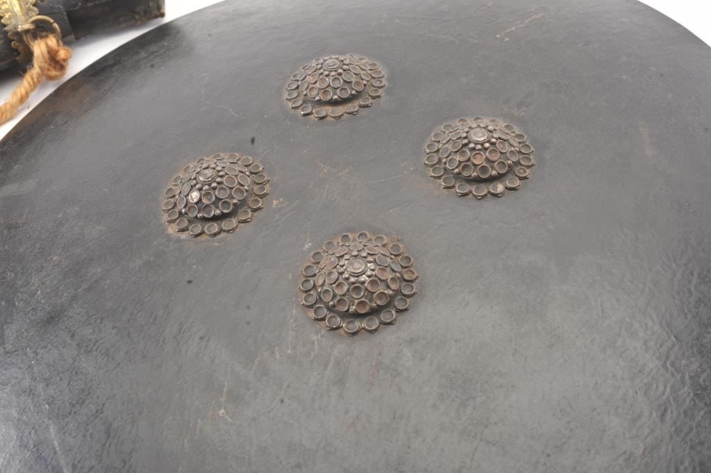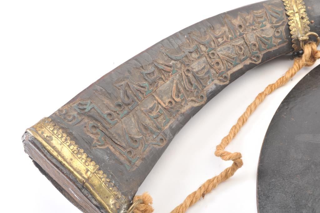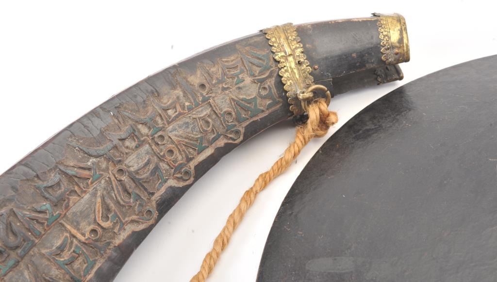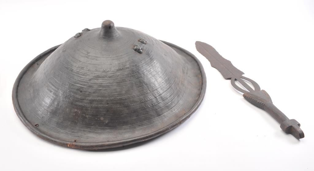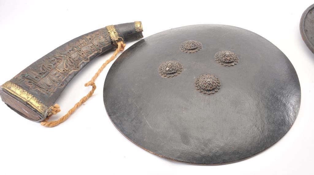 Ethnic lot of carved horn flask, 2 shields and African small sword. All authentic and turn of the century to Mid-19th century. Est.: $250-$500