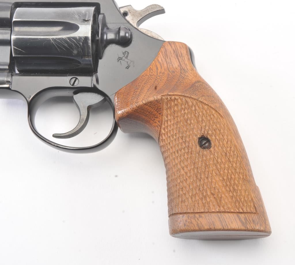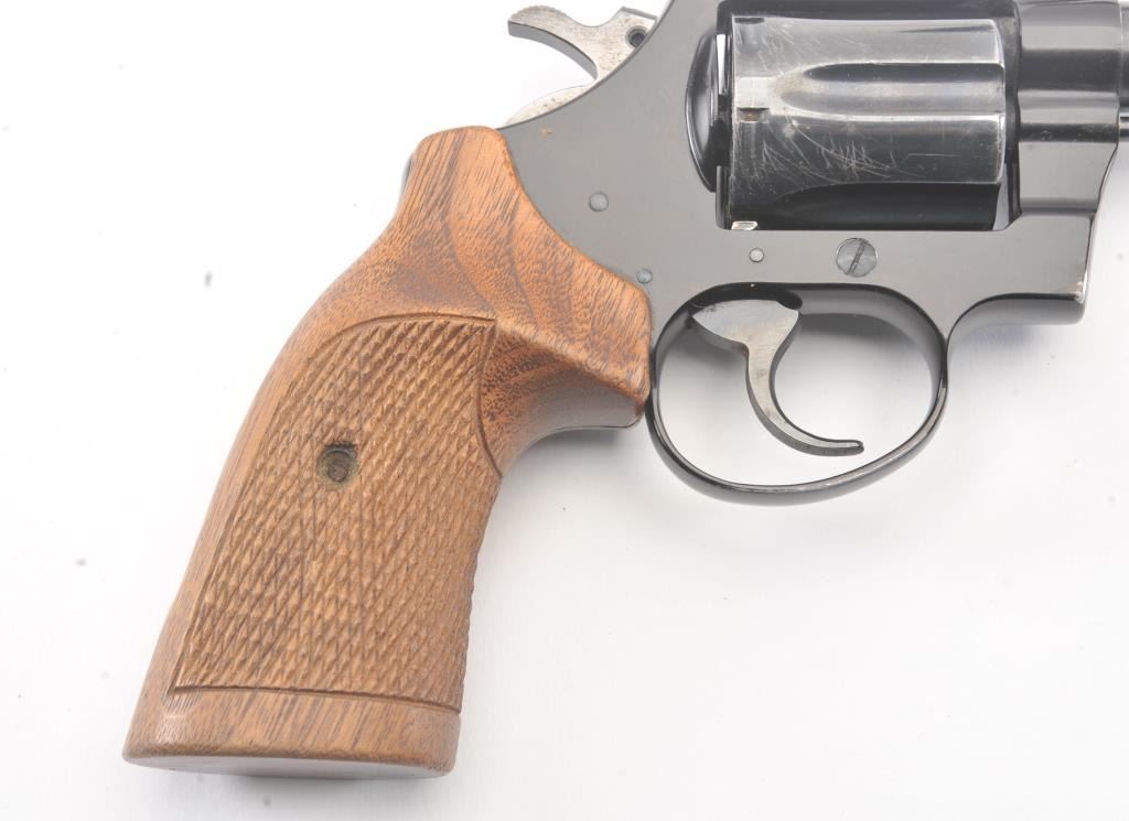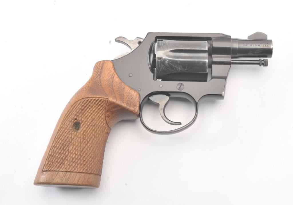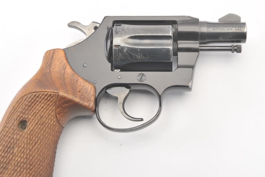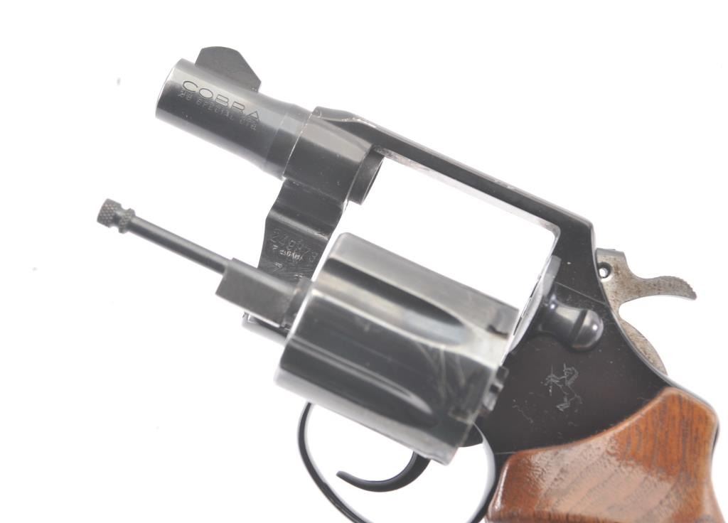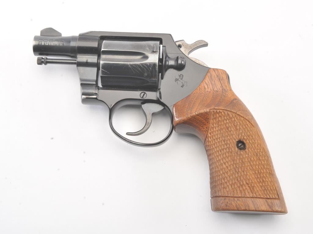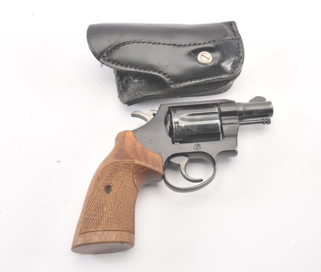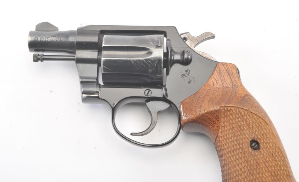 Colt Cobra .38 Special light weight revolver with a 2” barrel, custom checkered wood vintage grips and detective style holster included, S/N 249873. Very good condition with scratching caused by this holster and“Cop” style use. The snake series are rapidly increasing in value and desirability. (Modern/PPT) Est.: $400-$800