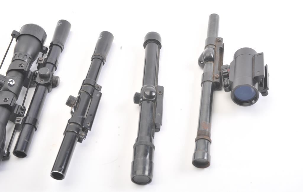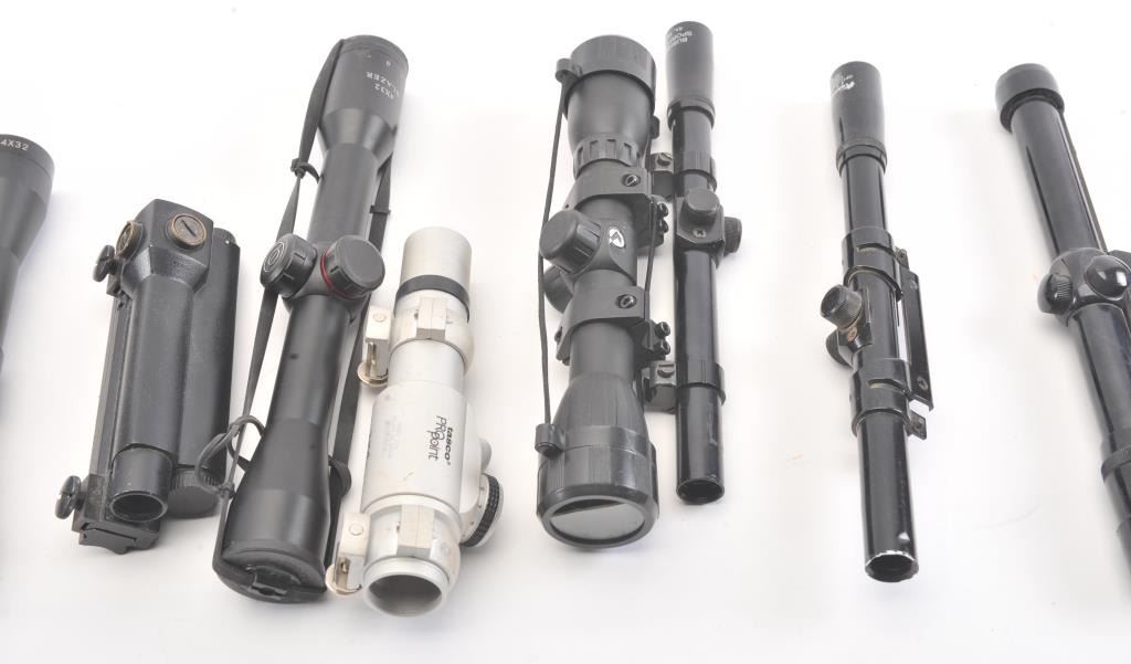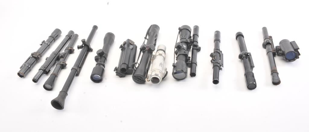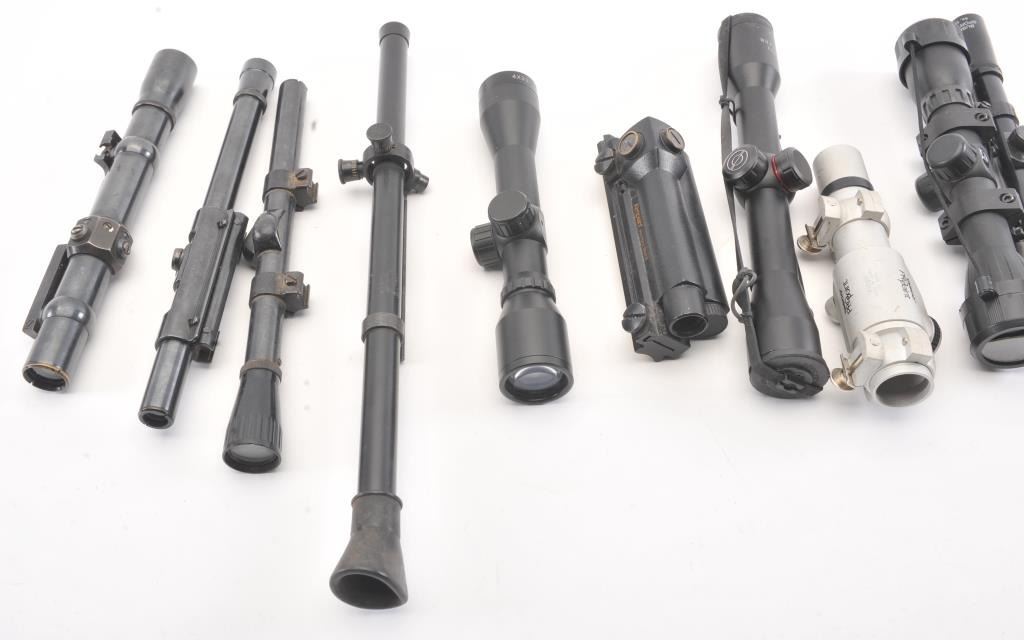 14 various scopes and aiming devices from 1950s El Paso Weaver on mount to current. Various conditions. Good dealer’s bonanza lot. Est.: $250-$500