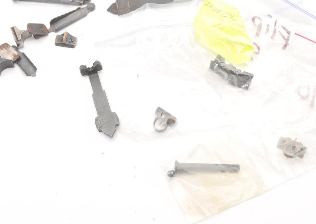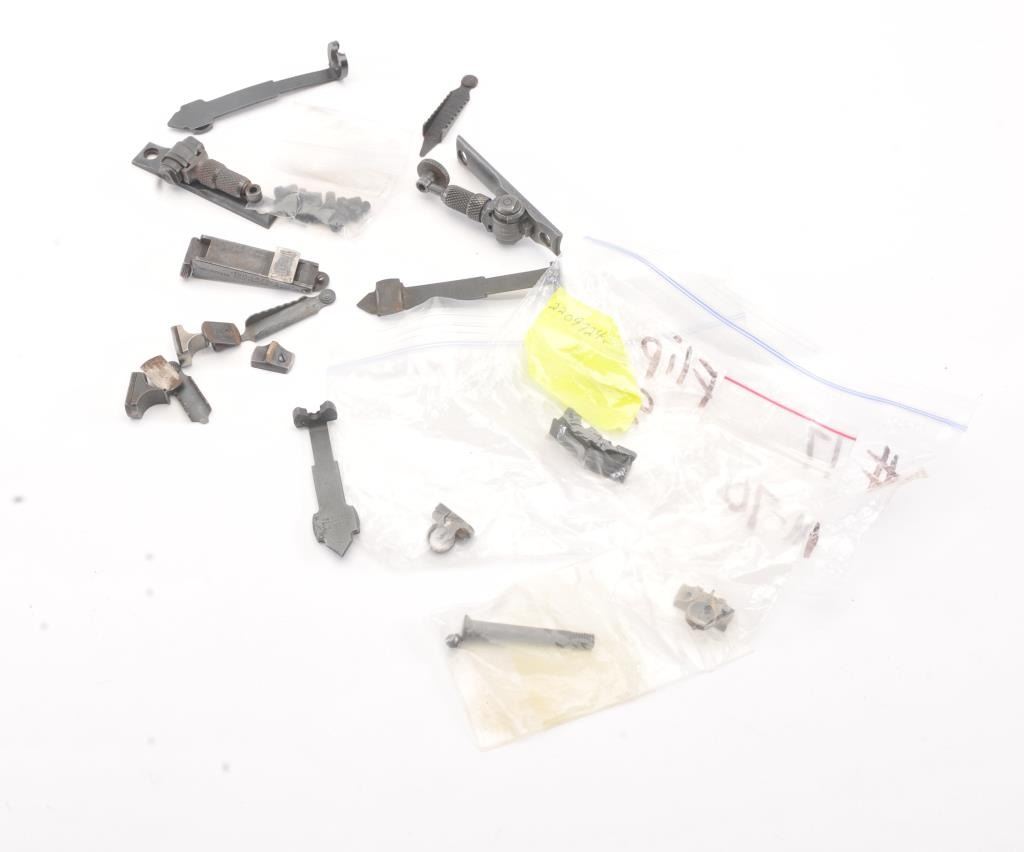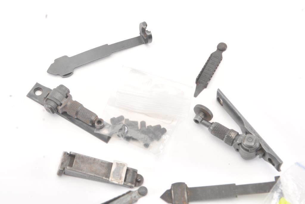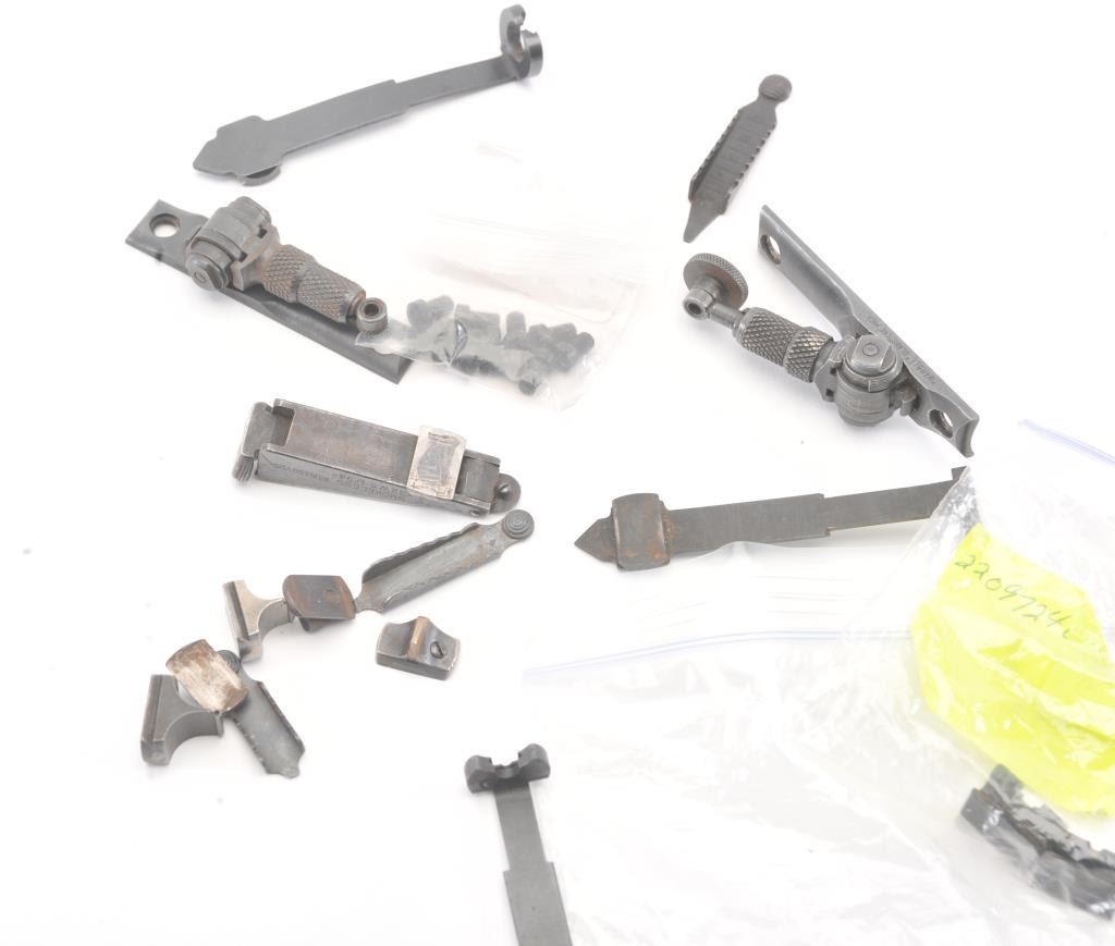 Good lot from old Winchester 92-94 and savage lever action collector consisting of: 1. Winchester .32 special sight. Well marked with 75% finish. 2. 2 Model 70 Winchester flip rear sights.3. 6 front sights. 2 Beech type. 4. 2 Marbles rear sights, 1 unmarked buck horn and 3 various elevators. 5. 2 Marbles tang sights in various conditions. Good to very good plus.A nice and handy lot. Est.: $250-$500
