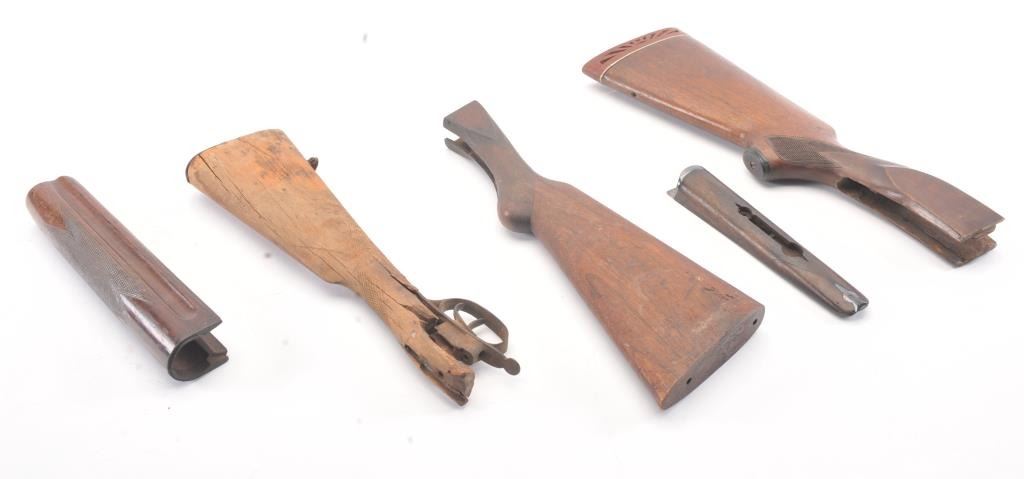 Lot of stocks as described; 1. Browning O/U lightning high quality replacement fore end (No metal). Not fit but finished. Excellent condition 2. Browning O/U Butt stock chipped and piecemissing at the tang. Shortened with long tang and pistol grip. About 13” pull. 3. Winchester Semi-Auto deluxe pistol grip stock probably for Model 63. No butt plate. 7 other vintage shotgun stocks in broken togood condition. Gunsmith’s estate. Est.: $175-$350