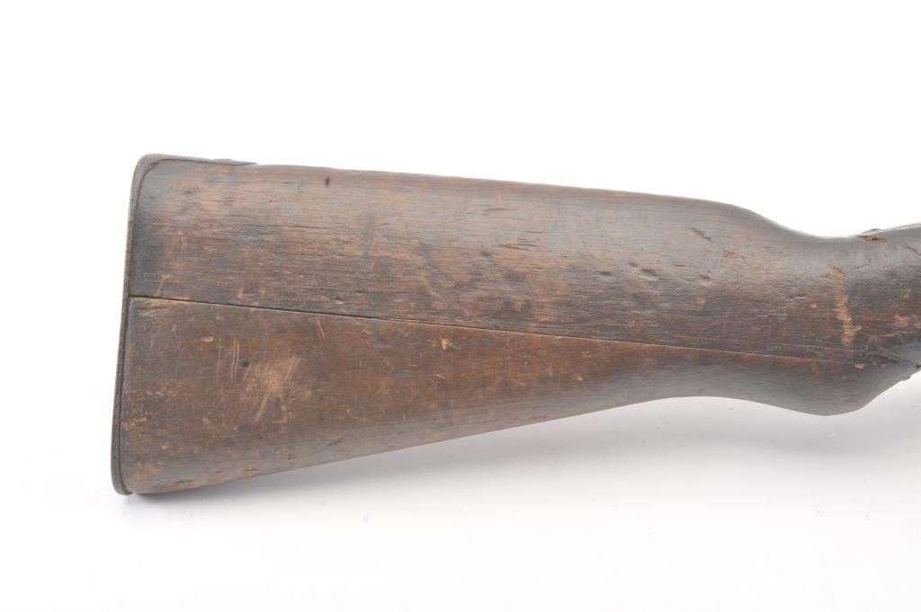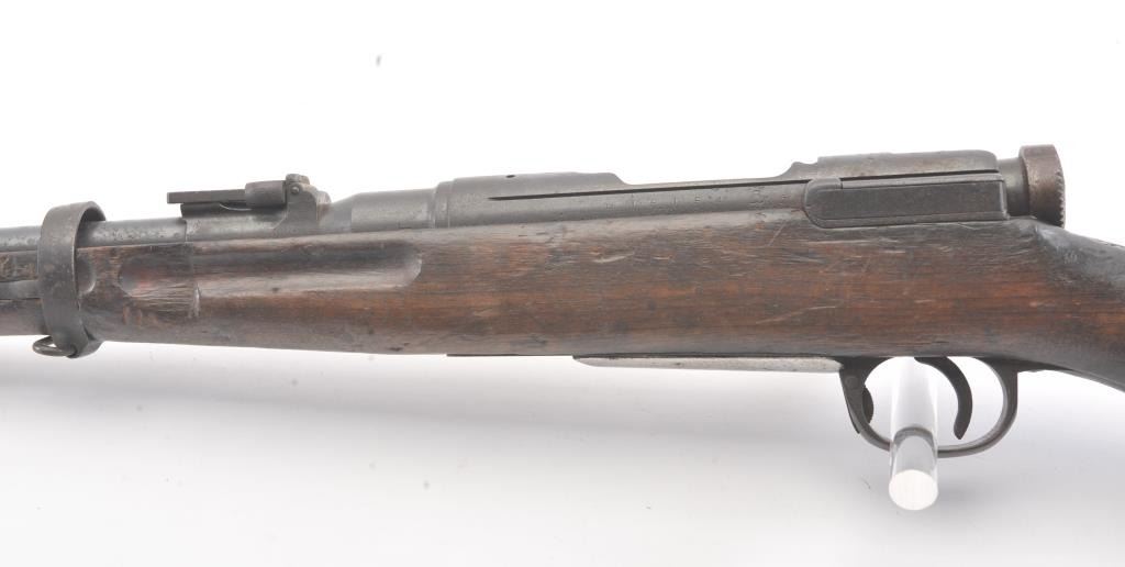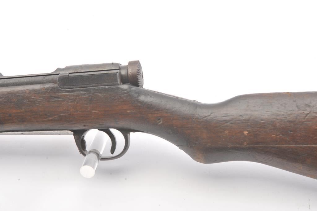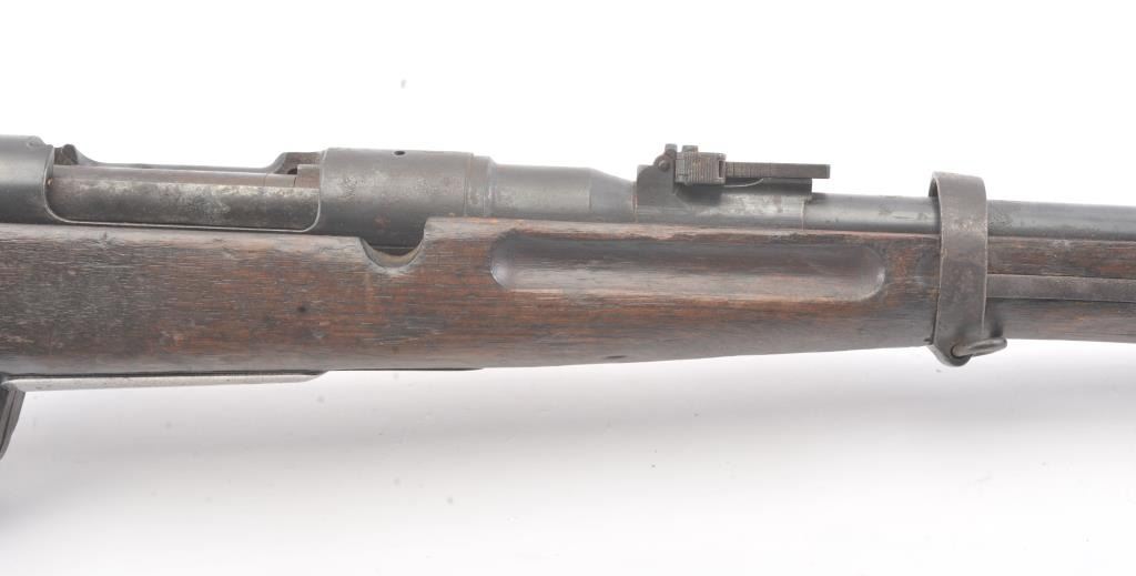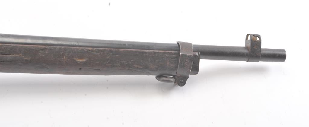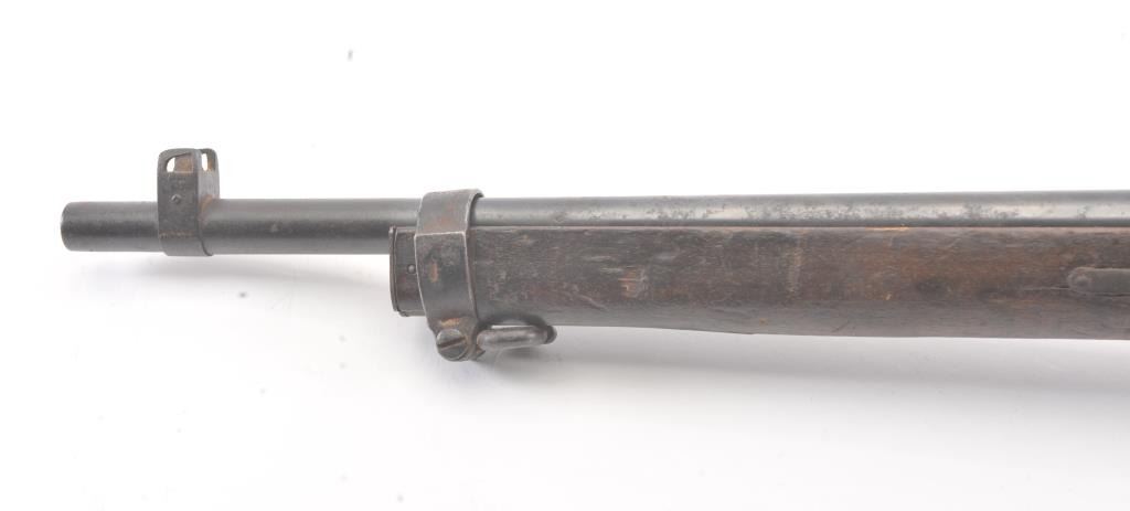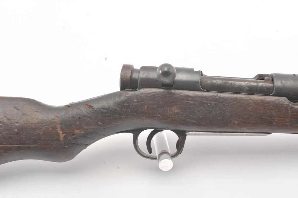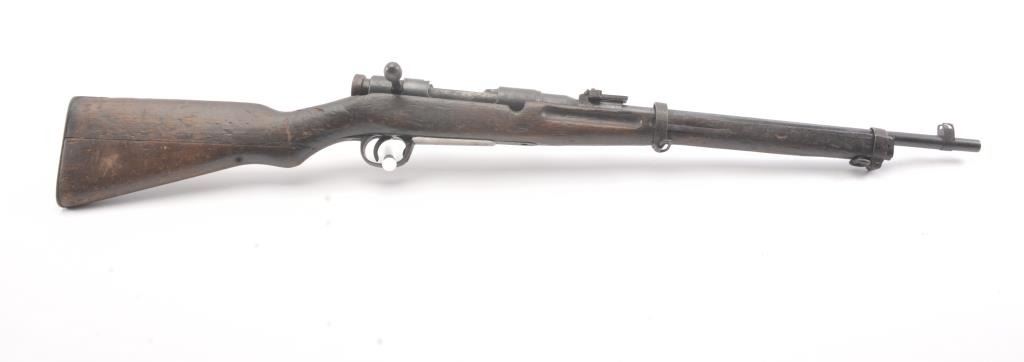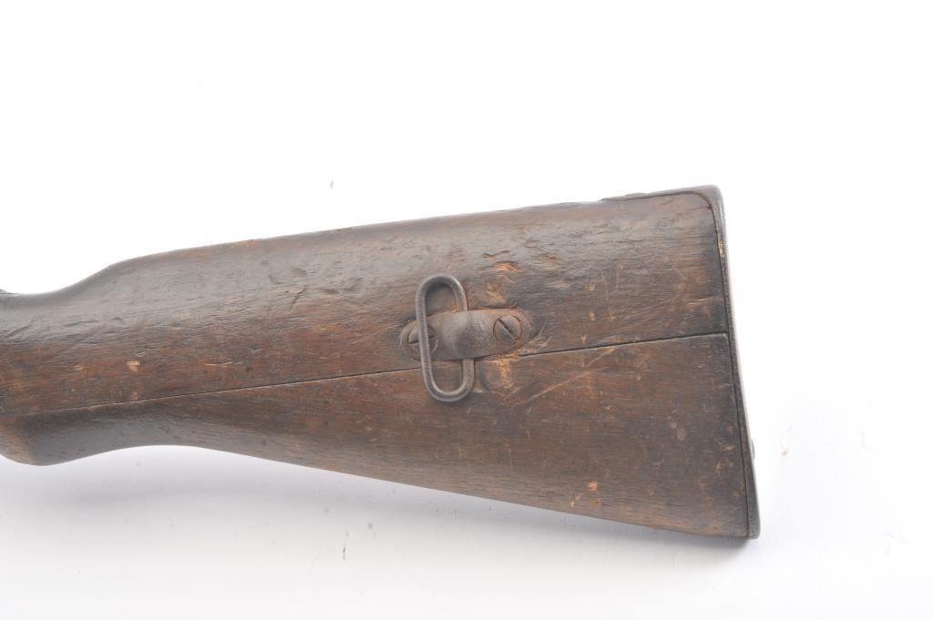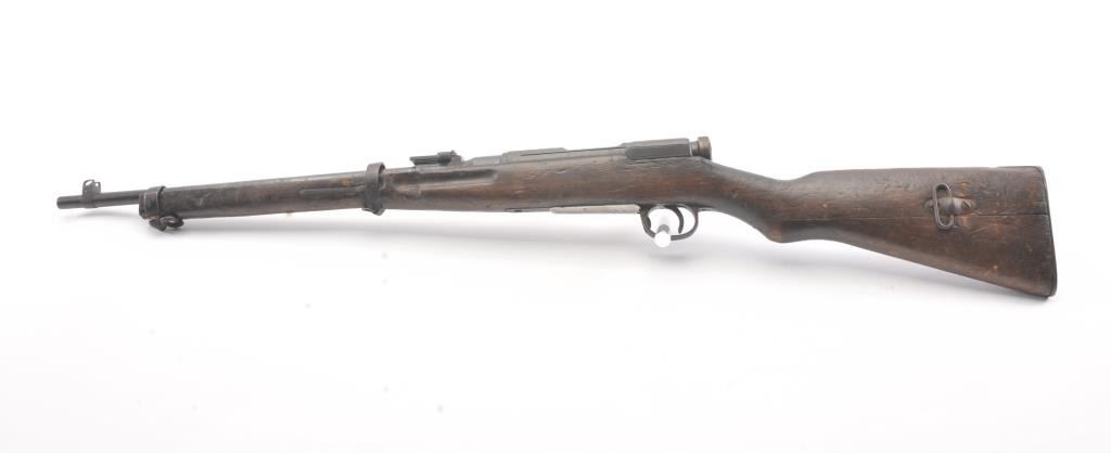 Japanese Type 38 carbine in 6.5 caliber with mum visible and upper hand guard removed. Uncleaned bring back condition from local estate with 50%+ blue mixed with patina. Numerous dings, mars and screw missingelevator and spring. Need minor restorations. (C&R) Est.: $175-$350